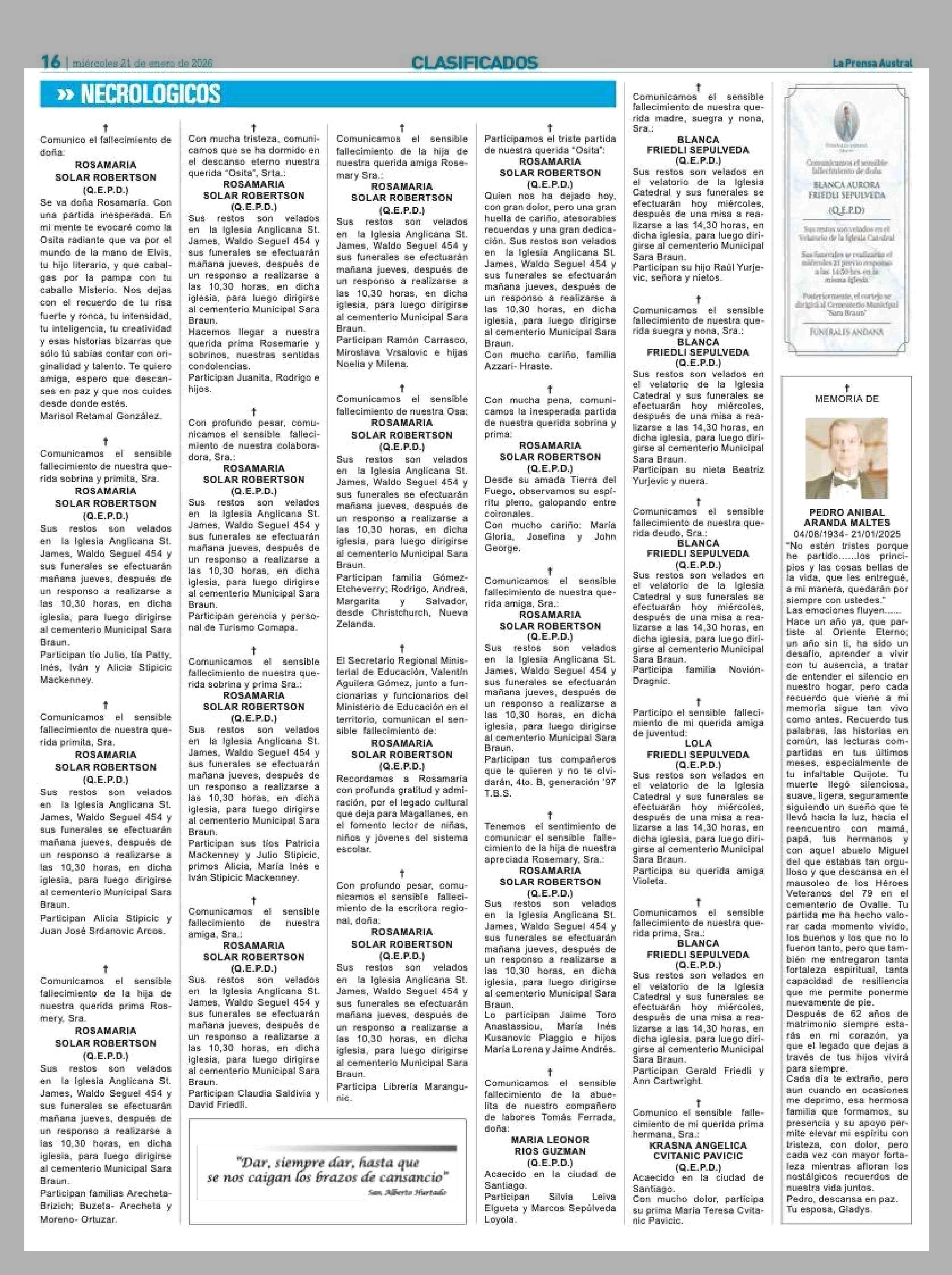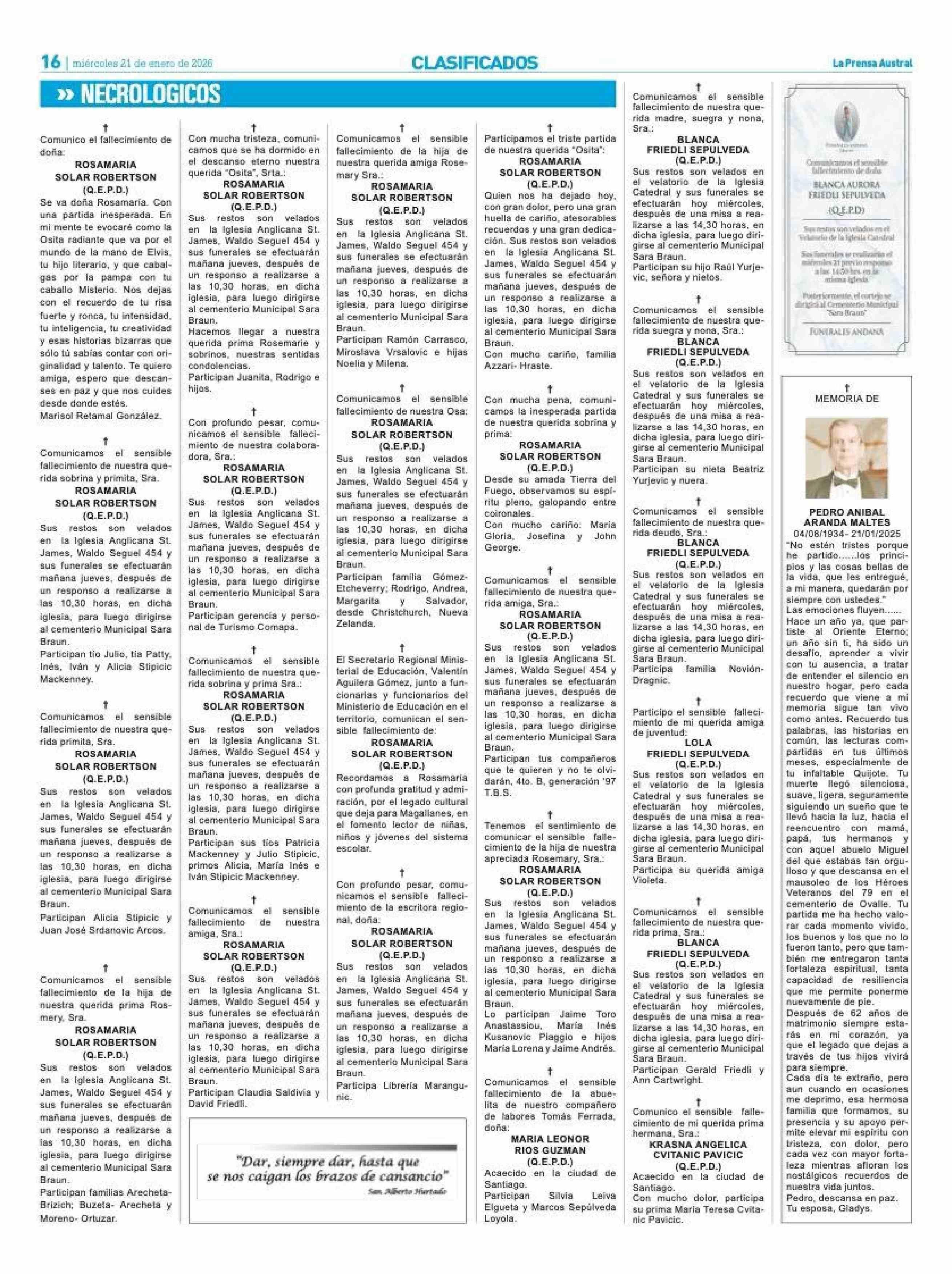 NECROLOGICOS 21-01-2026 La Prensa Austral |