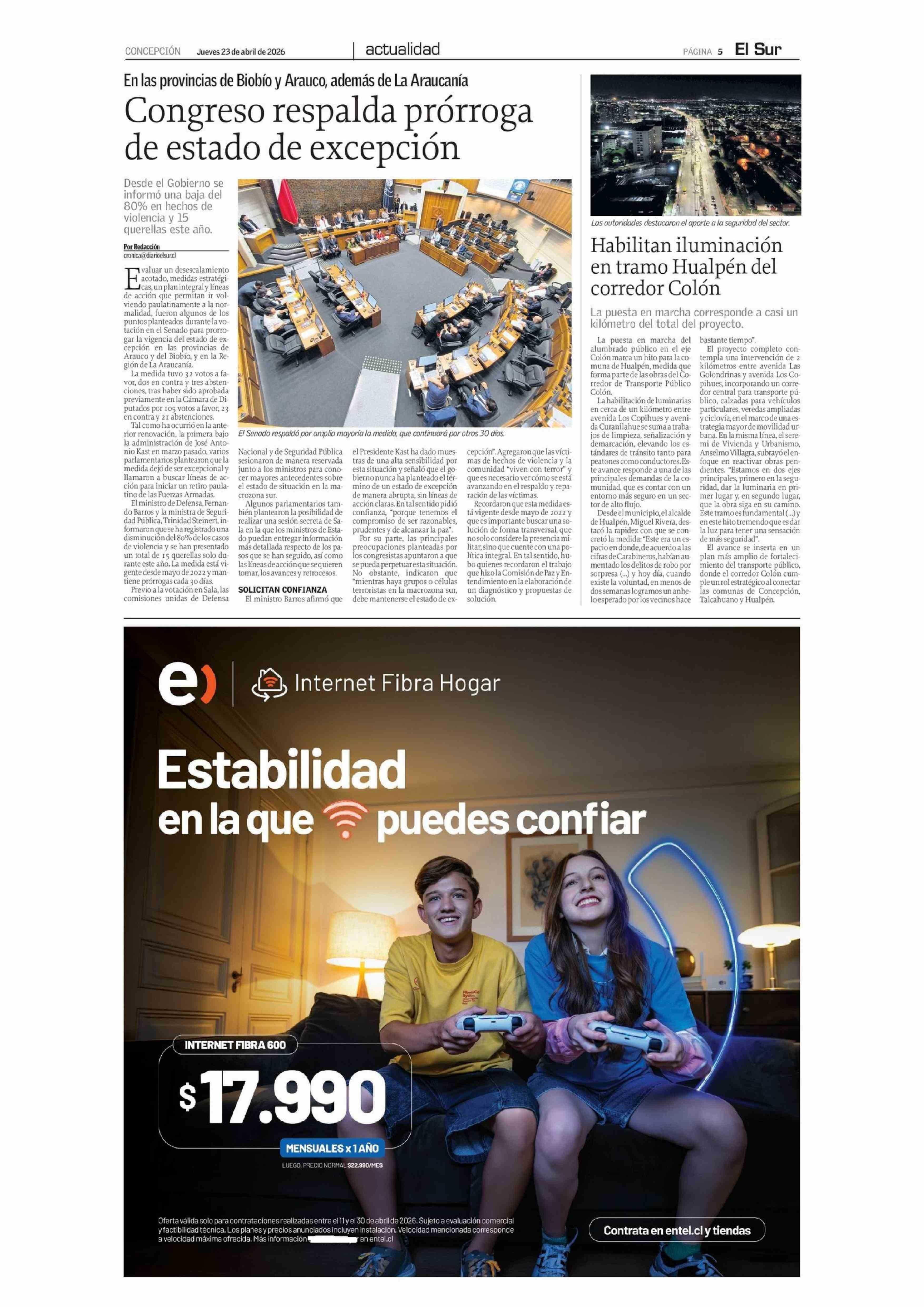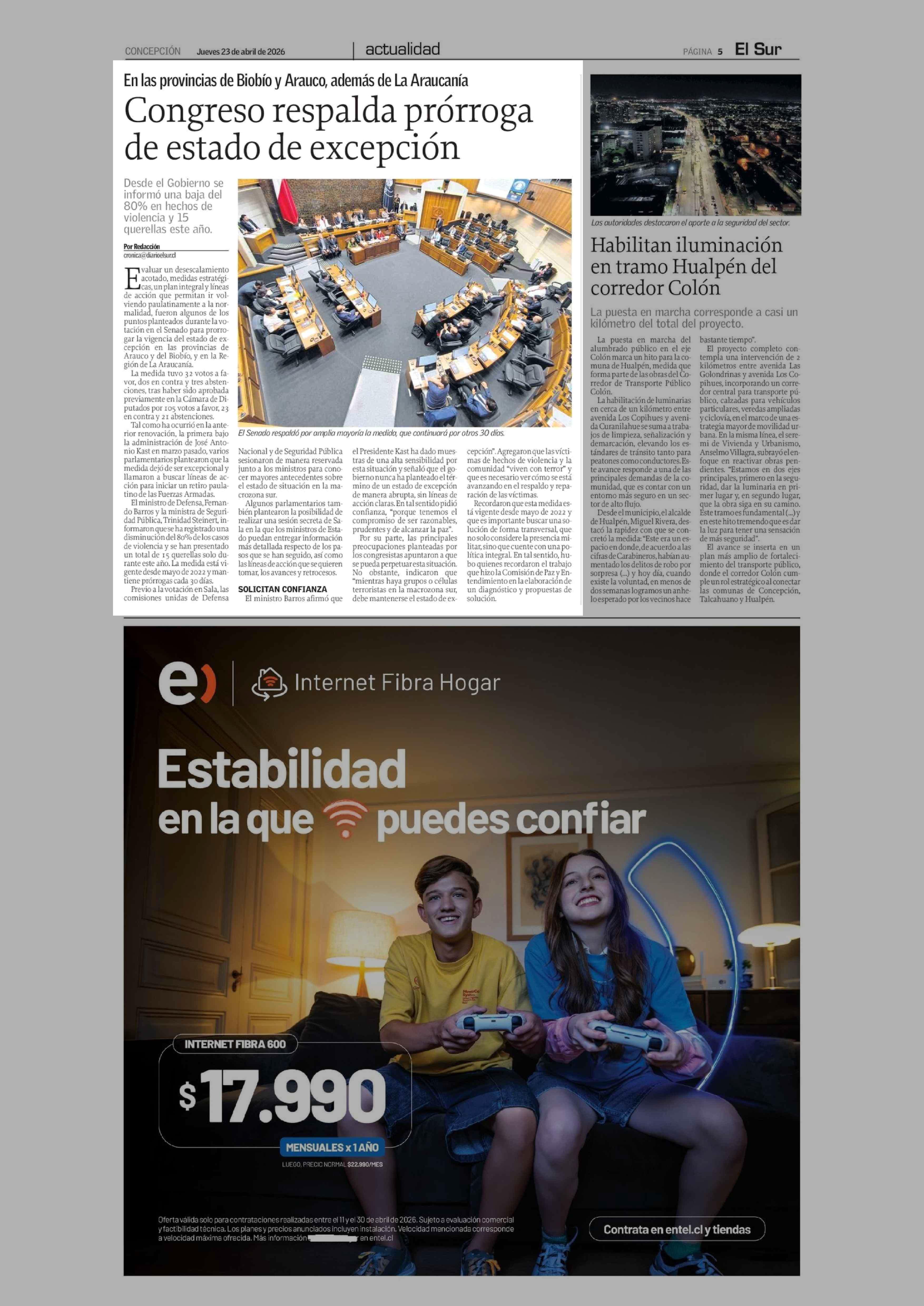 Congreso respalda prórroga de estado de excepción 23-04-2026 El Sur |