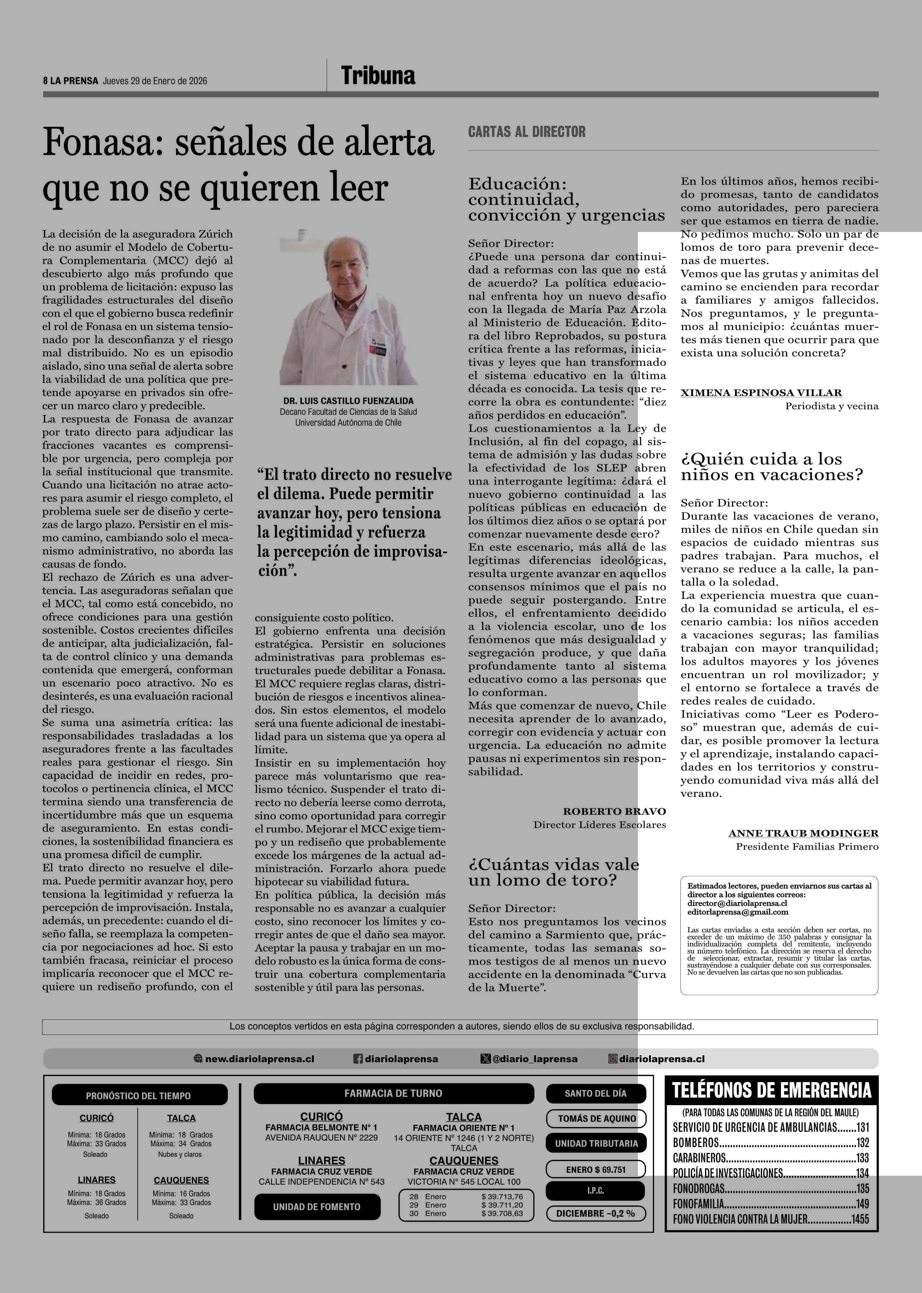Cartas: Educación: continuidad, convicción y urgencias 29-01-2026 La Prensa de Curicó |