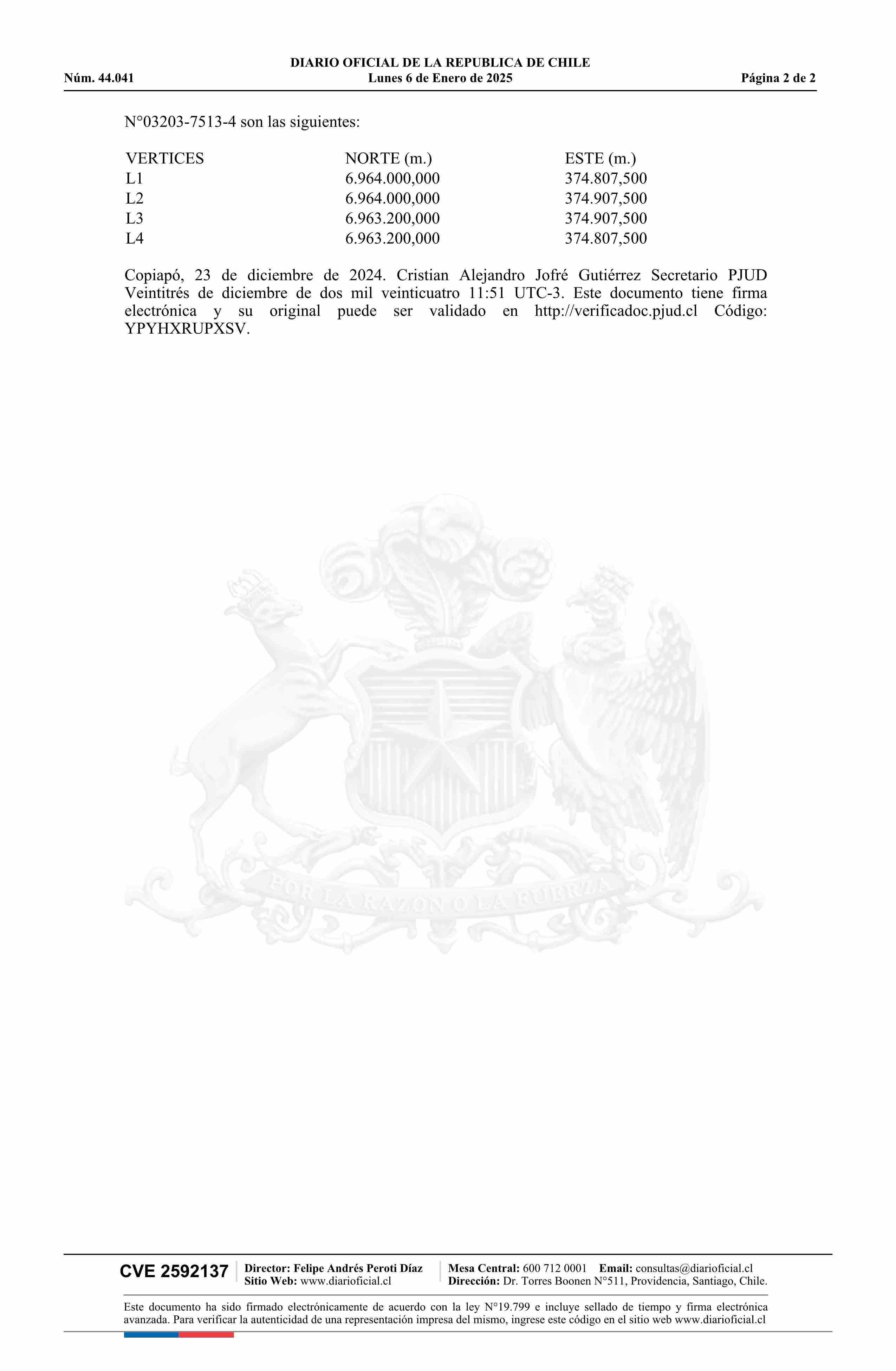 | Fuente: | DIARIO OFICIAL CHILE - BOLETÍN OFICIAL DE MINERÍA (DIARIO OFICIAL CHILE – BOM – EXTRACTOS ARTÍCULO 83) | Página(s): | 1-2 |
