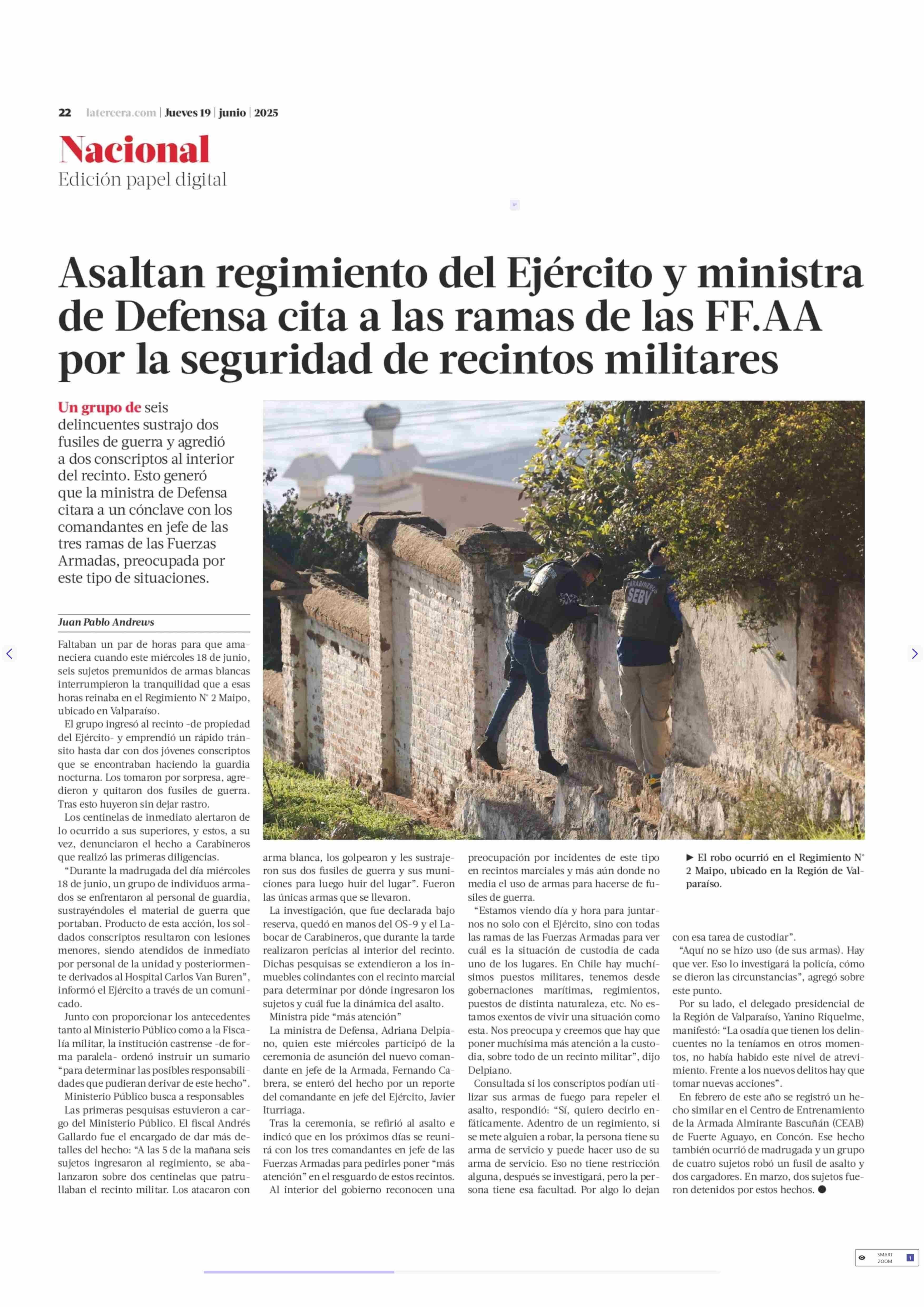 Asaltan regimiento del Ejército y ministra de Defensa cita a las ramas de las FF.AA por la seguridad de recintos militares 19-06-2025 La Tercera |