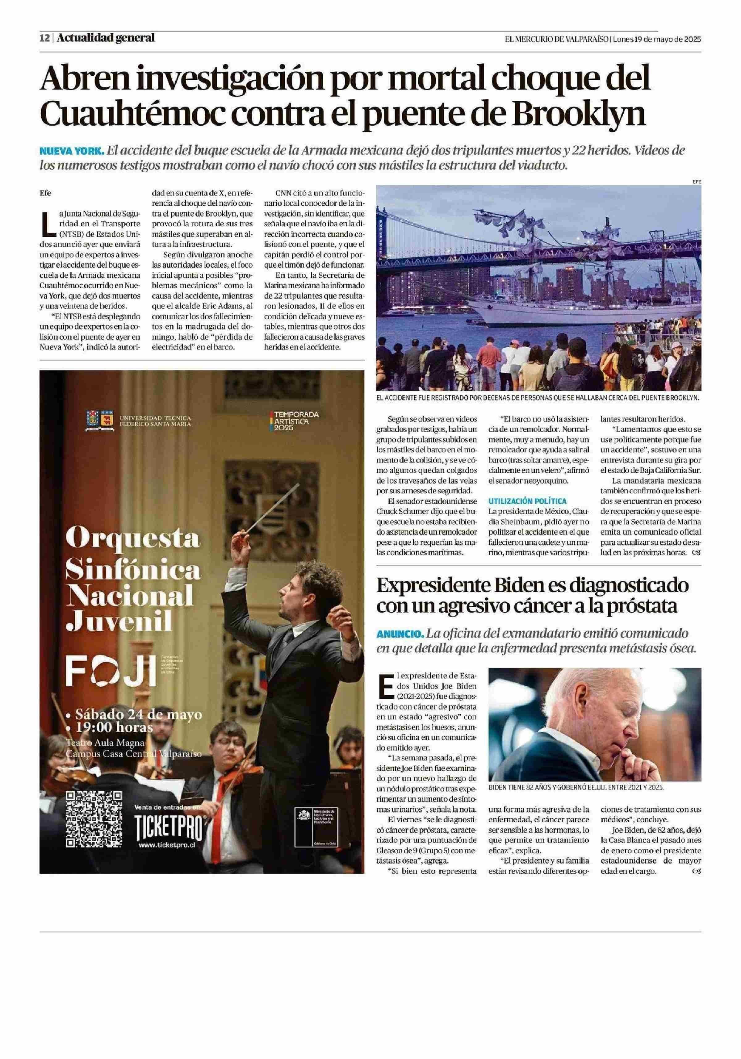 Expresidente Biden es diagnosticado con un agresivo cáncer a la próstata 19-05-2025 El Mercurio de Valparaíso |
