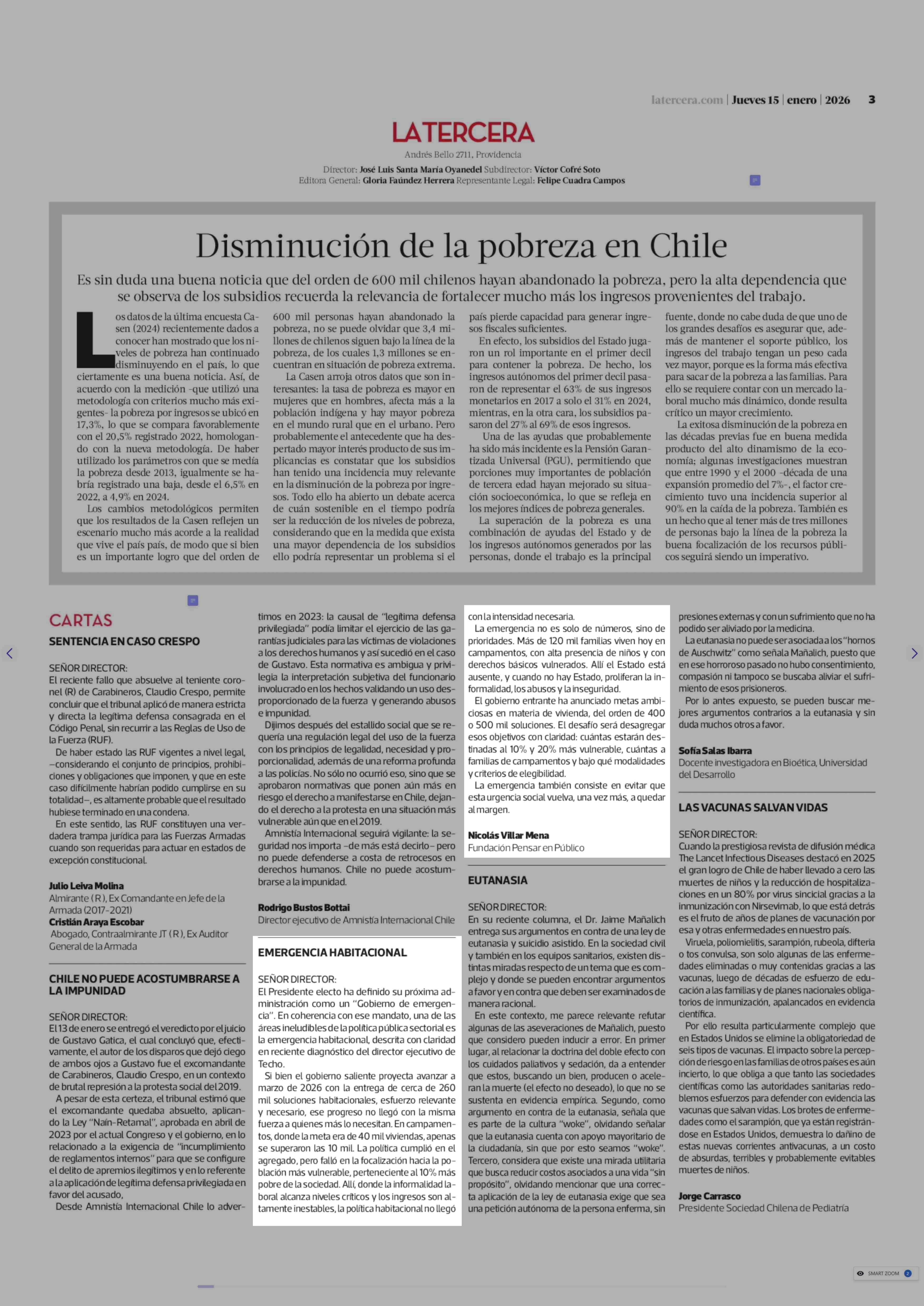 Cartas: EMERGENCIA HABITACIONAL 15-01-2026 La Tercera |