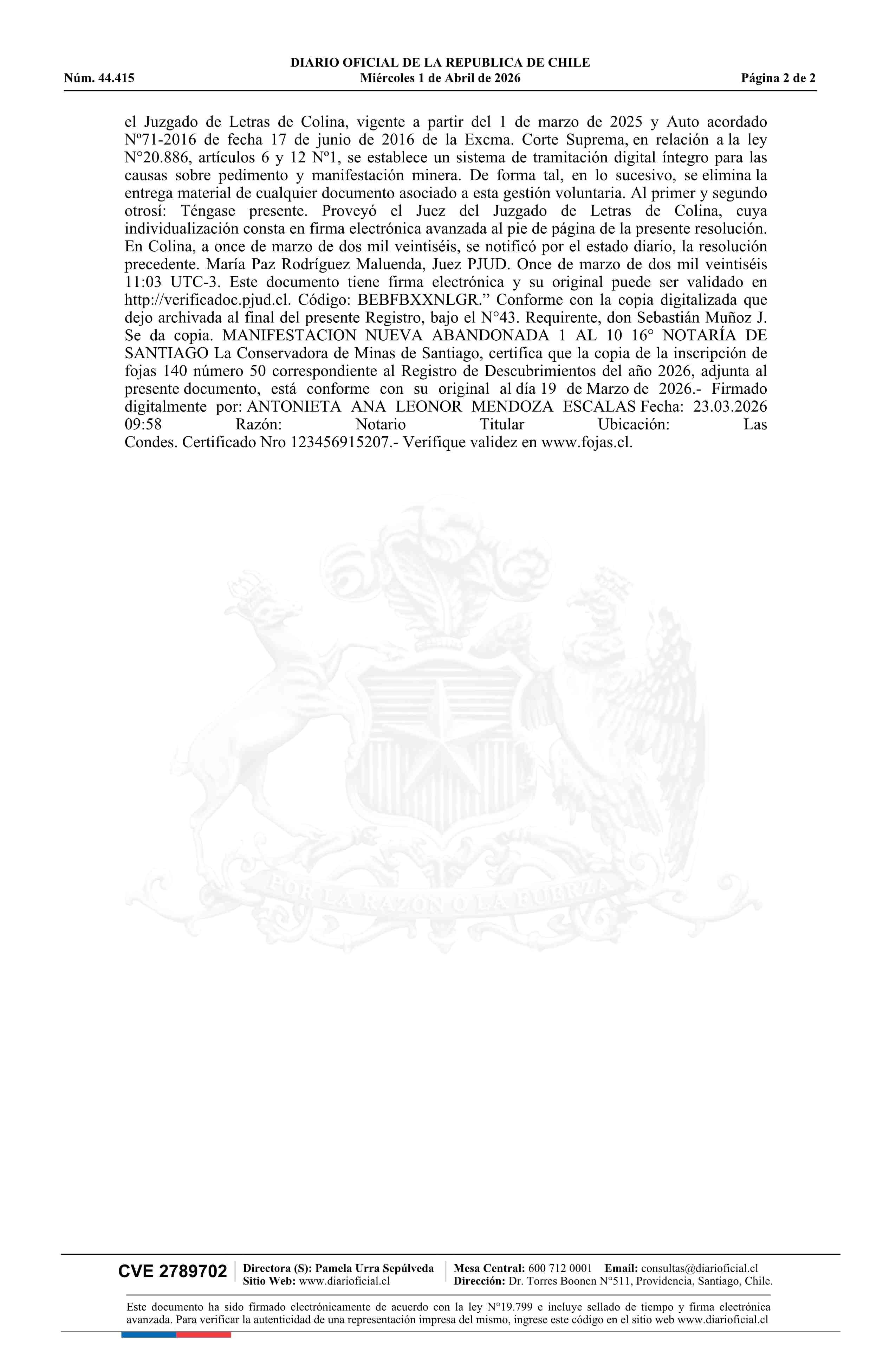 NUEVA ABANDONADA 1 AL 10 / Olivares Arancibia Nelson Enrique 01-04-2026 DIARIO OFICIAL CHILE - BOLETÍN OFICIAL DE MINERÍA |