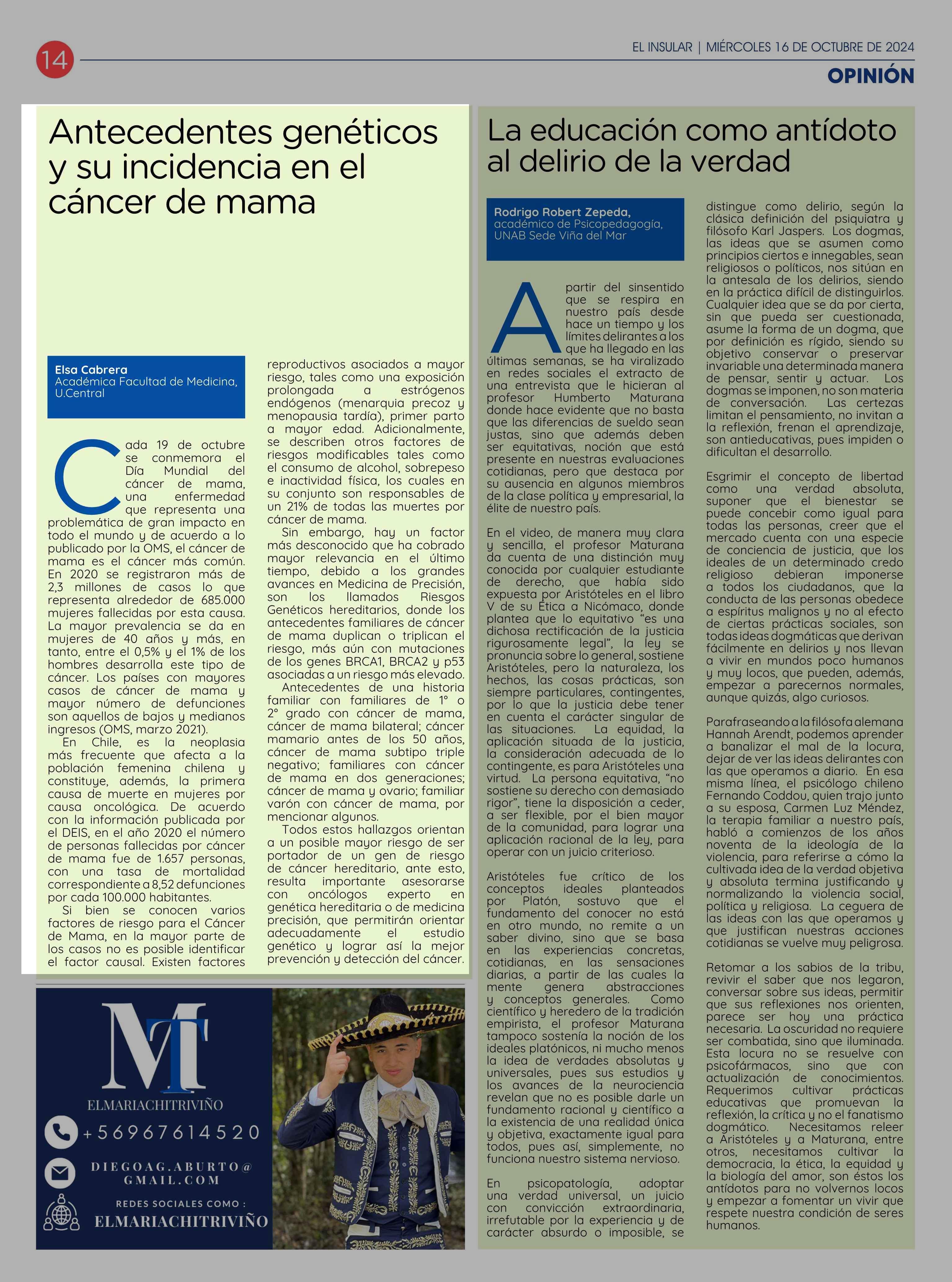 COLUMNAS DE OPINIÓN: Antecedentes genéticos y su incidencia en el cáncer de mama 16-10-2024 El Insular |