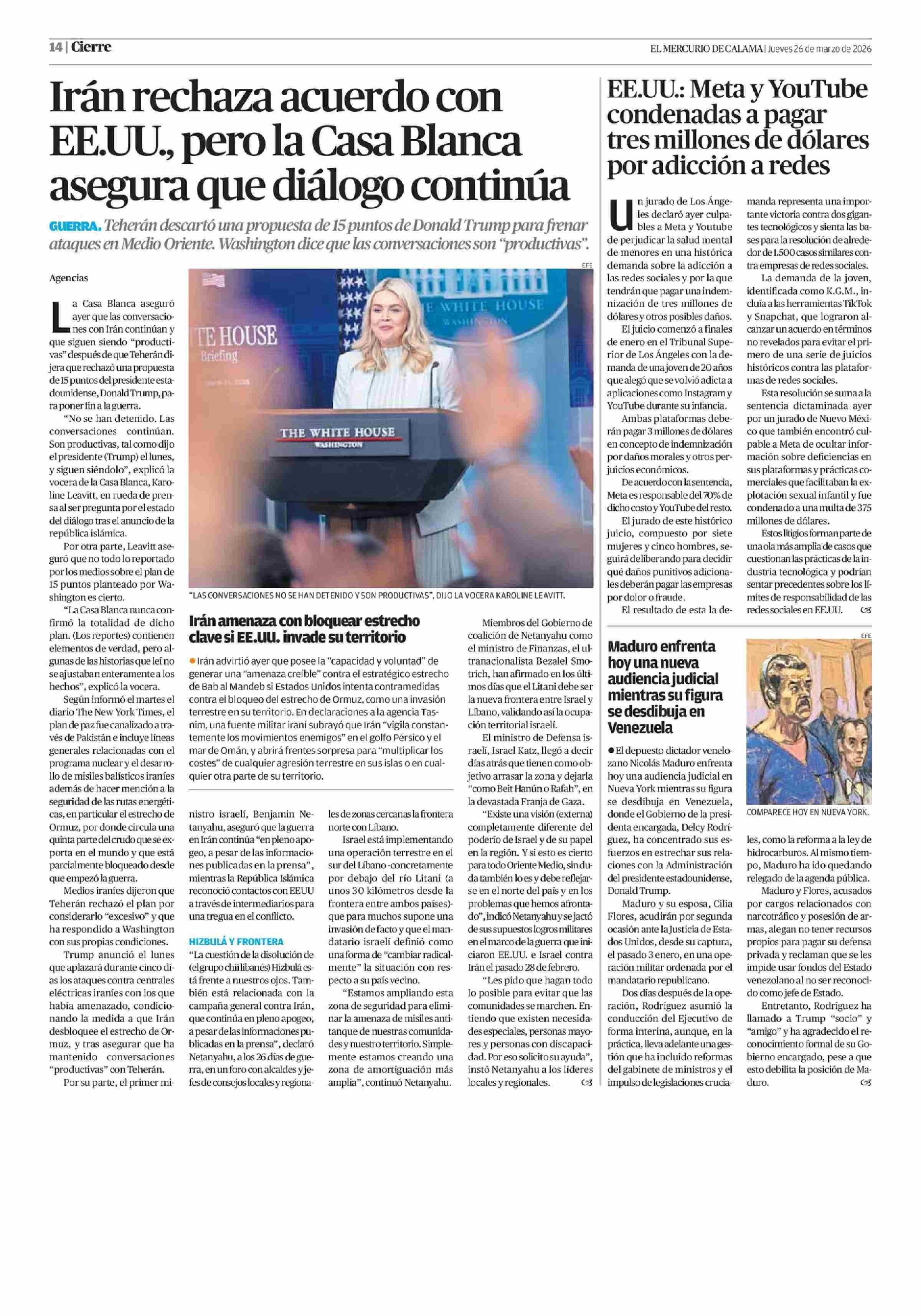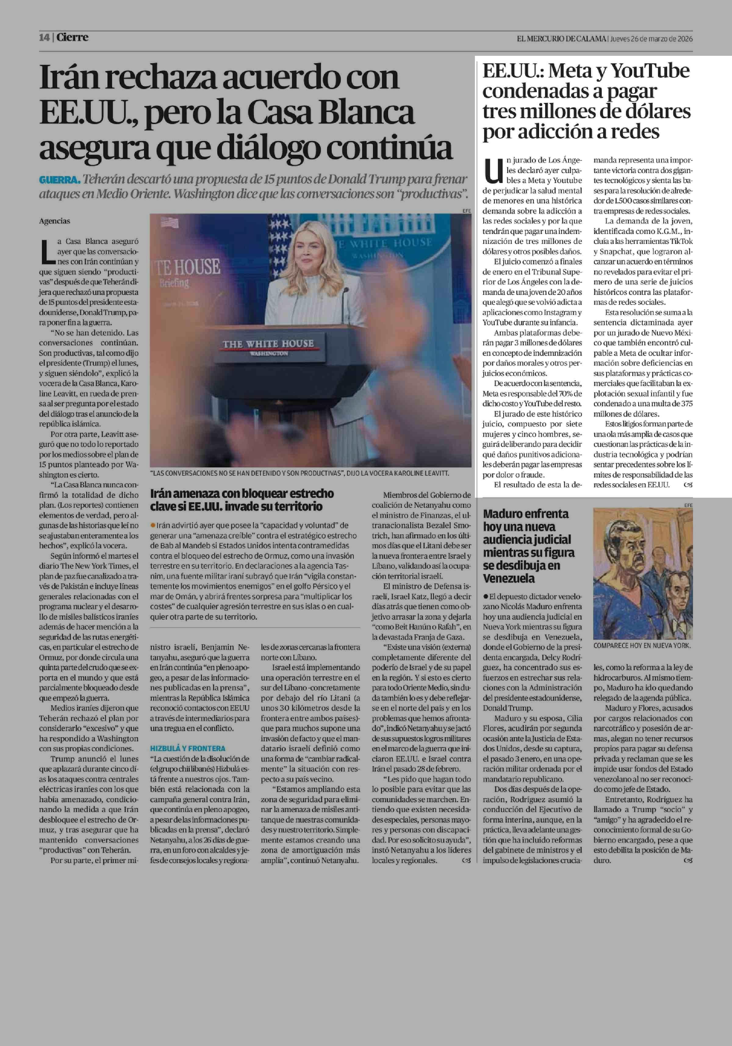 EE.UU.: Meta y YouTube condenadas a pagar tres millones de dólares por adicción a redes 26-03-2026 El Mercurio de Calama |