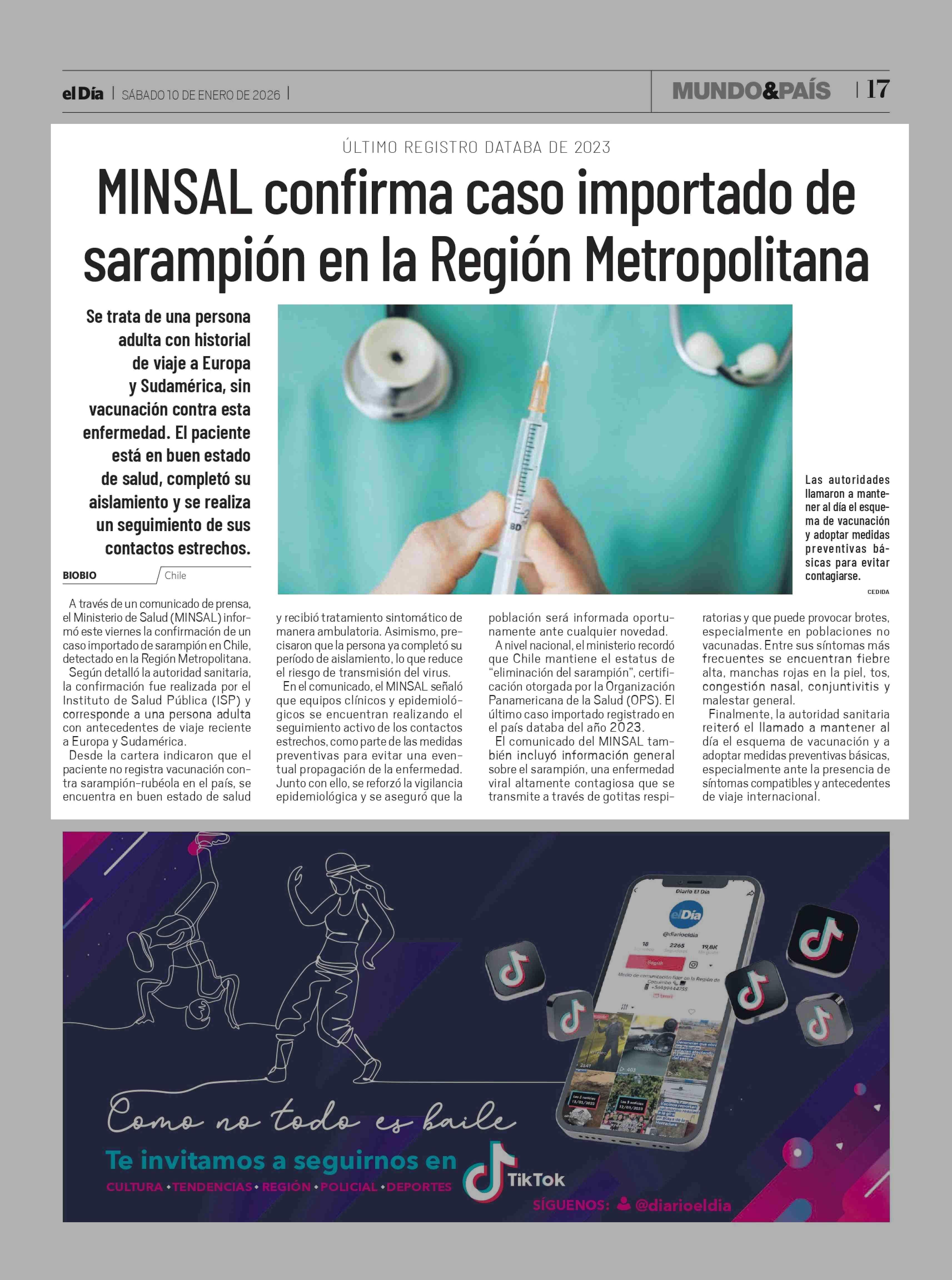 MINSAL confirma caso importado de sarampión en la Región Metropolitana 10-01-2026 El Día |