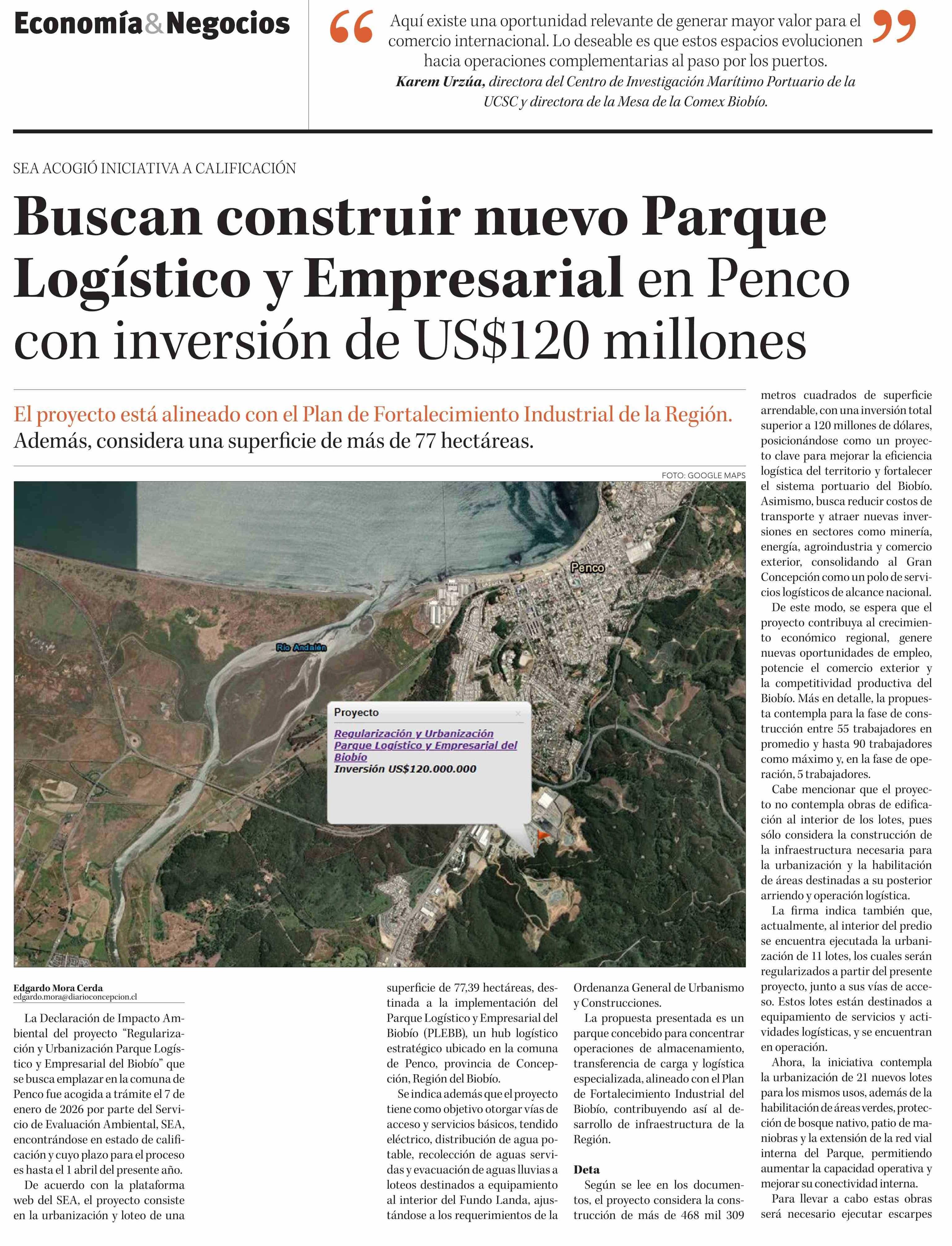 Buscan construir nuevo Parque Logístico y Empresarial en Penco con inversión de US$120 millones 13-01-2026 Diario Concepción |