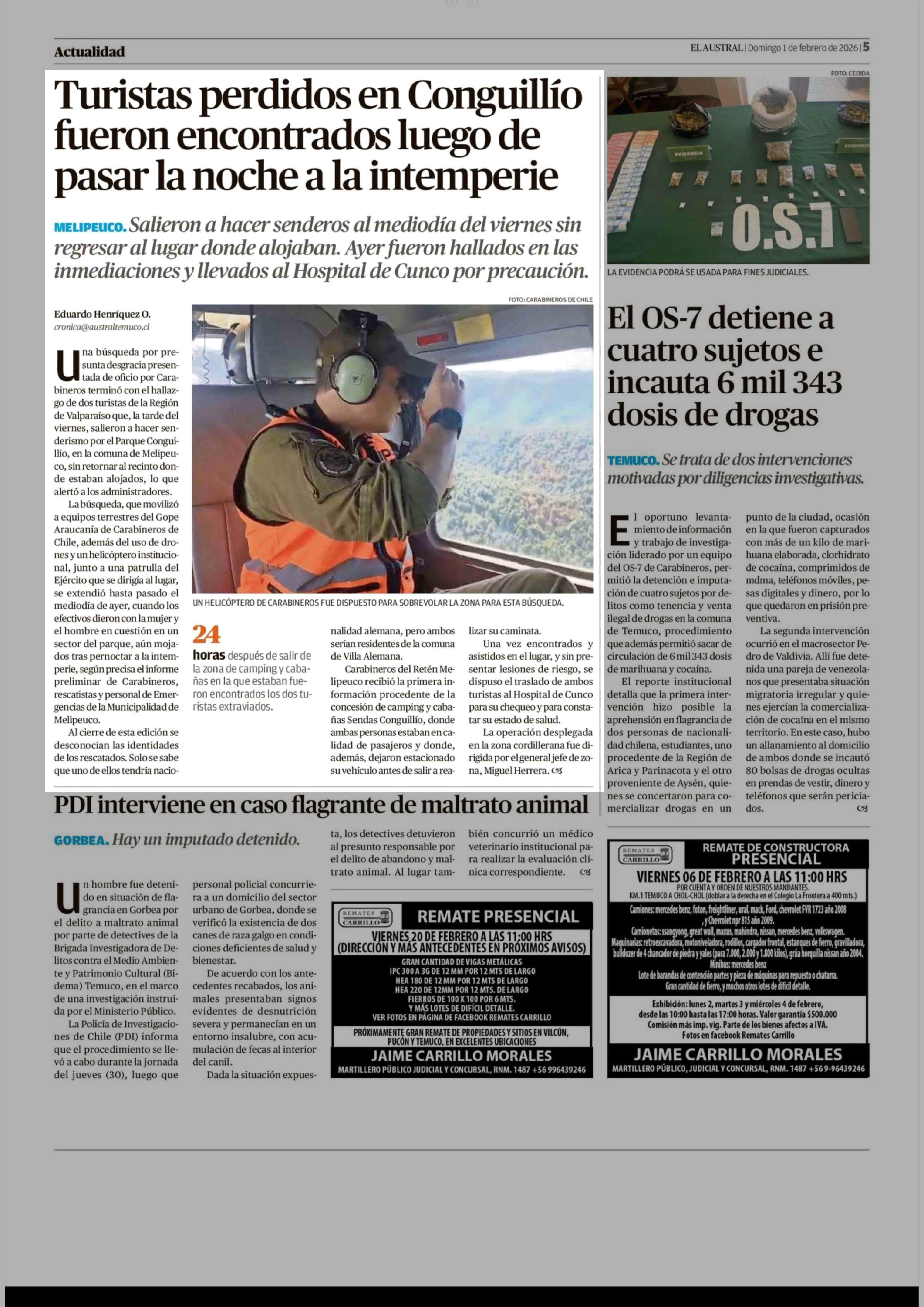 Turistas perdidos en Conguillío fueron encontrados luego de pasar la noche a la intemperie 01-02-2026 El Austral de la Araucanía |