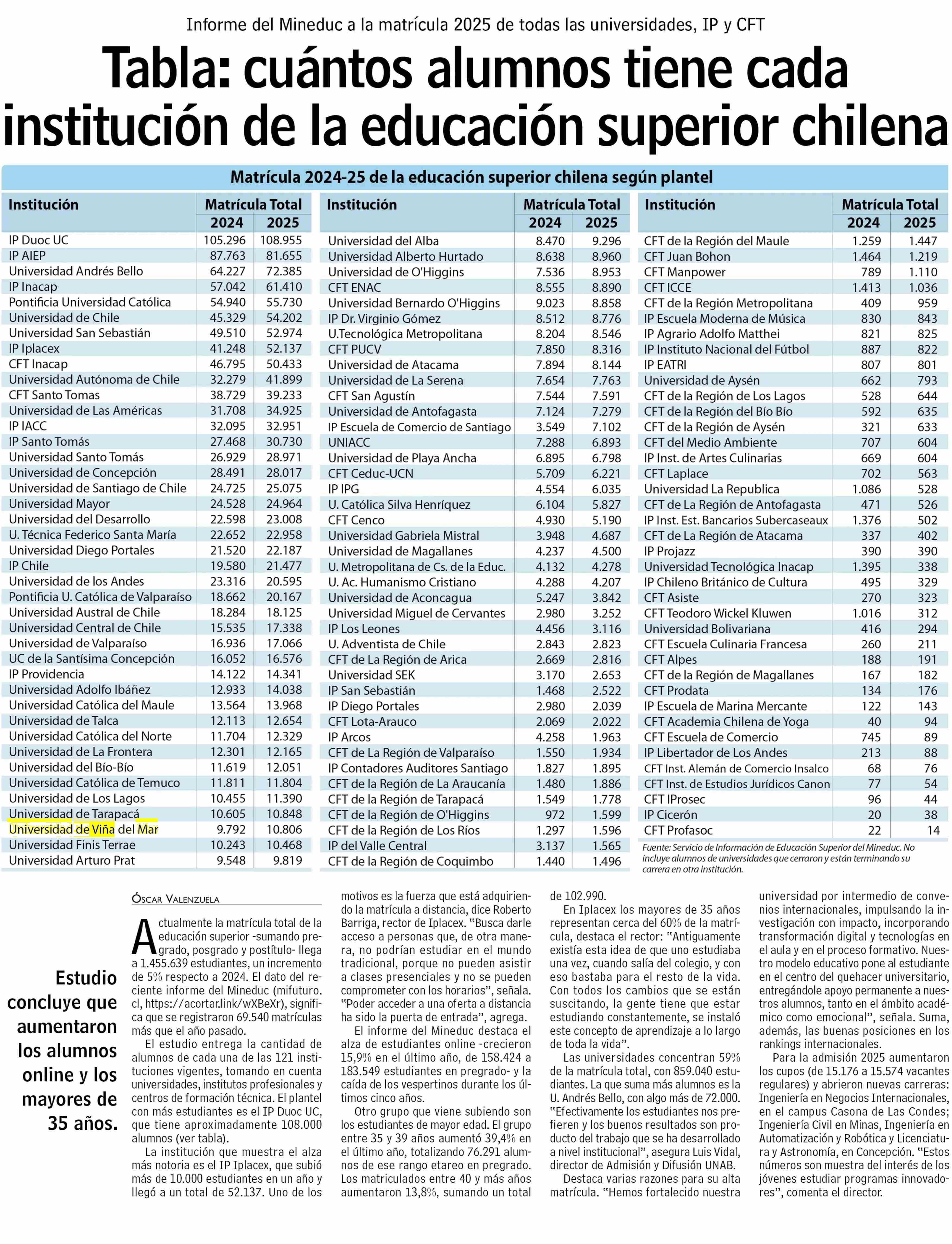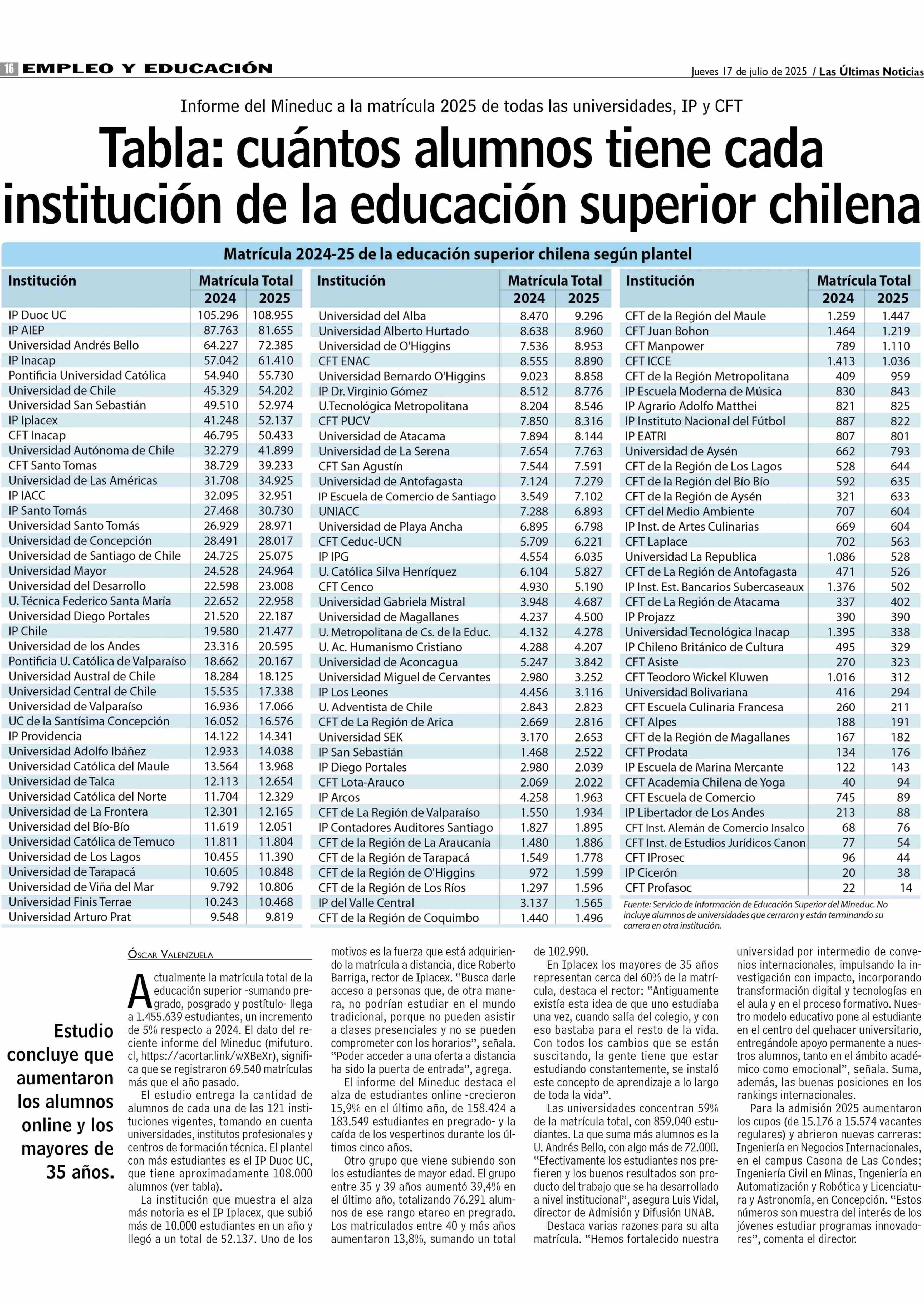 Tabla: cuántos alumnos tiene cada institución de la educación superior chilena 17-07-2025 Las Últimas Noticias |