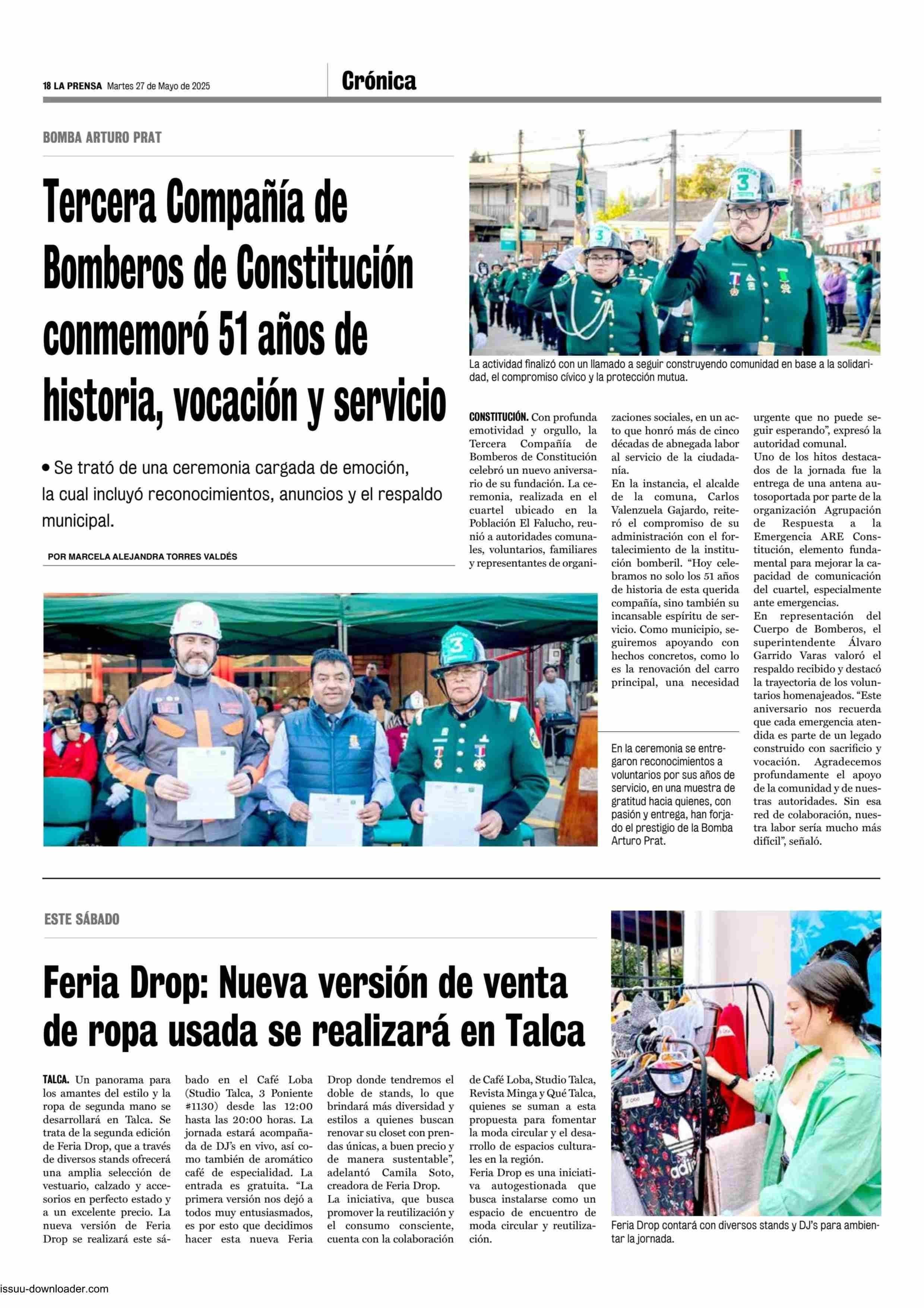 Tercera Compañía de Bomberos de Constitución conmemoró 51 años de historia, vocación y servicio 27-05-2025 La Prensa de Curicó |