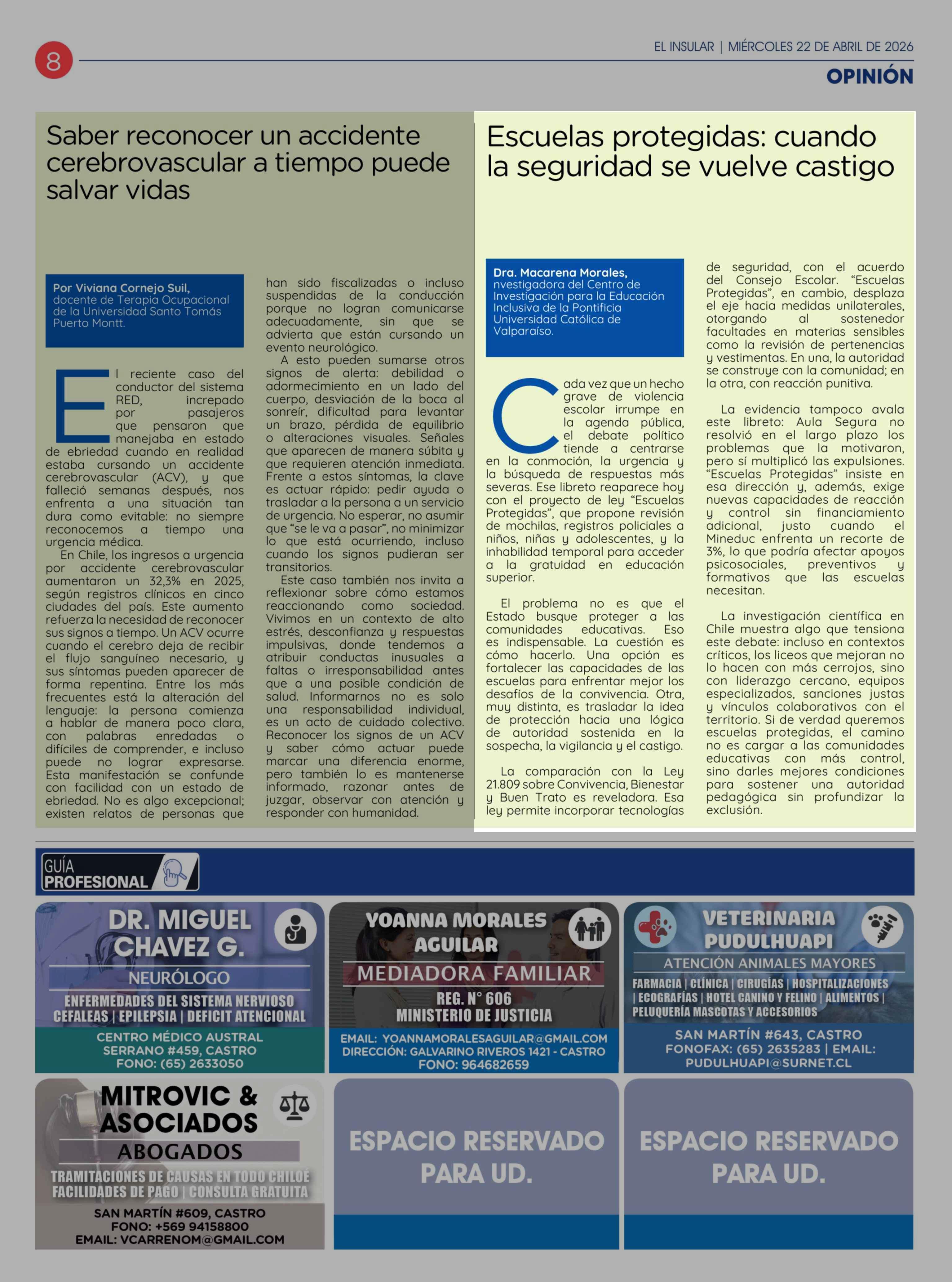 Columnas de Opinión: Escuelas protegidas: cuando la seguridad se vuelve castigo 22-04-2026 El Insular |