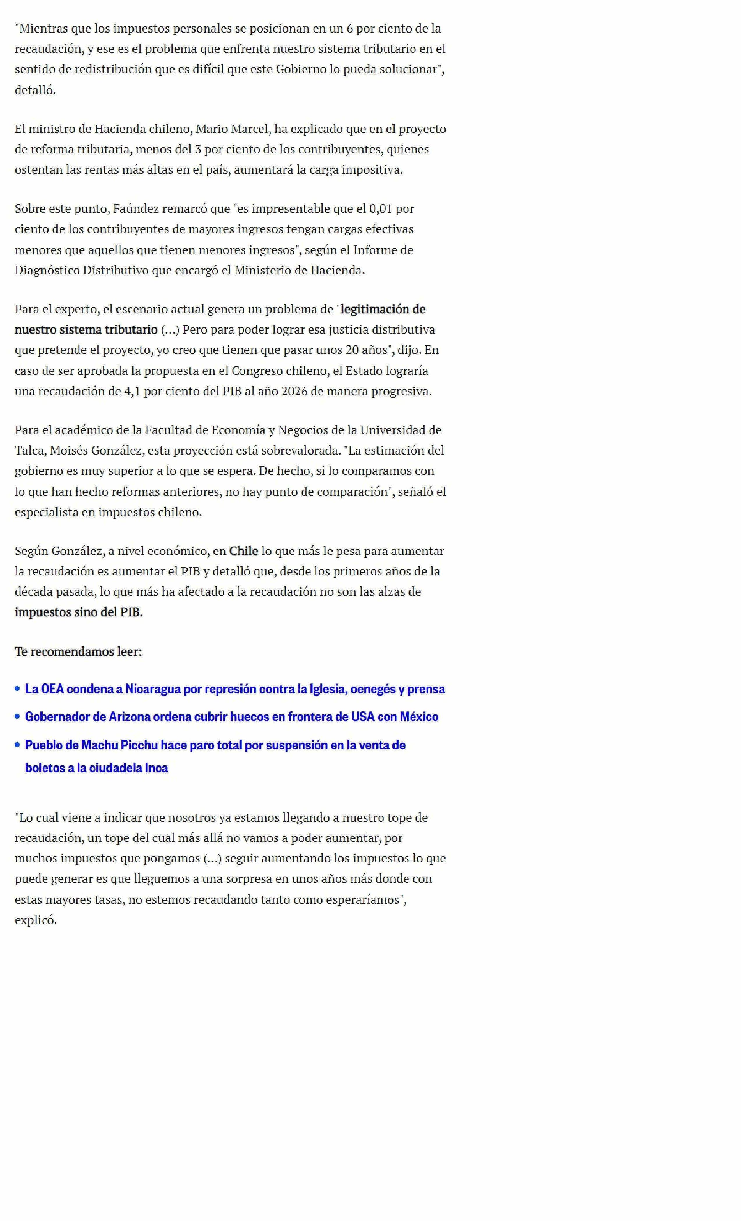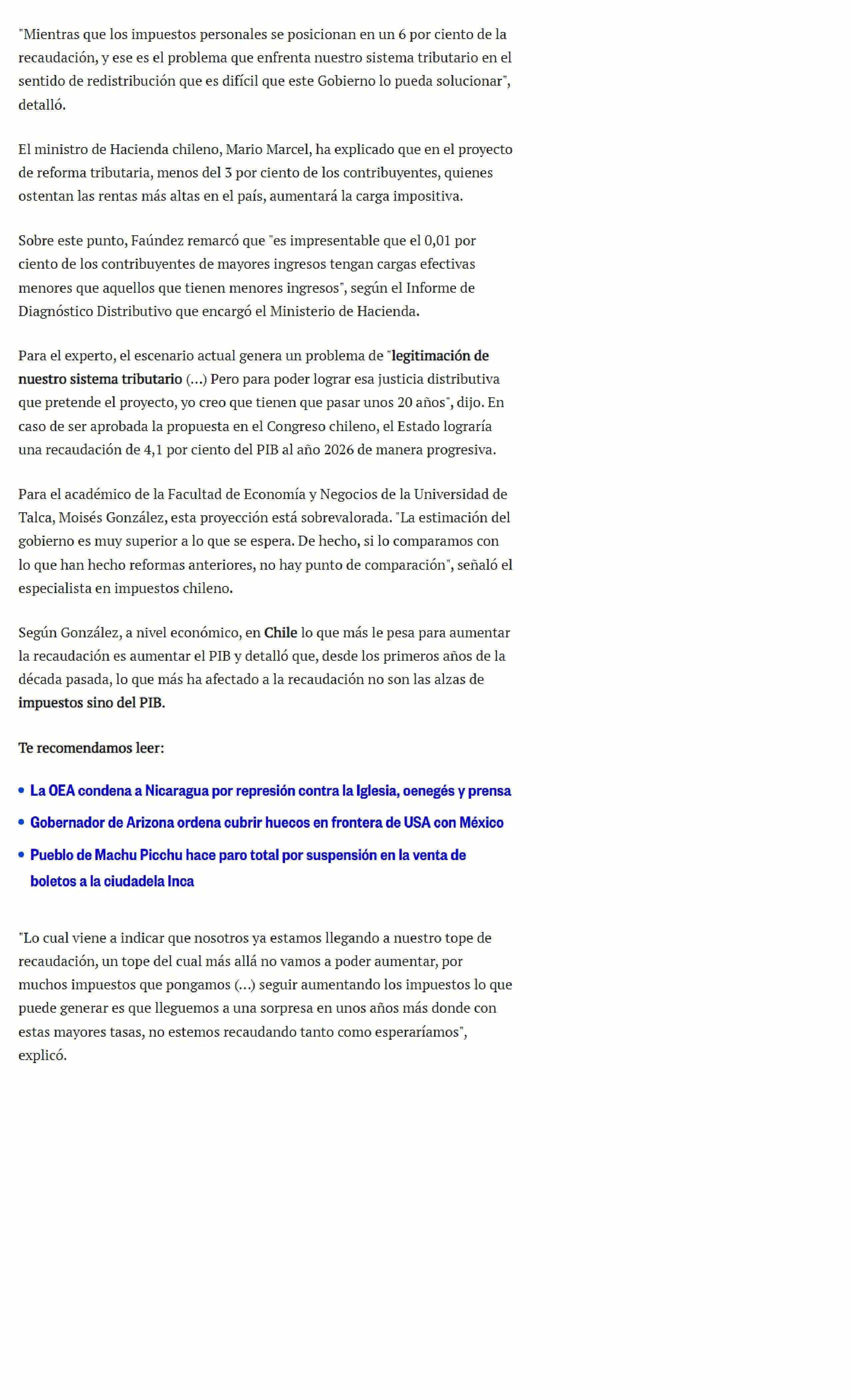 | Título: | Expertos celebran reforma tributaria de Chile pero advierten proyección sobredimensionada de recaudación del PIB |
