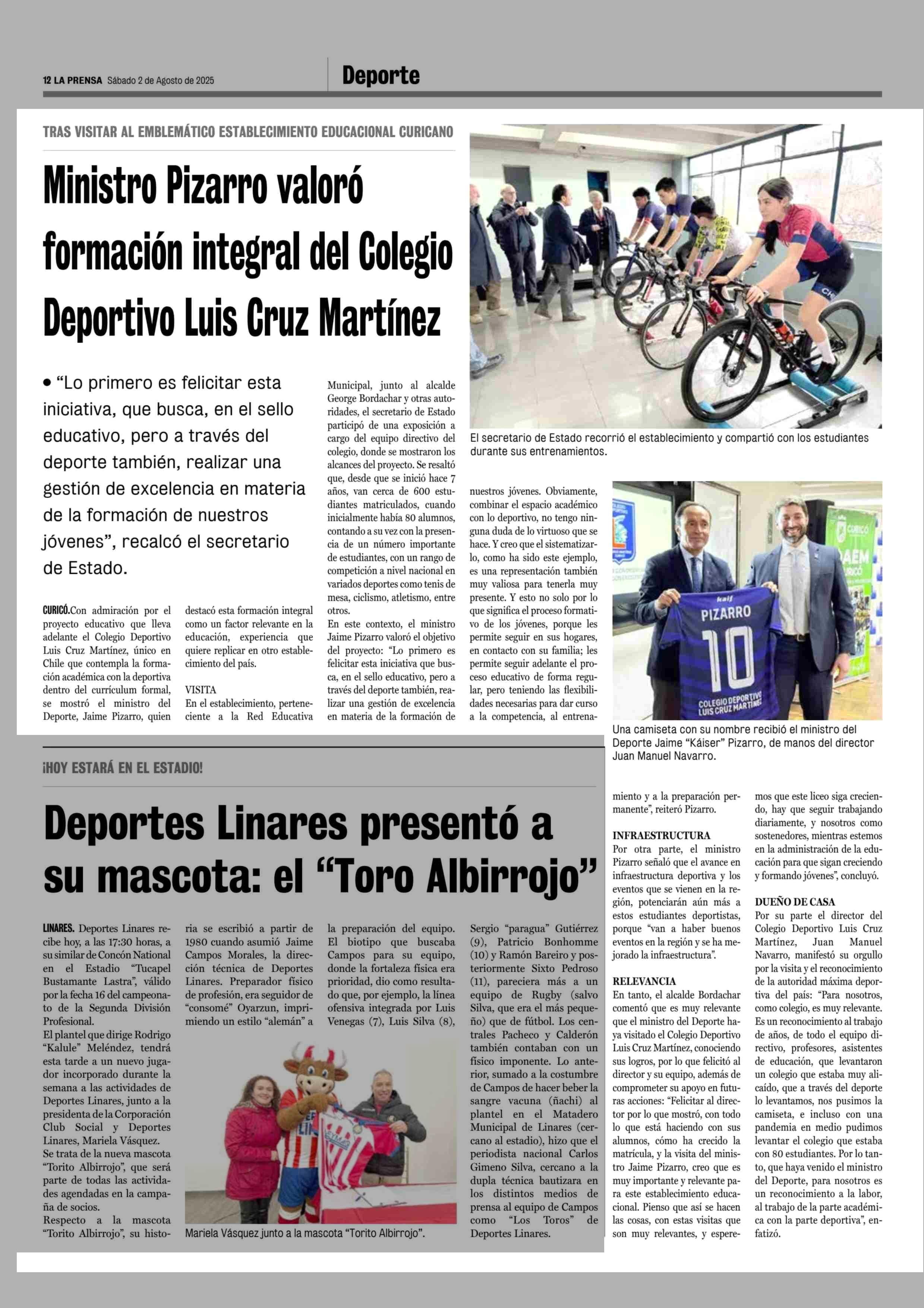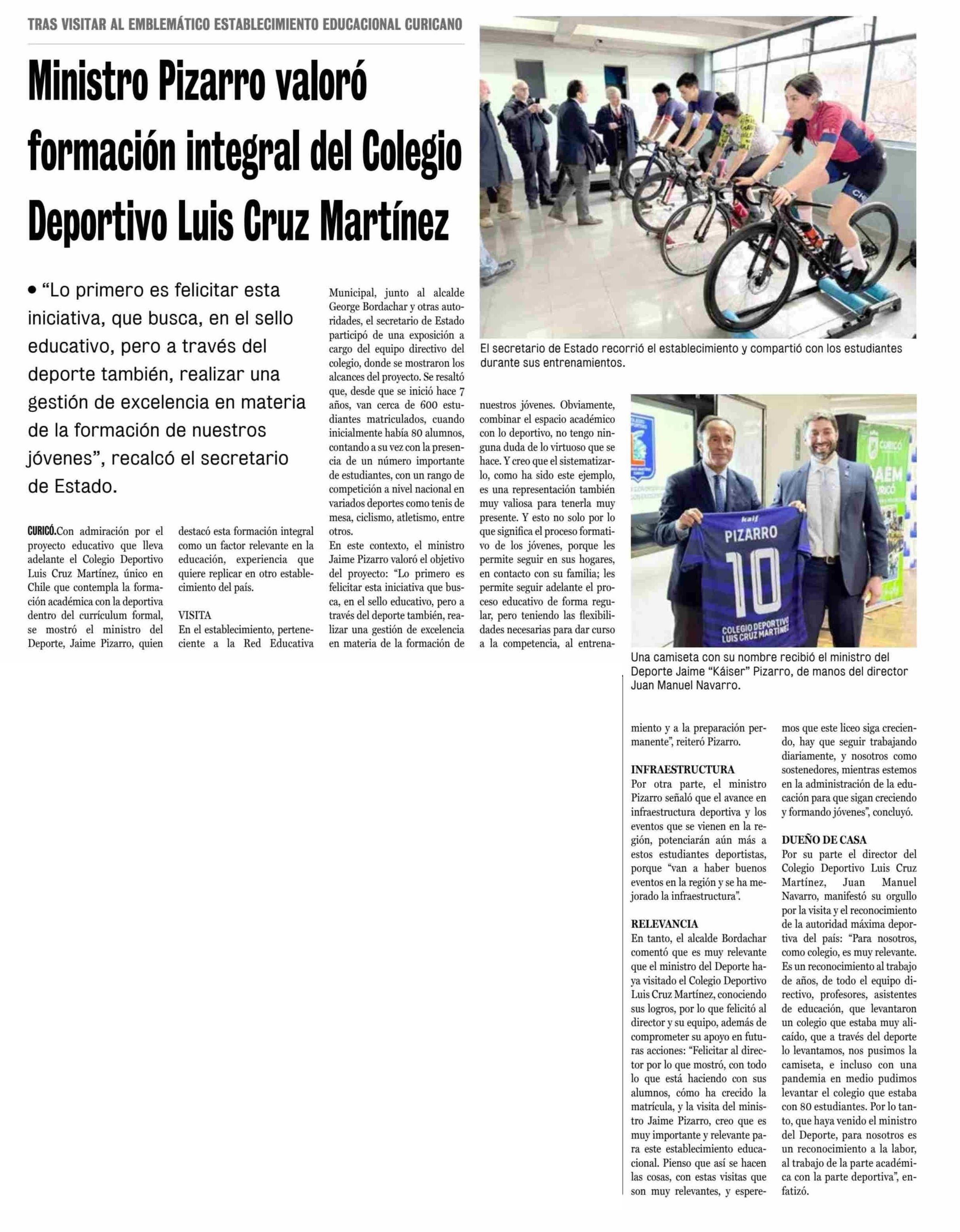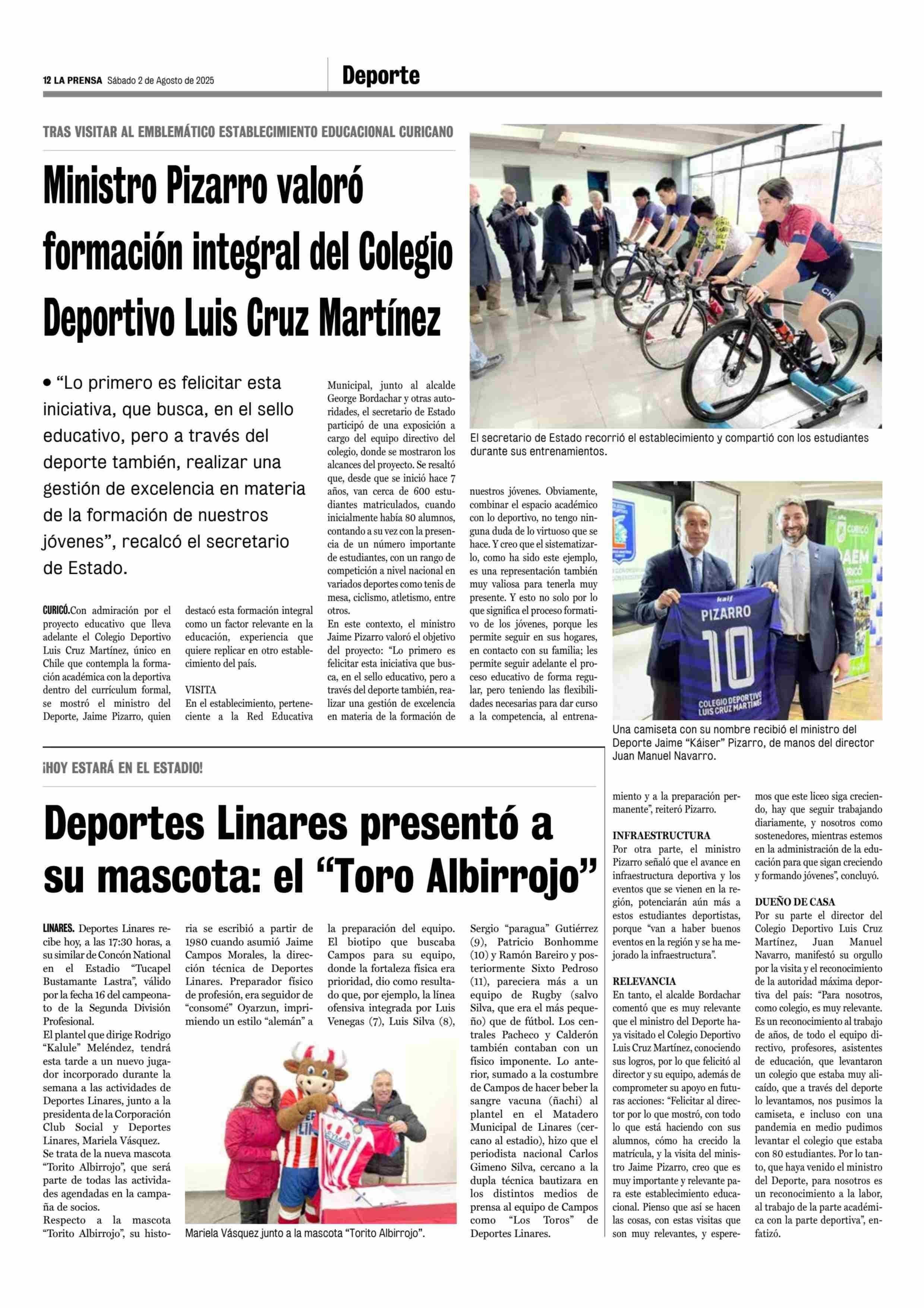 Ministro Pizarro valoró formación integral del Colegio Deportivo Luis Cruz Martínez 02-08-2025 La Prensa de Curicó |