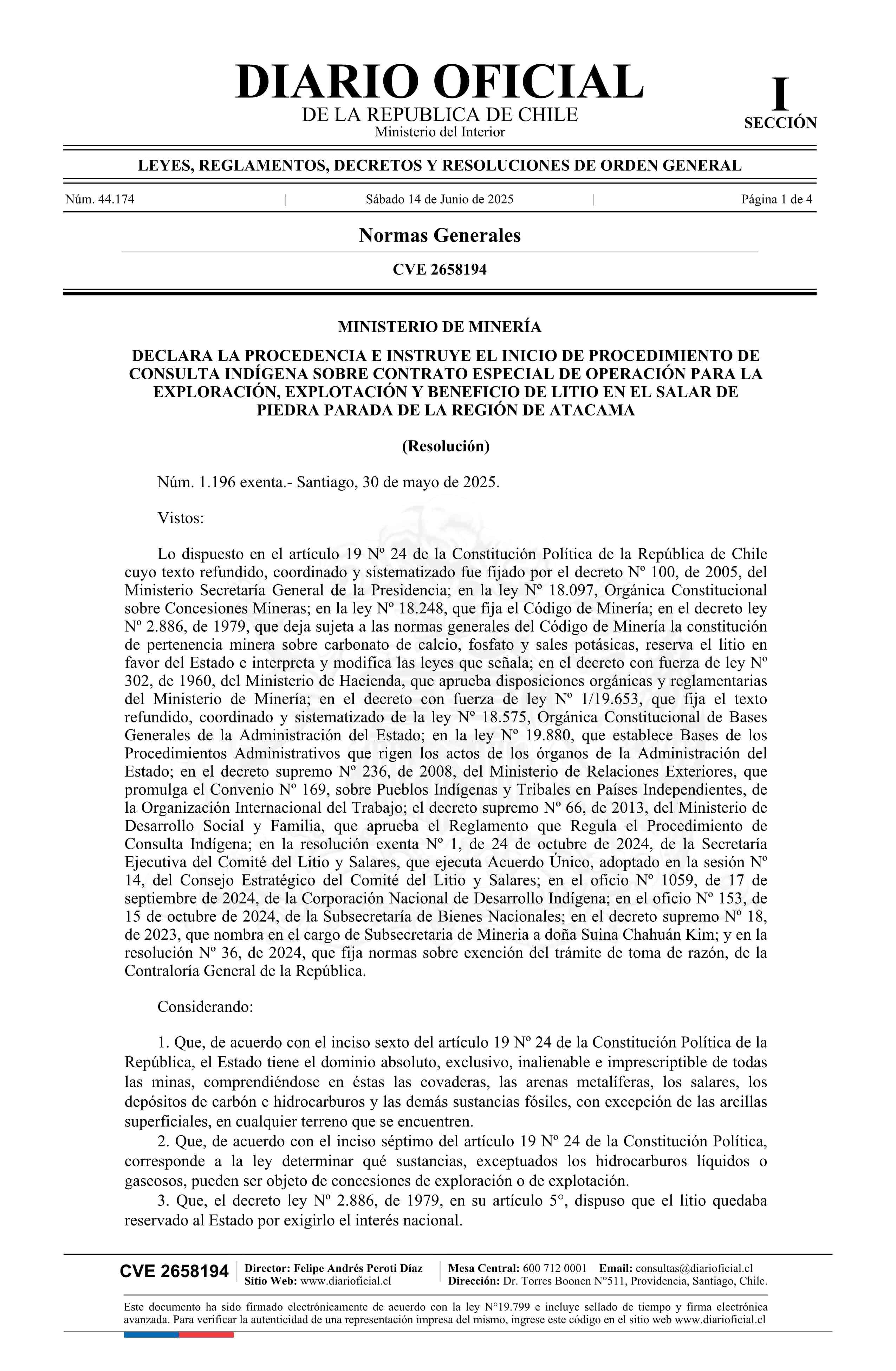 | Título: | Resolución exenta número 1.196, de 2025.- Declara la procedencia e instruye el inicio de procedimiento de consulta indígena sobre contrato especial de operación para la exploración, explotación y beneficio de litio en el Salar de Piedra Parada, de la Región de Atacama |