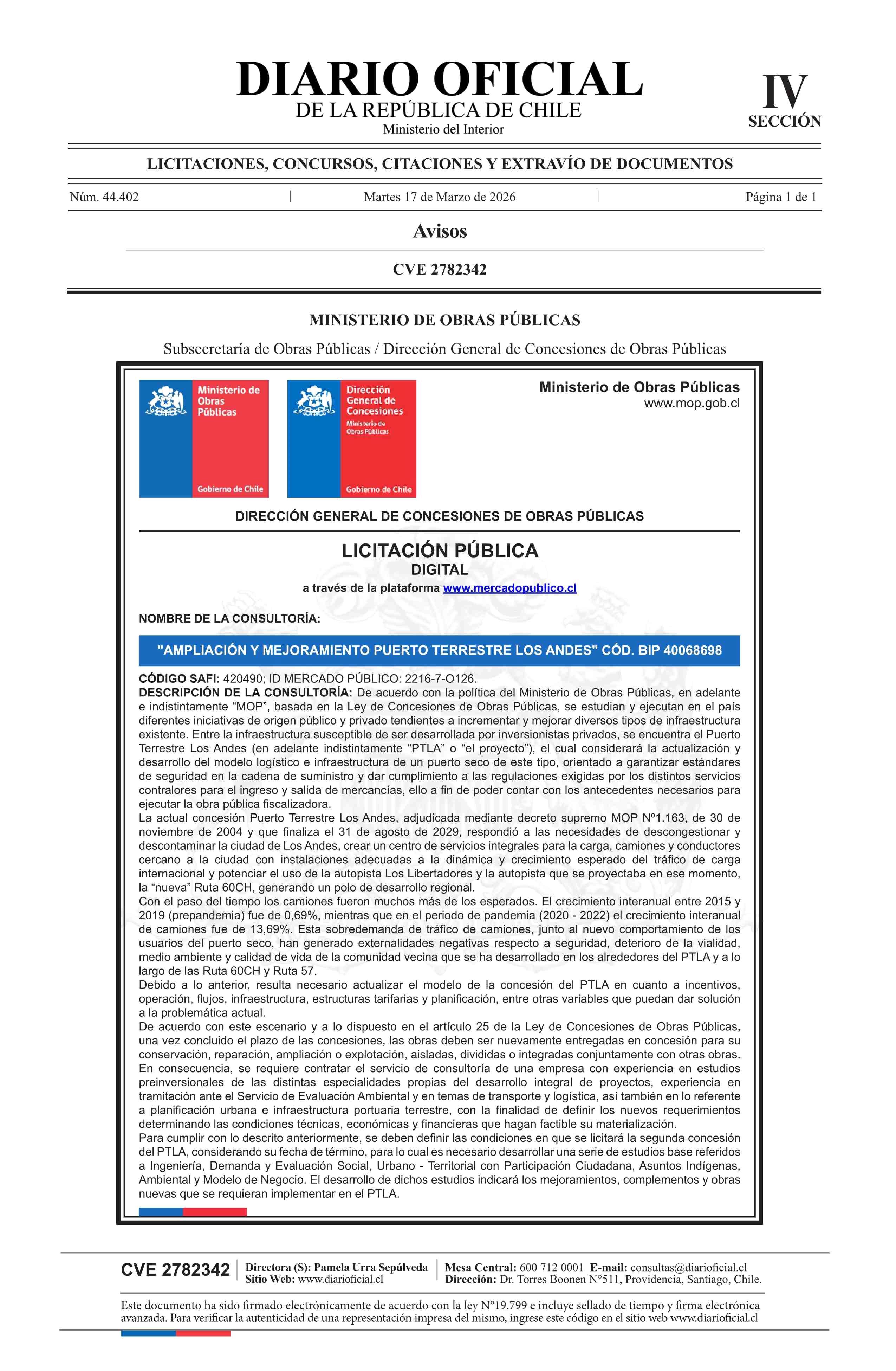 AVISO LICITACIONES: Consultoría: Ampliación y Mejoramiento Puerto Terrestre Los Andes 17-03-2026 Diario Oficial Edición Electrónica |