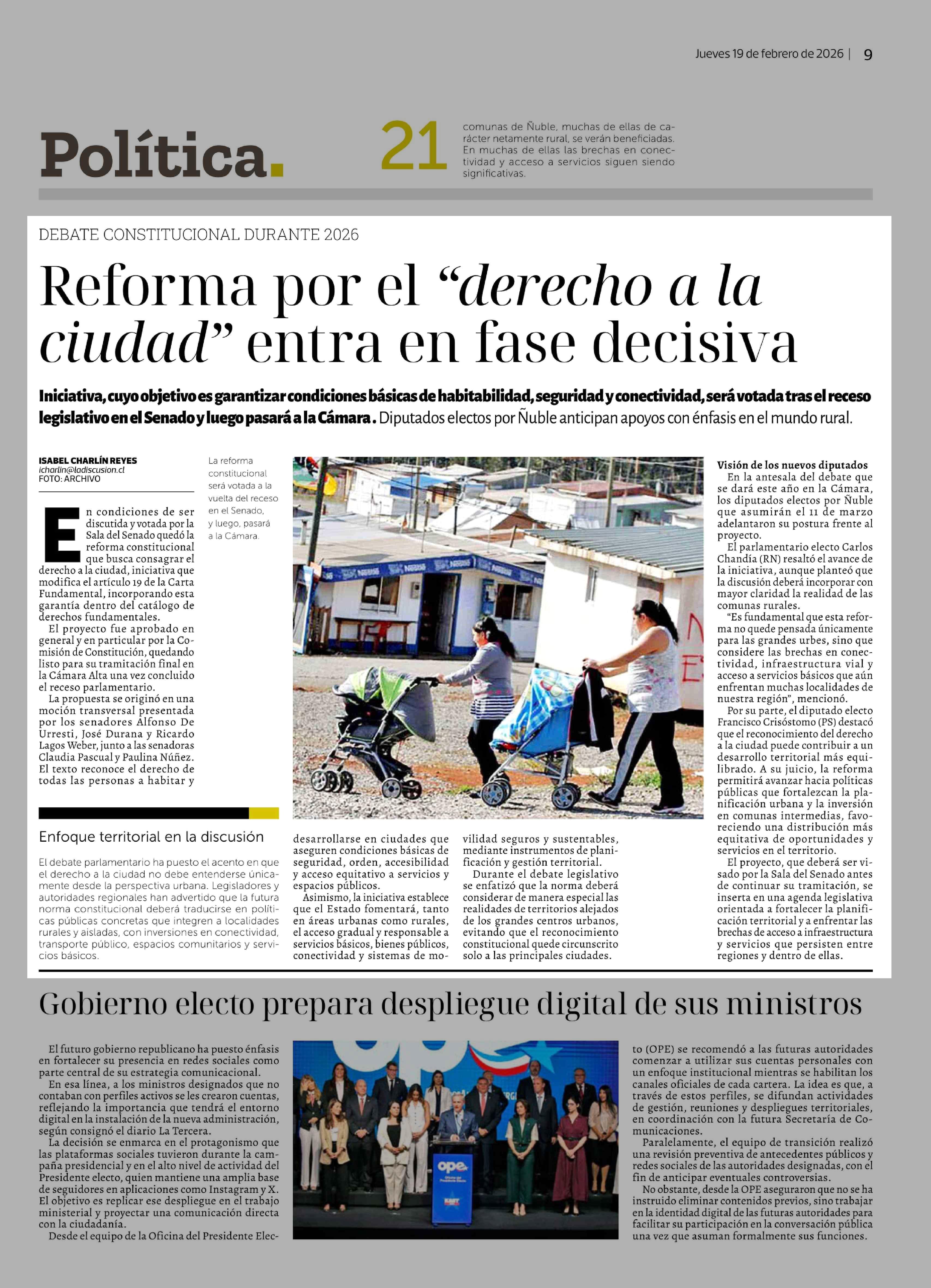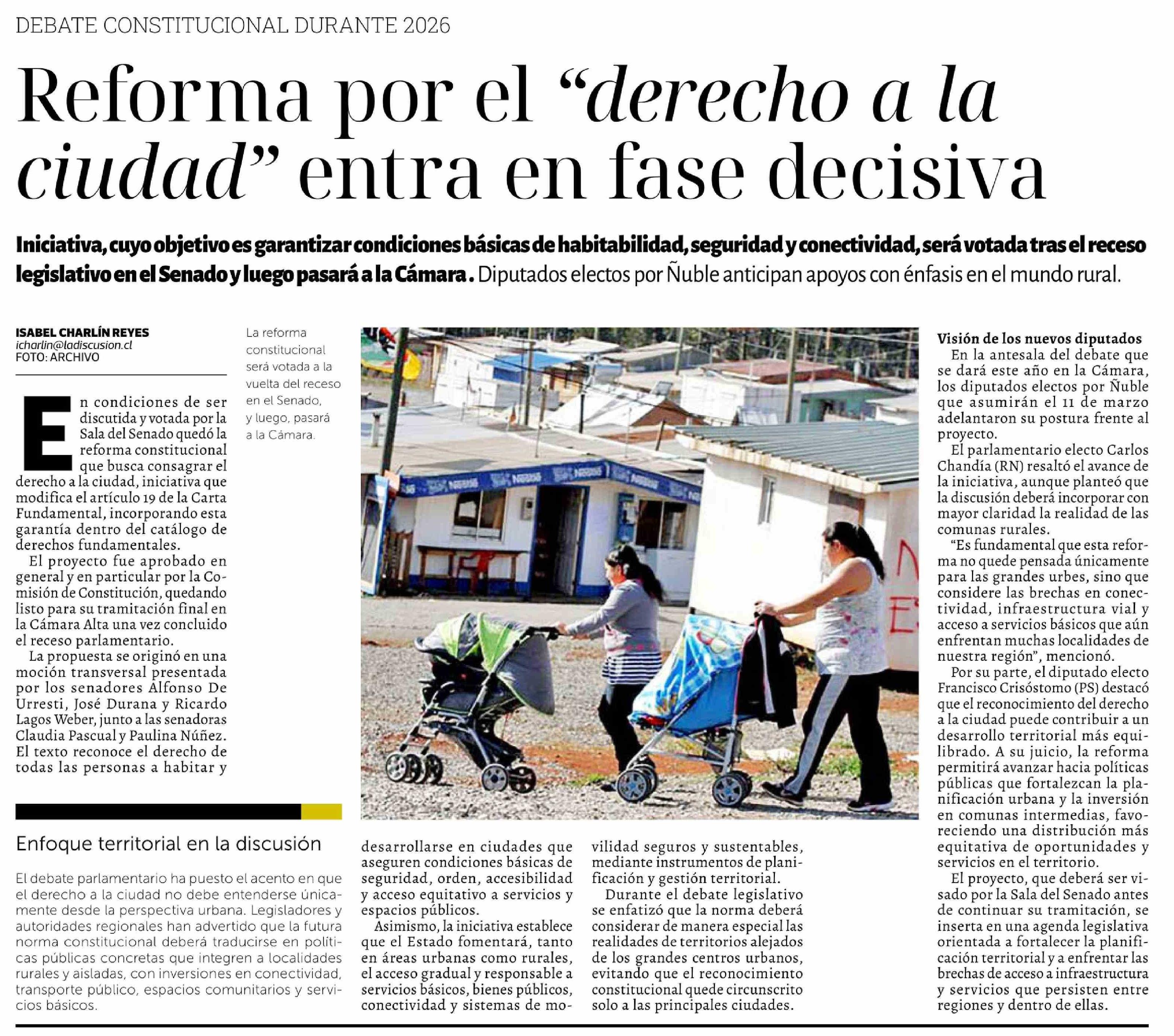 Reforma por el "derecho a la ciudad" entra en fase decisiva 19-02-2026 La Discusión |