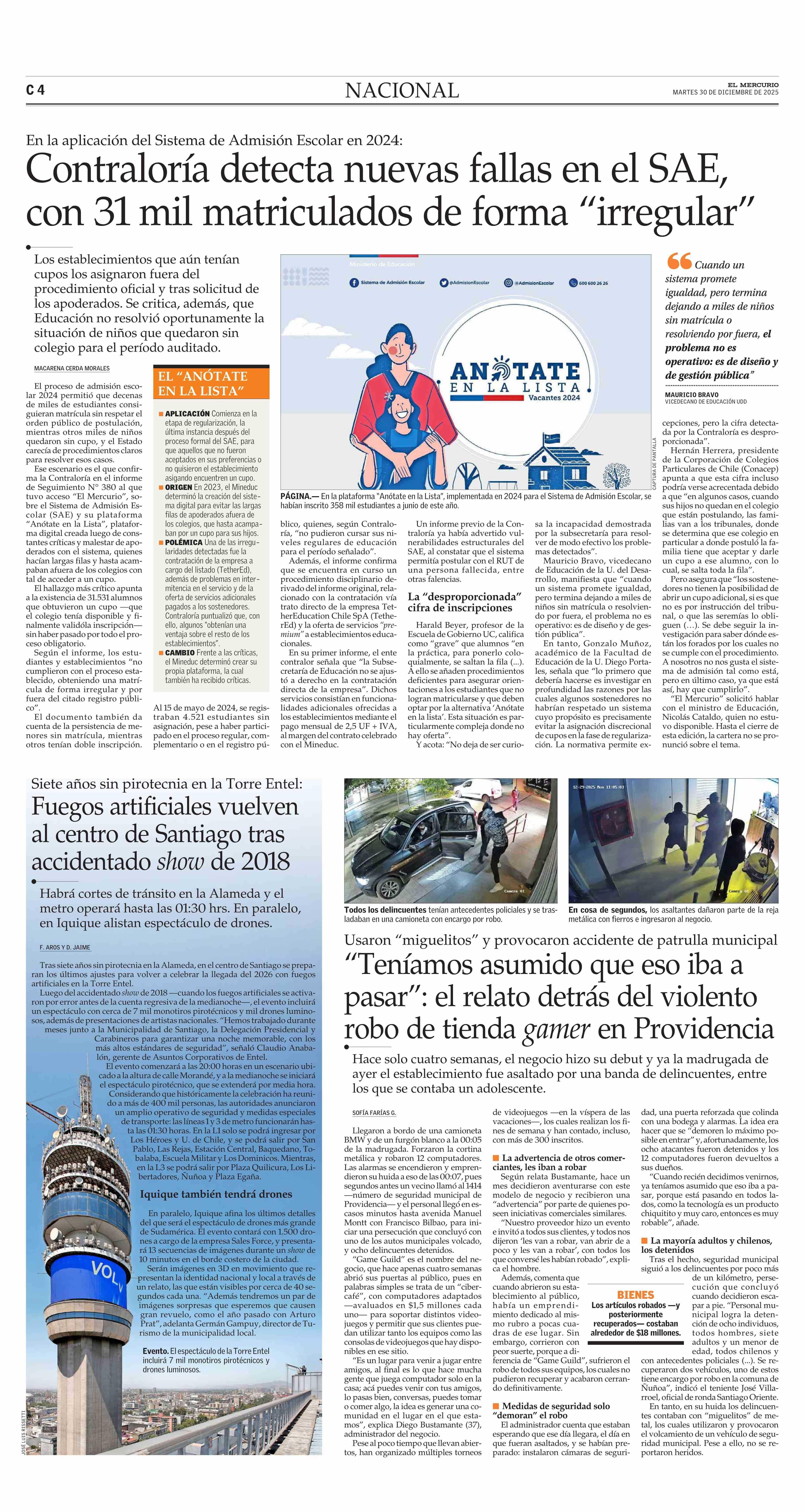 Contraloría detecta nuevas fallas en el SAE, con 31 mil matriculados de forma “irregular” 30-12-2025 El Mercurio |