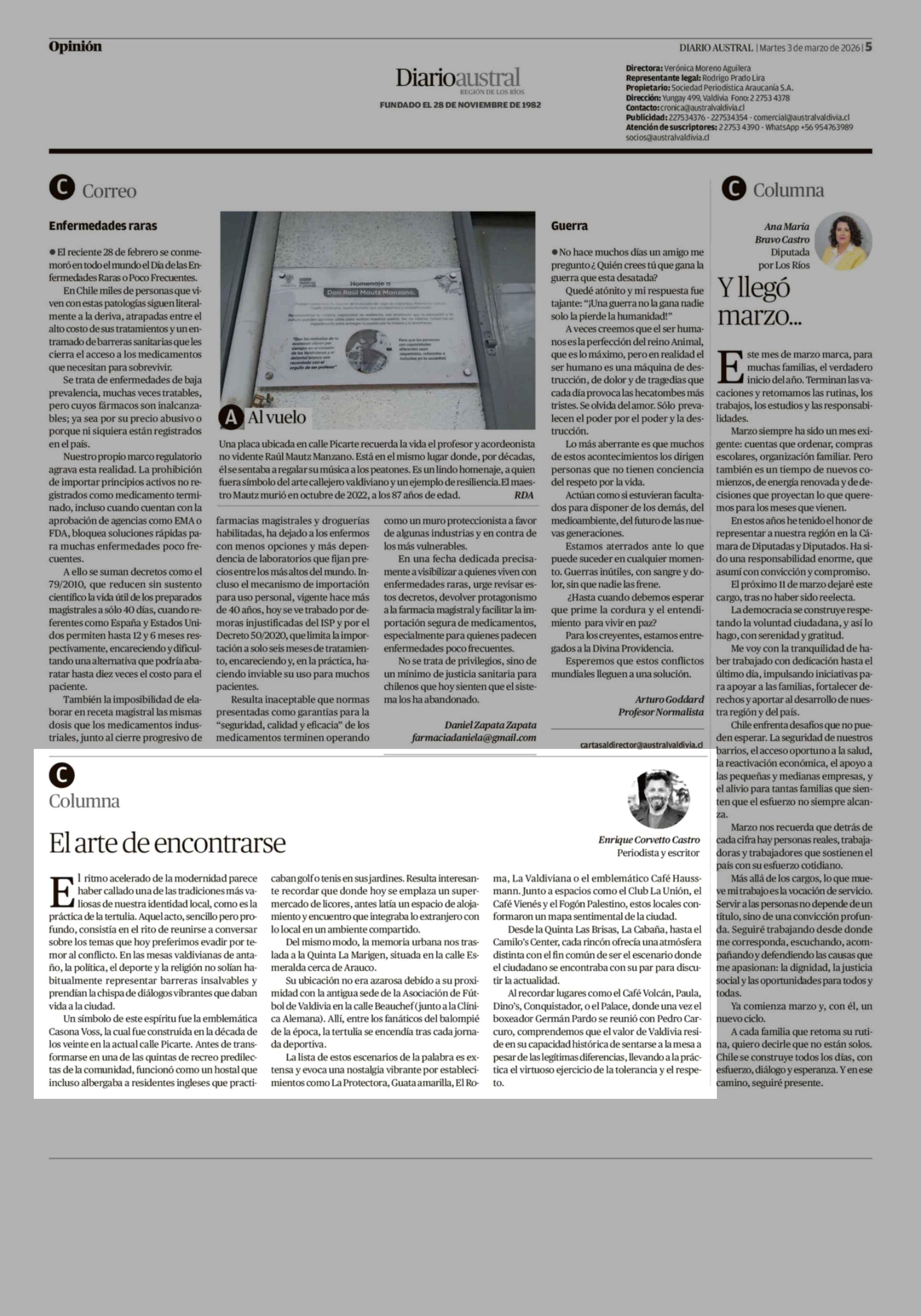 Columnas de Opinión: El arte de encontrarse 03-03-2026 Diario Austral Región de Los Ríos |