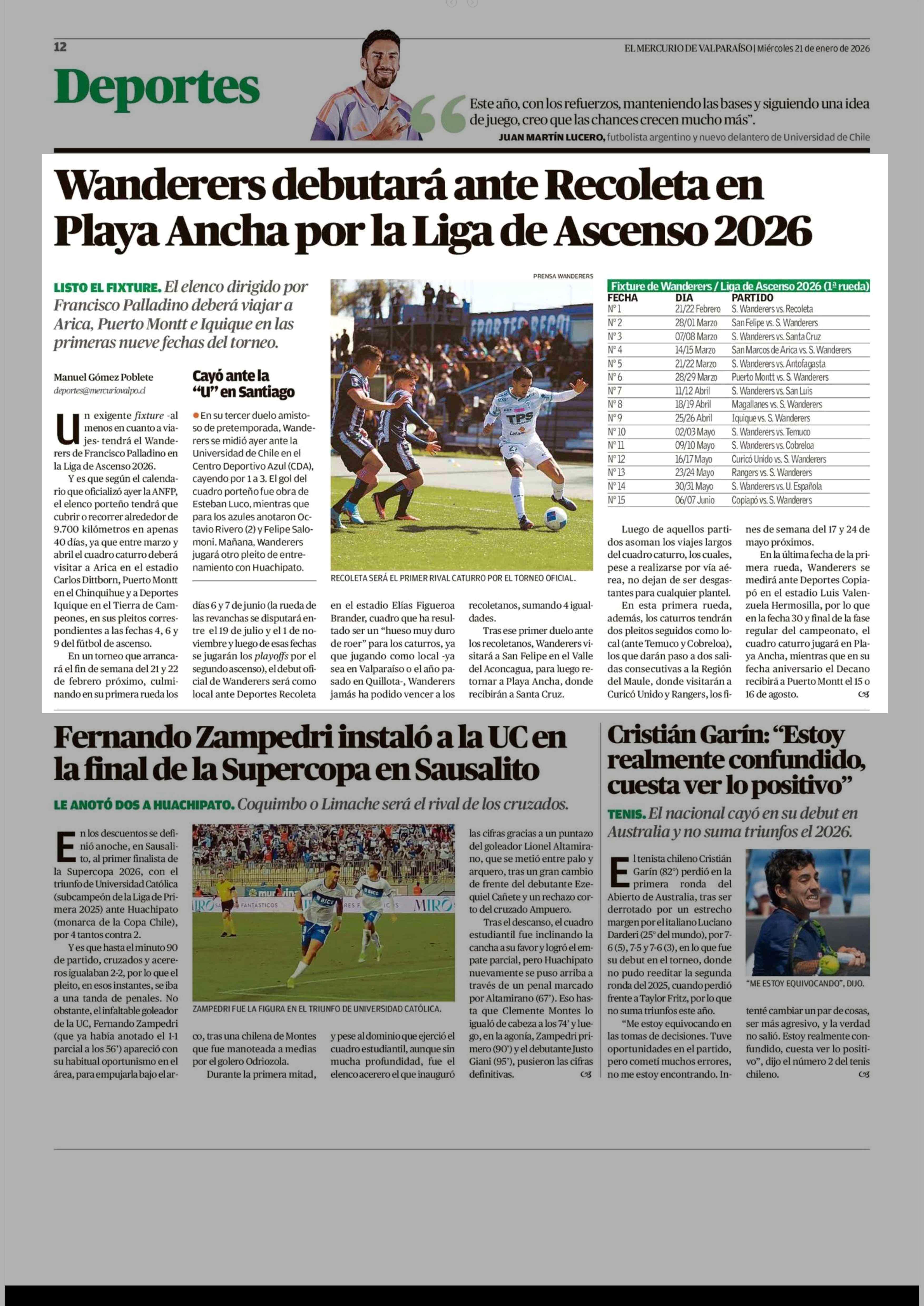 Wanderers debutará ante Recoleta en Playa Ancha por la Liga de Ascenso 2026 21-01-2026 El Mercurio de Valparaíso |