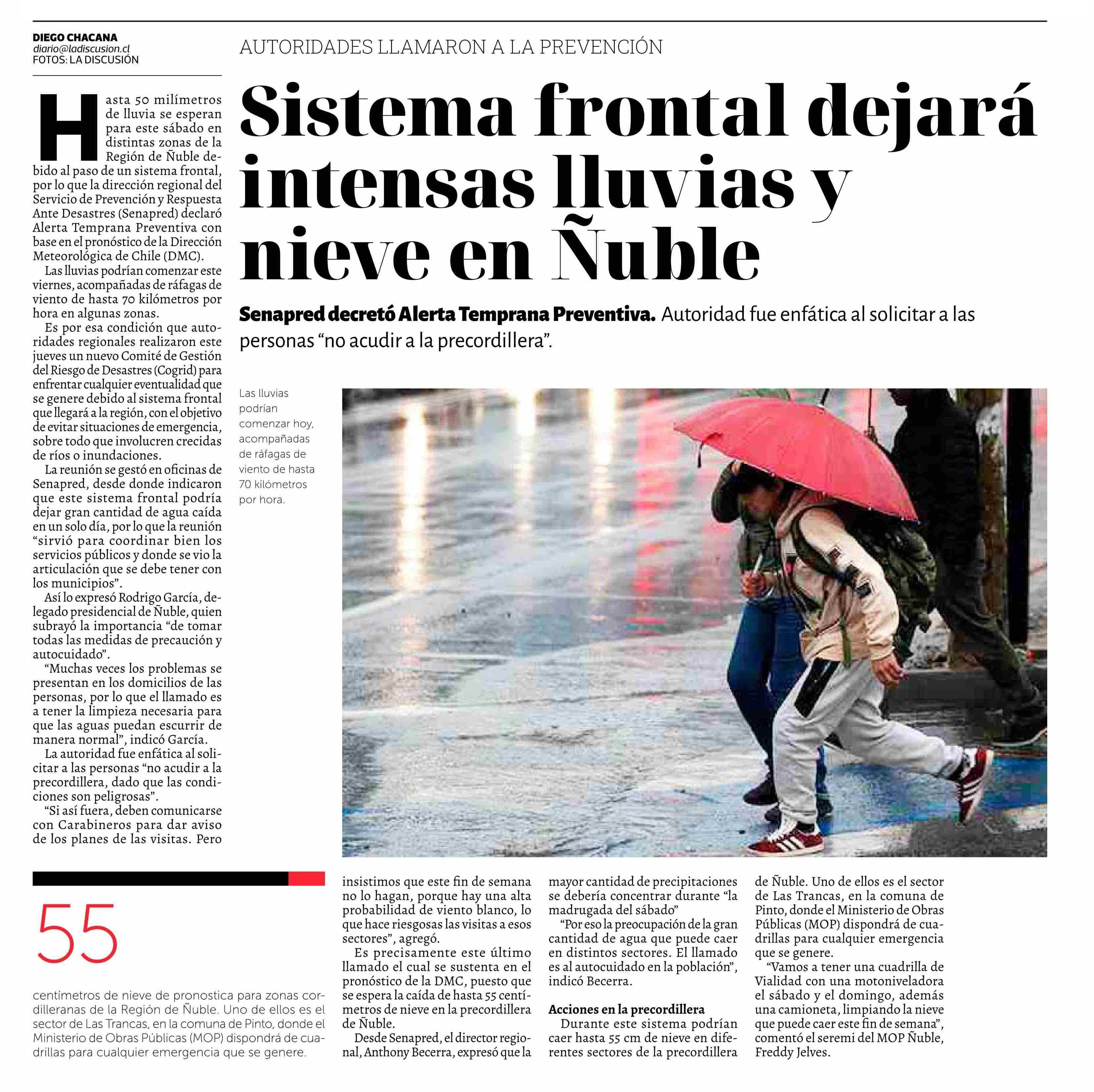 Sistema frontal dejará intensas lluvias y nieve en Ñuble 16-05-2025 La Discusión |