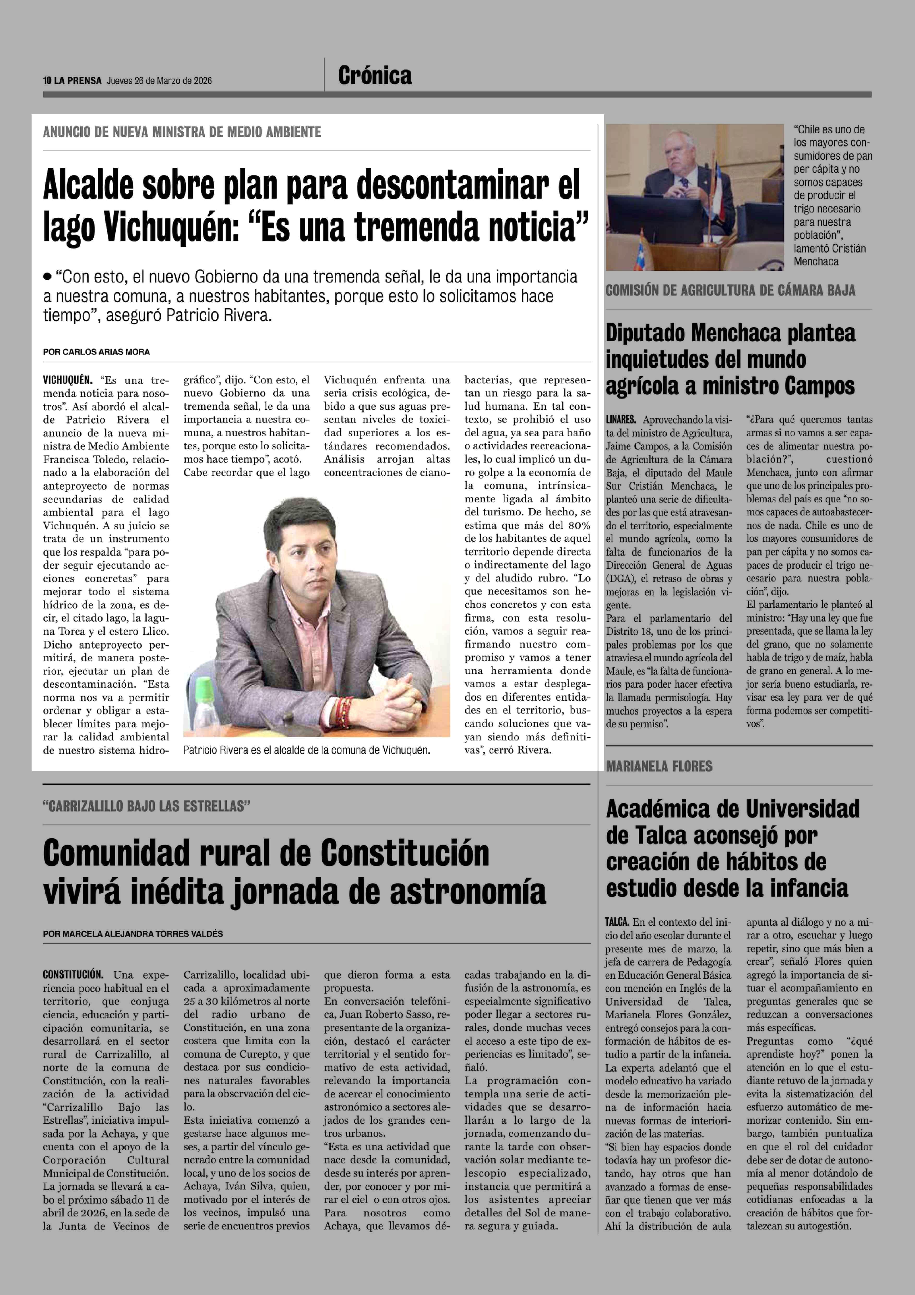 Alcalde sobre plan para descontaminar el lago Vichuquén: "Es una tremenda noticia" 26-03-2026 La Prensa de Curicó |