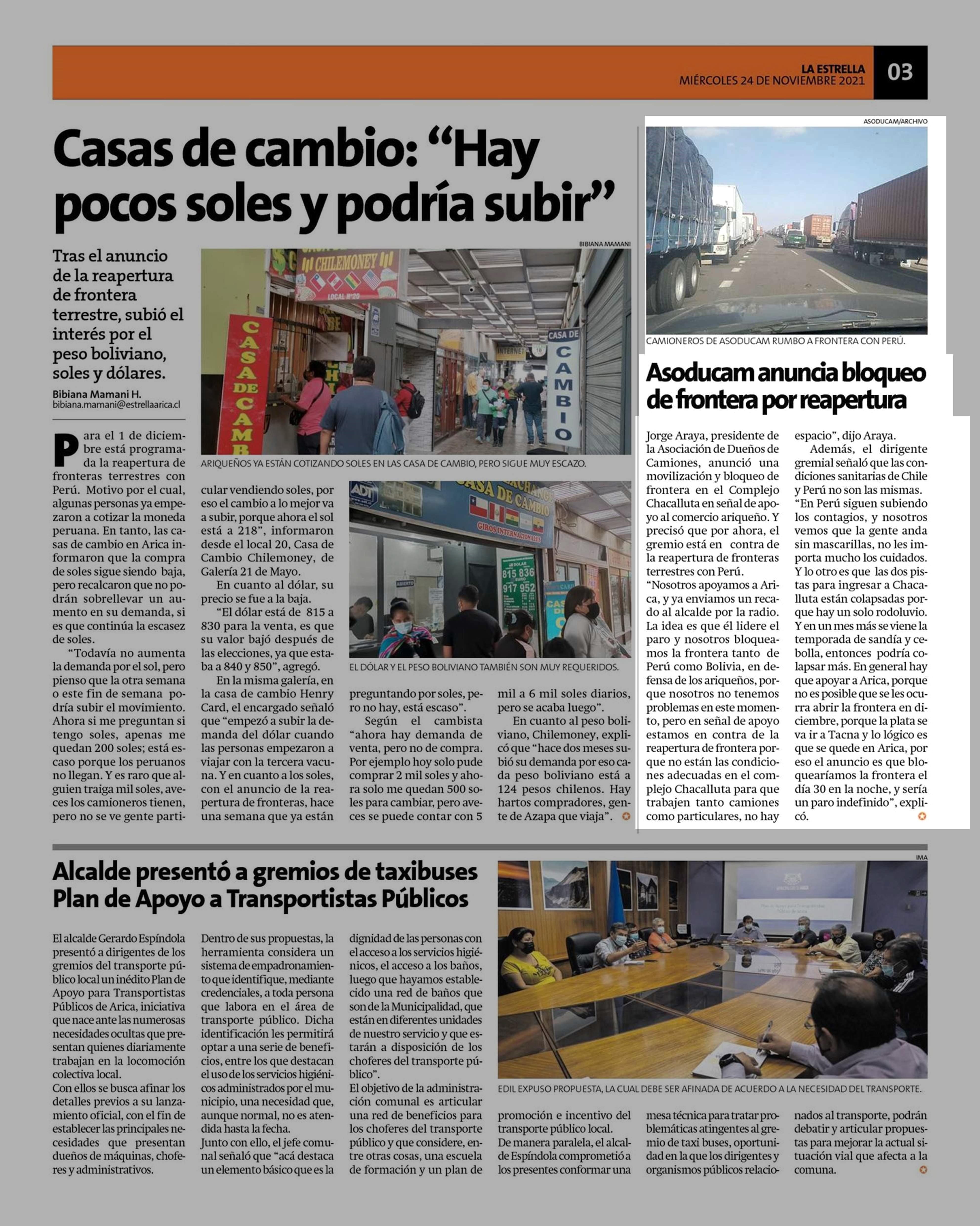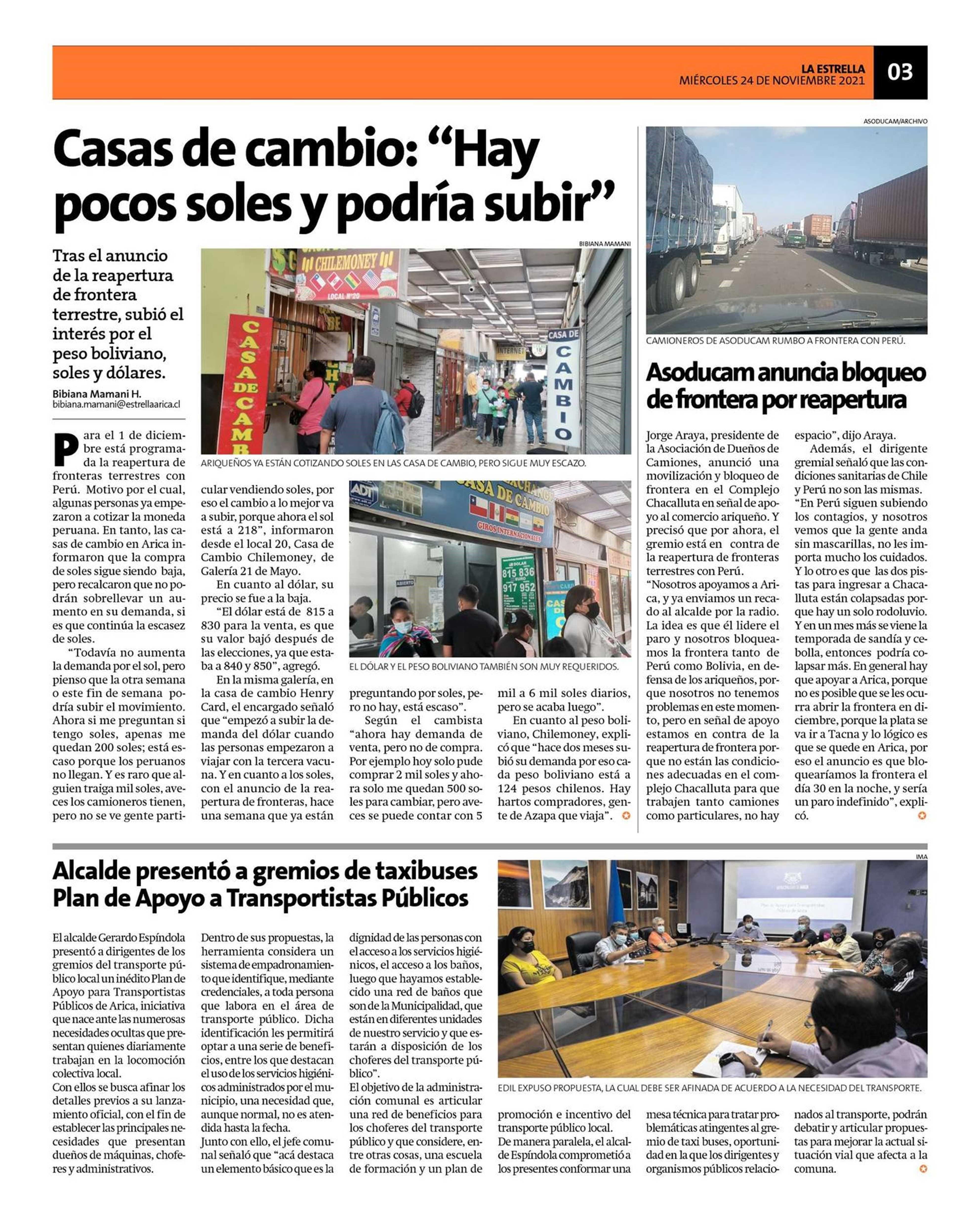 Asoducam bloqueo de frontera por reapertura 24-11-2021 La Estrella de Arica |