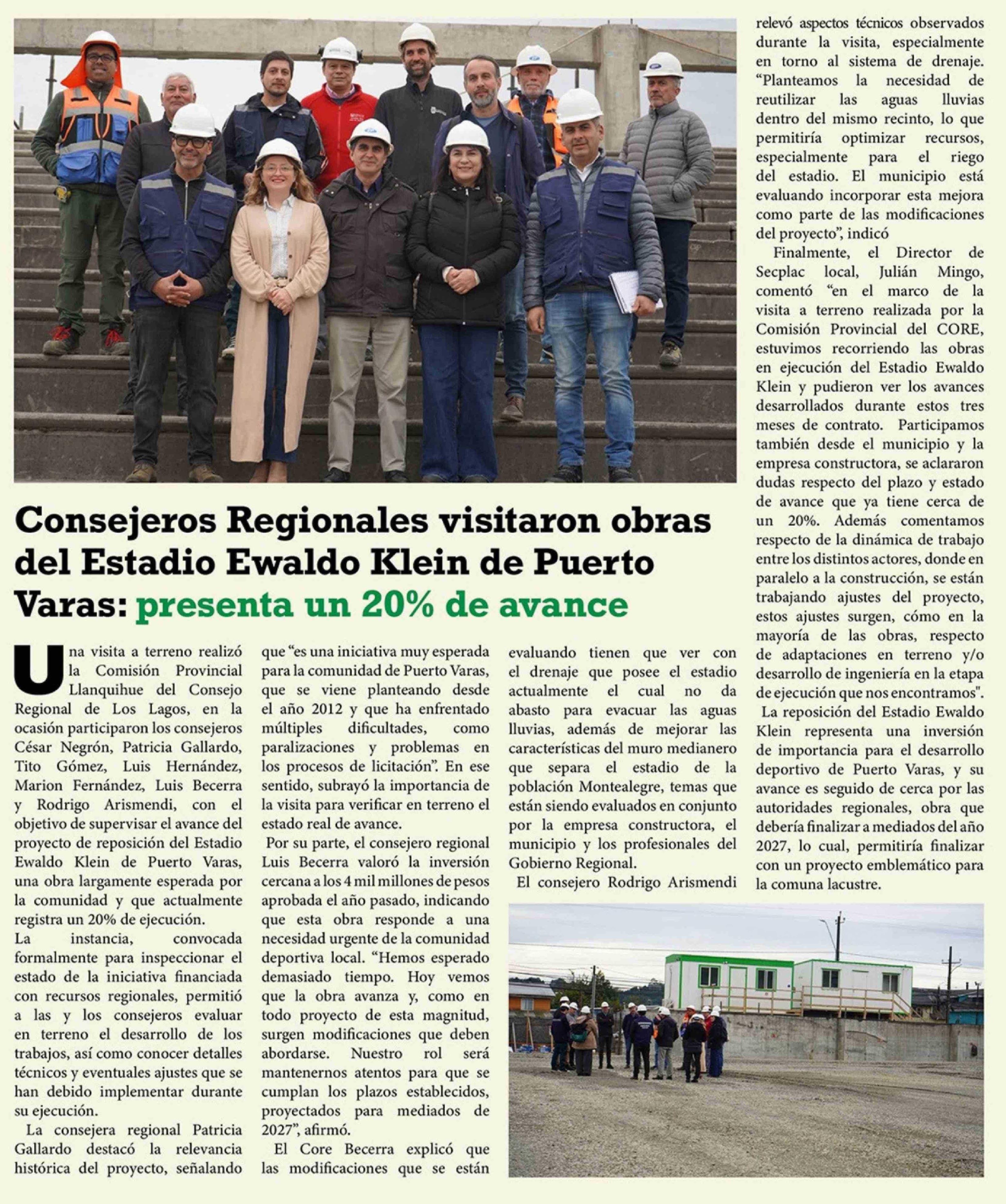 Consejeros Regionales visitaron obras del Estadio Ewaldo Klein de Puerto Varas: presenta un 20% de avance 15-04-2026 El Heraldo Austral |