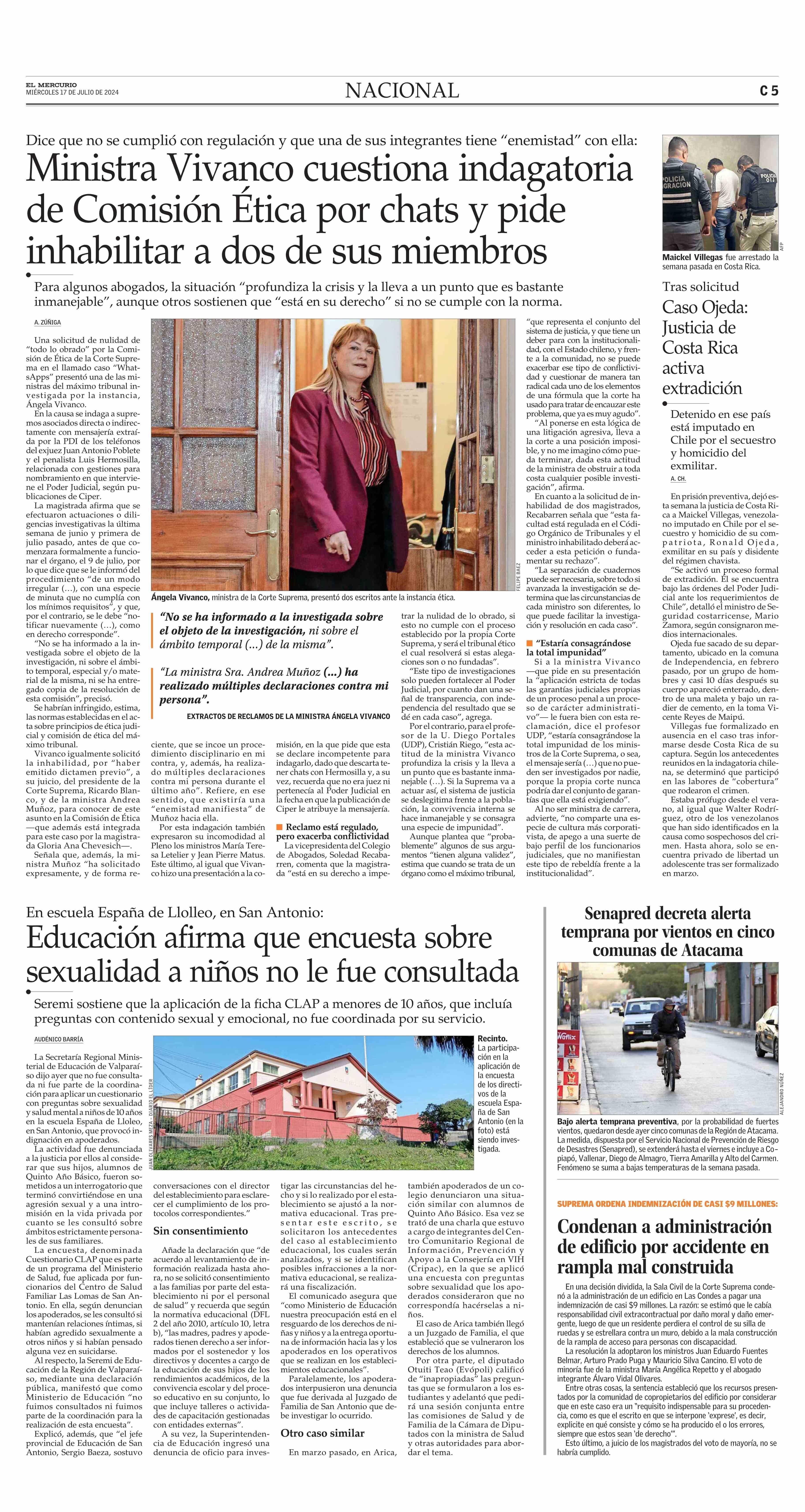 Ministra Vivanco cuestiona indagatoria de Comisión Ética por chats y pide inhabilitar a dos de sus miembros 17-07-2024 El Mercurio |