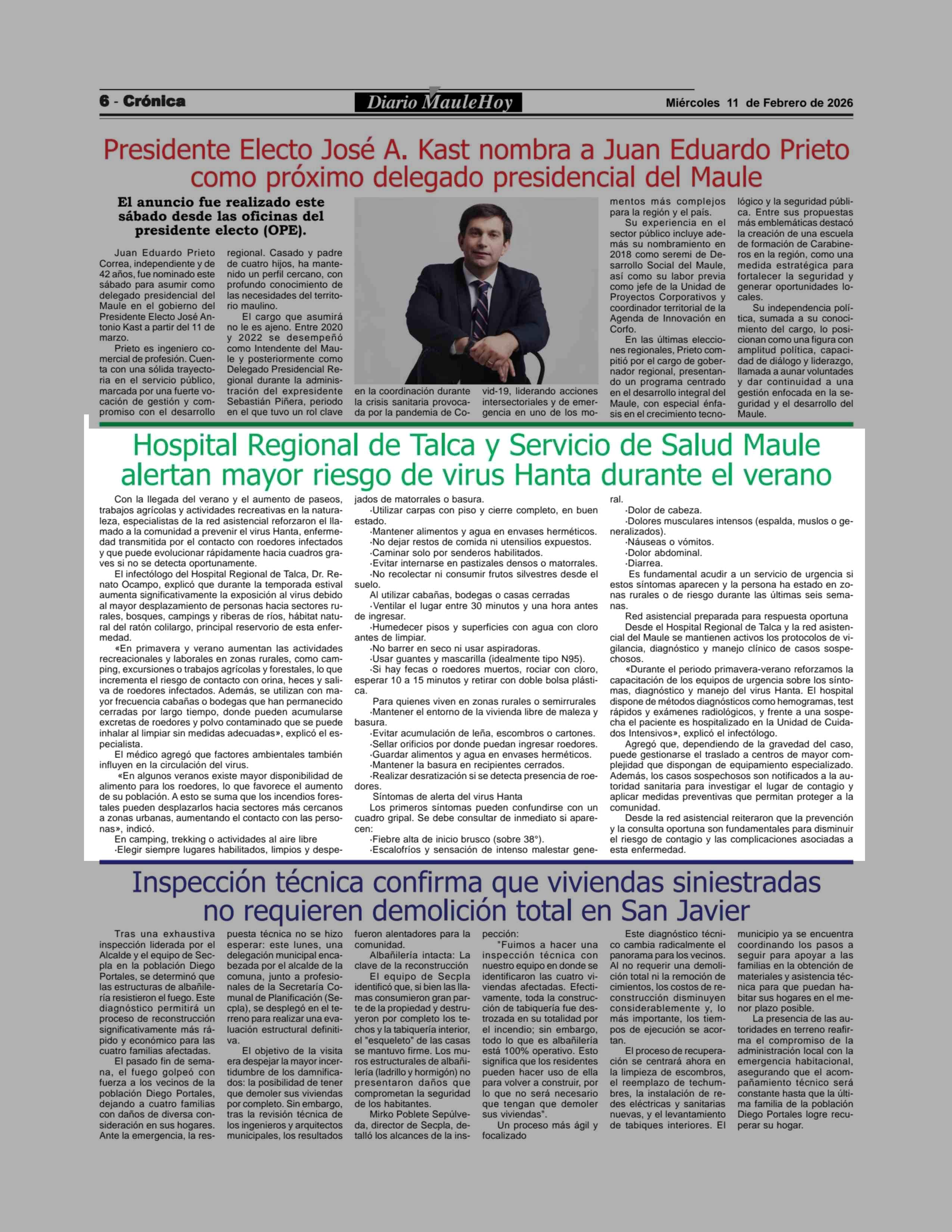 Hospital Regional de Talca y Servicio de Salud Maule alertan mayor riesgo de virus Hanta durante el verano 11-02-2026 Maule Hoy |