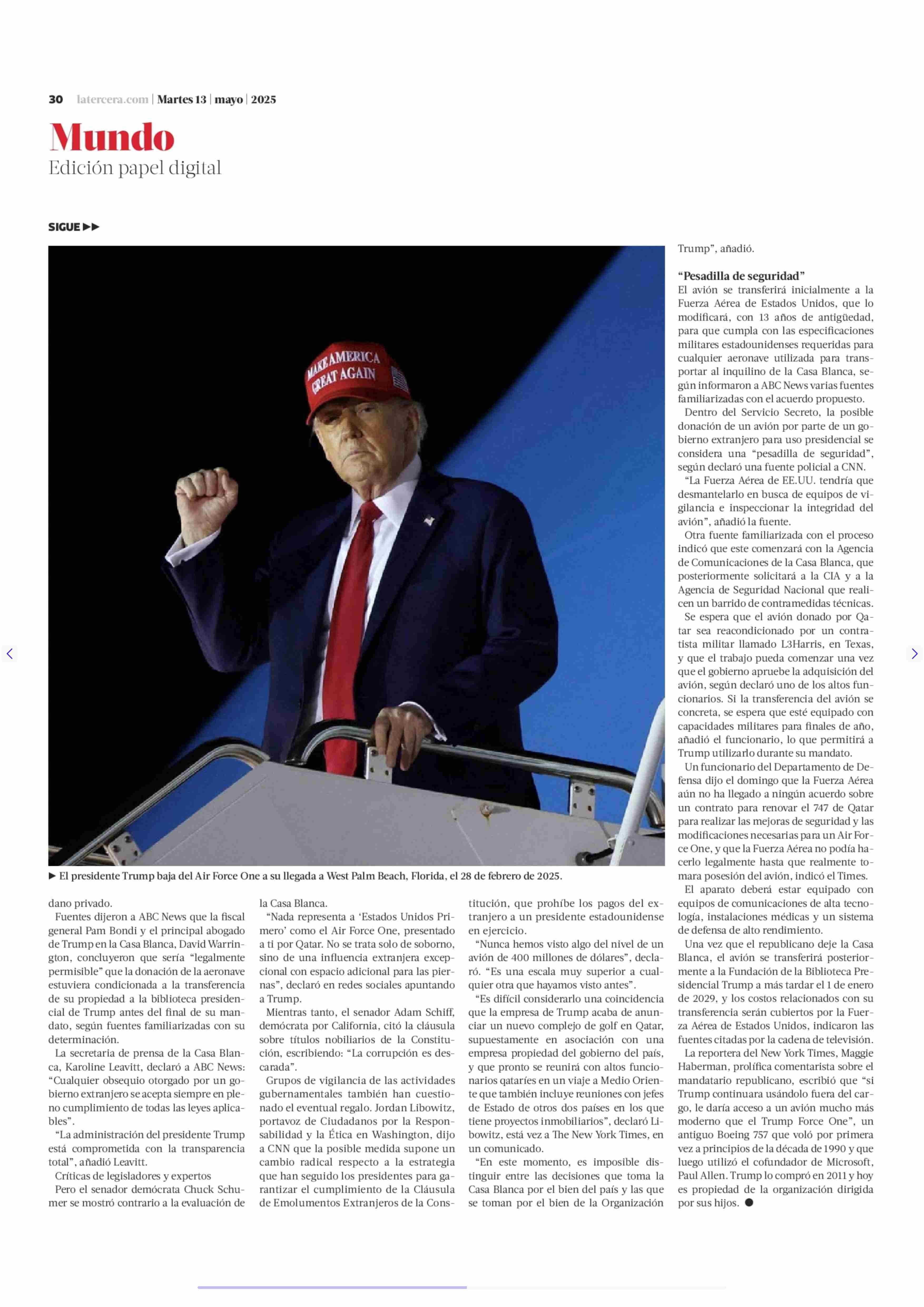 ¿Un nuevo Air Force One “regalado” por Qatar a Trump”: la polémica en torno al avión presidencial de EE.UU. 13-05-2025 La Tercera |
