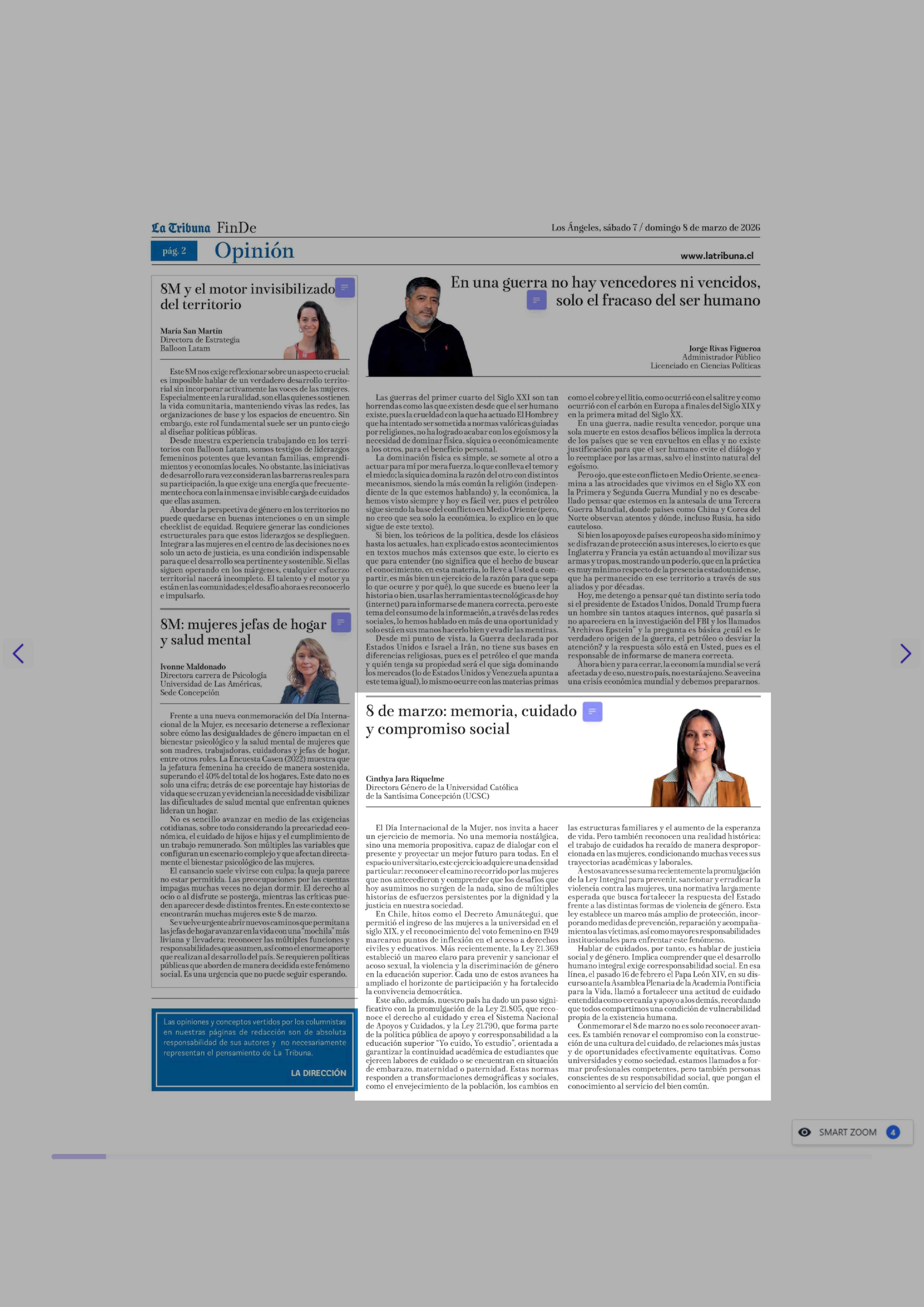Columnas de Opinión: 8 De marzo: memoria, cuidado y compromiso social 07-03-2026 La Tribuna |