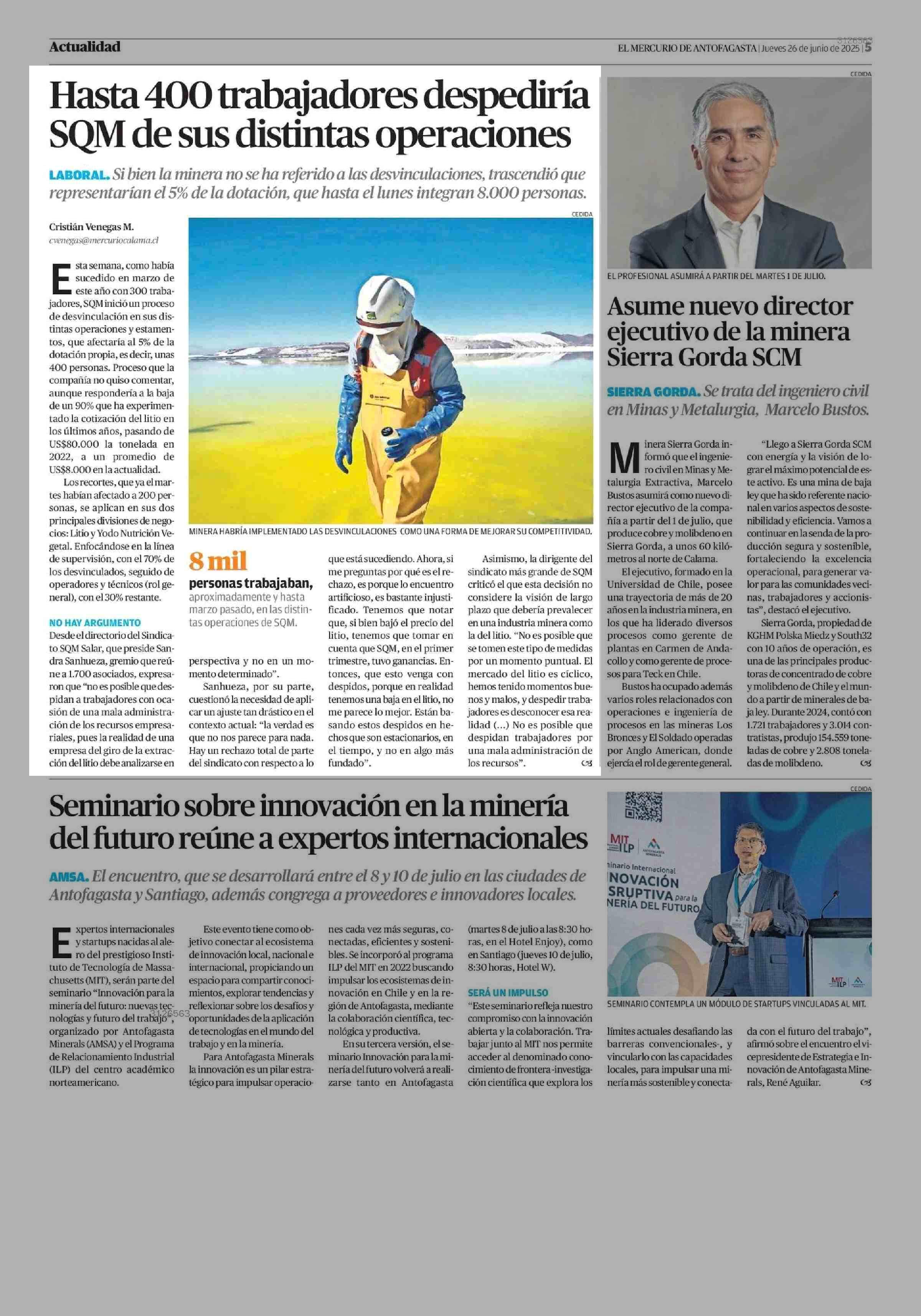 Hasta 400 trabajadores despediría SQM de sus distintas operaciones 26-06-2025 El Mercurio de Antofagasta |