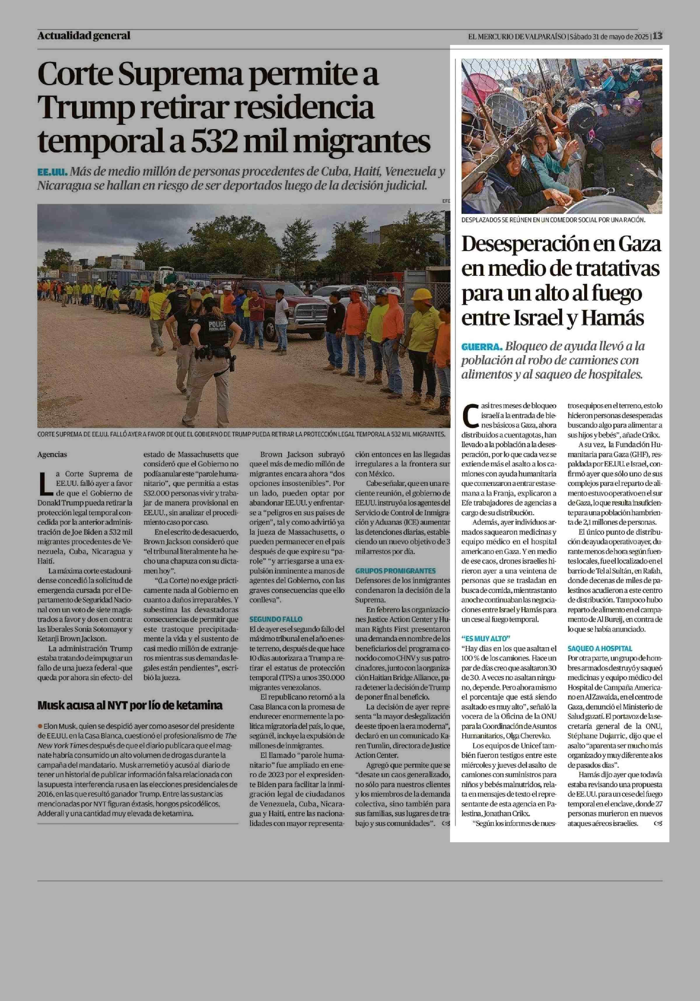 Desesperación en Gaza en medio de tratativas entre Israel y Hamás para un alto al fuego 31-05-2025 El Mercurio de Valparaíso |