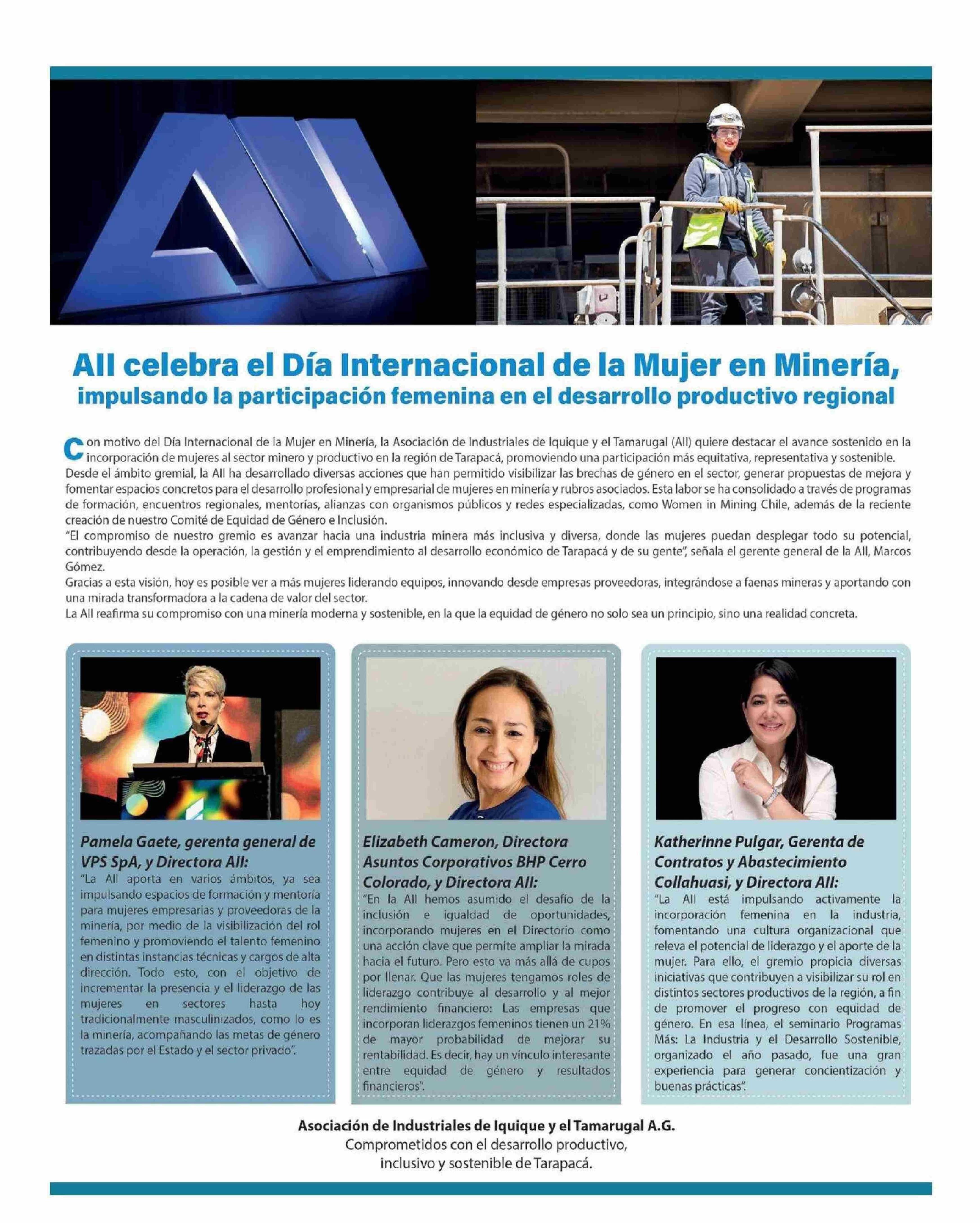 All celebra el Día Internacional de la Mujer en Minería, impulsando la participación femenina en el desarrollo productivo regional 15-06-2025 La Estrella de Iquique |