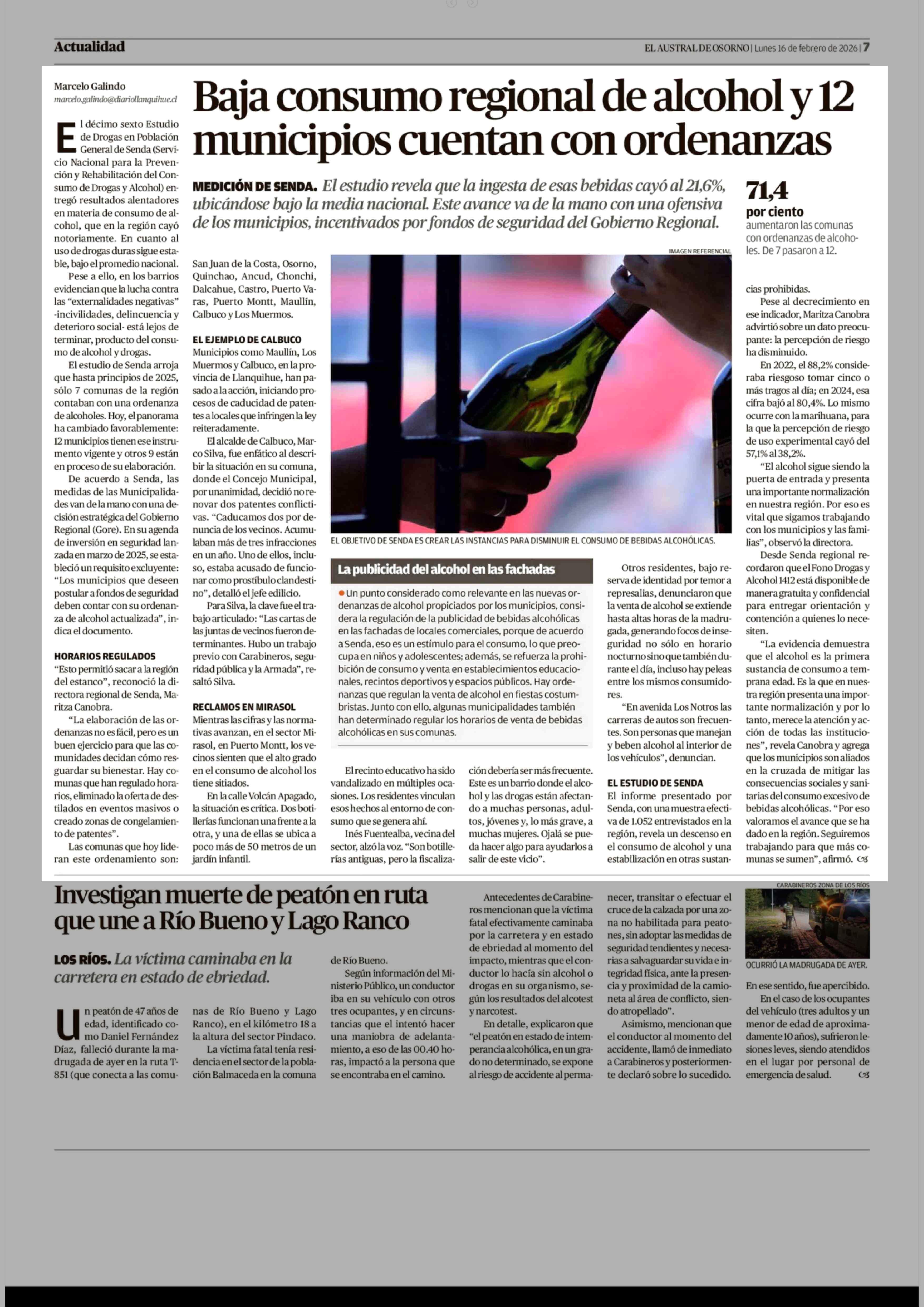 Baja consumo regional de alcohol y 12 municipios cuentan con ordenanzas 16-02-2026 El Austral de Osorno |