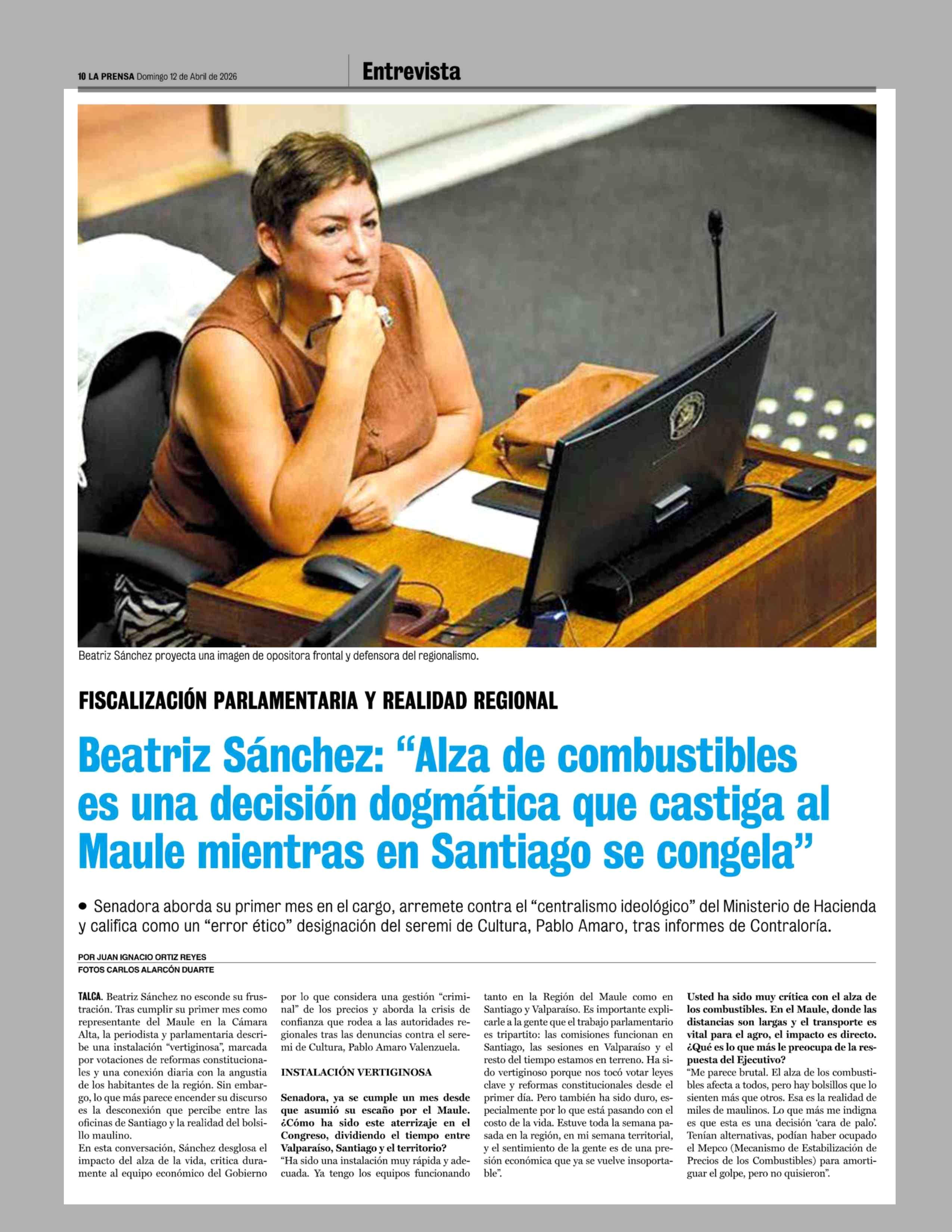 Beatriz Sánchez: "Alza de combustibles es una decisión dogmática que castiga al Maule mientras en Santiago se congela" 12-04-2026 La Prensa de Curicó |