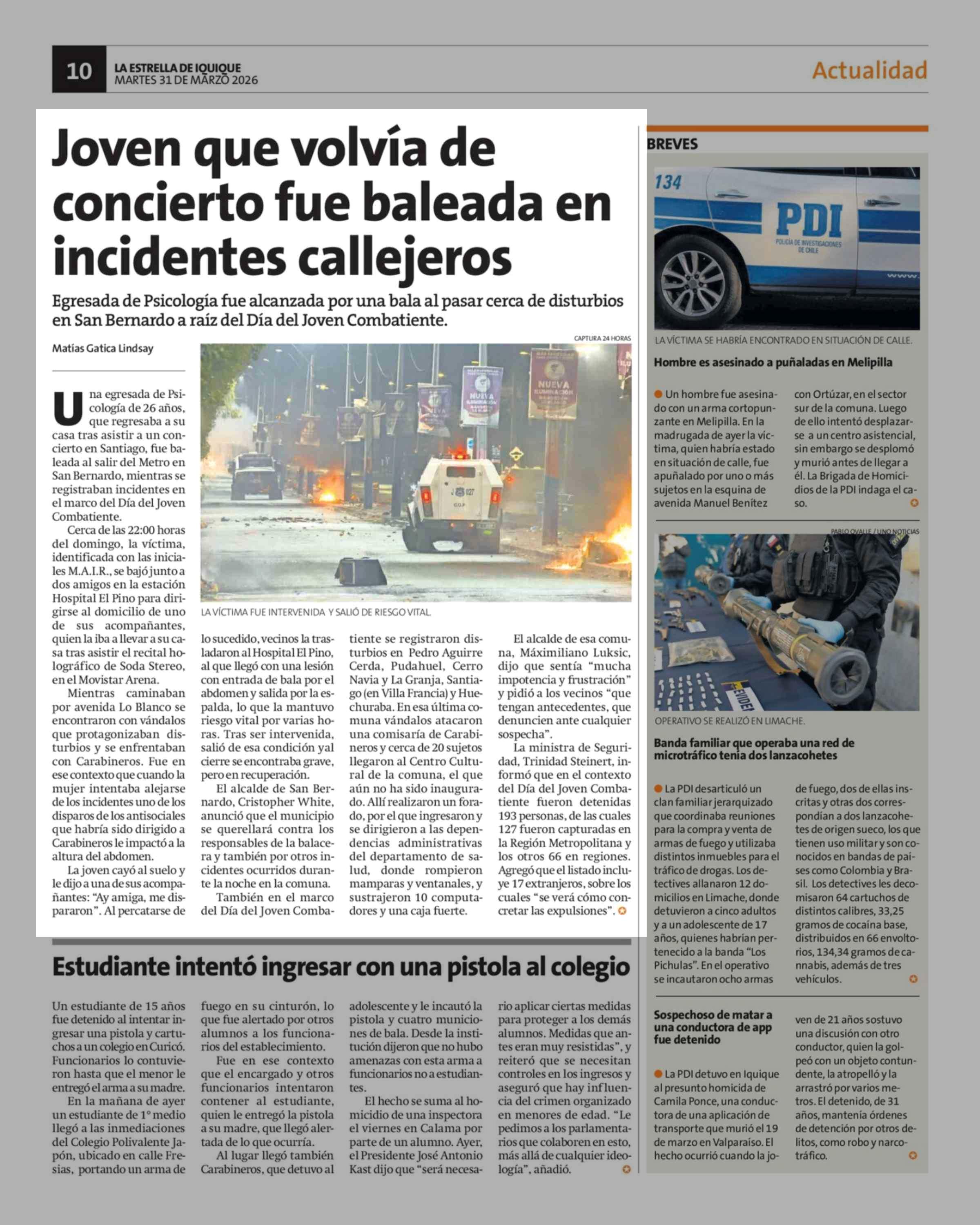 Joven que volvía de concierto fue baleada en incidentes callejeros 31-03-2026 La Estrella de Iquique |