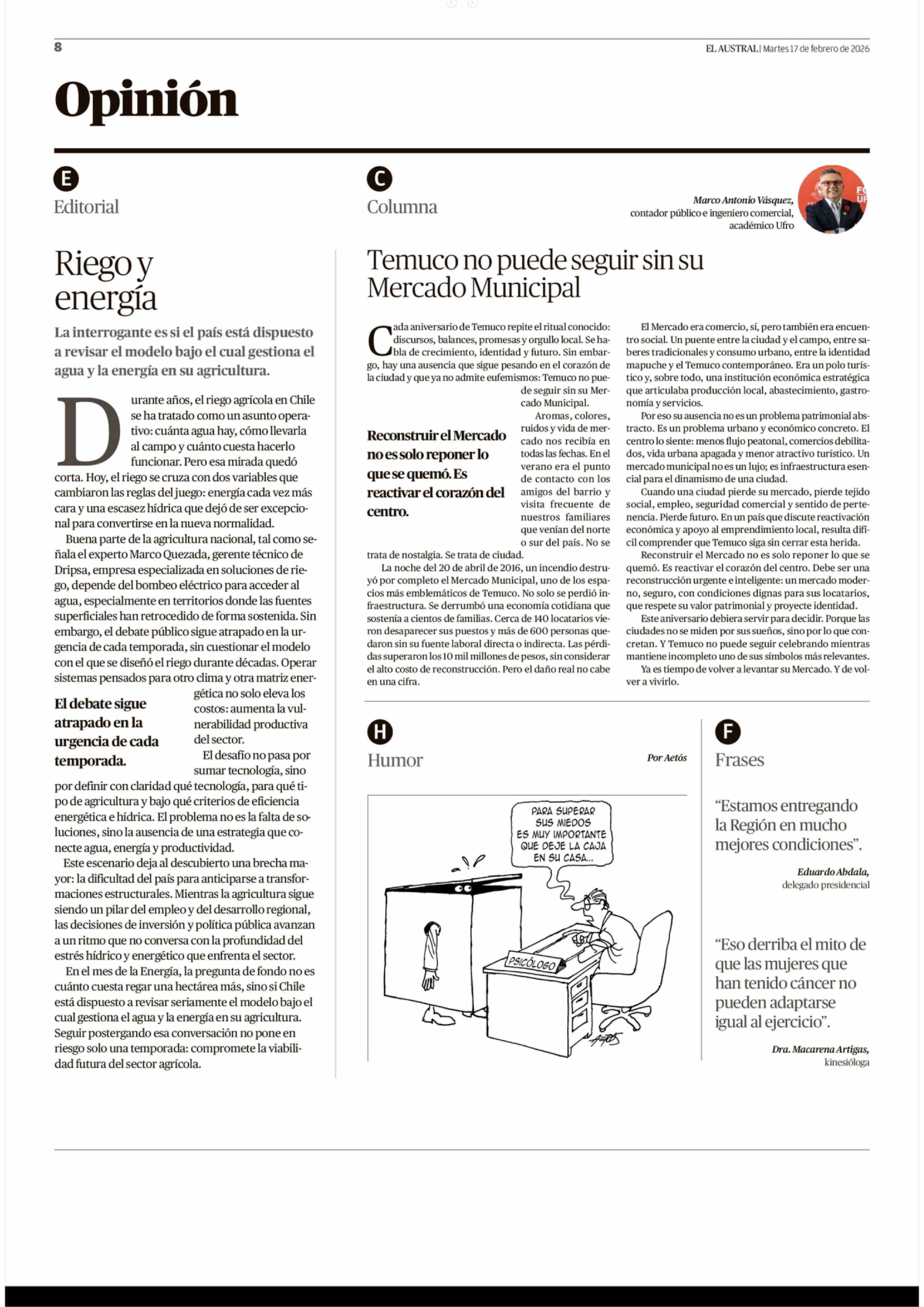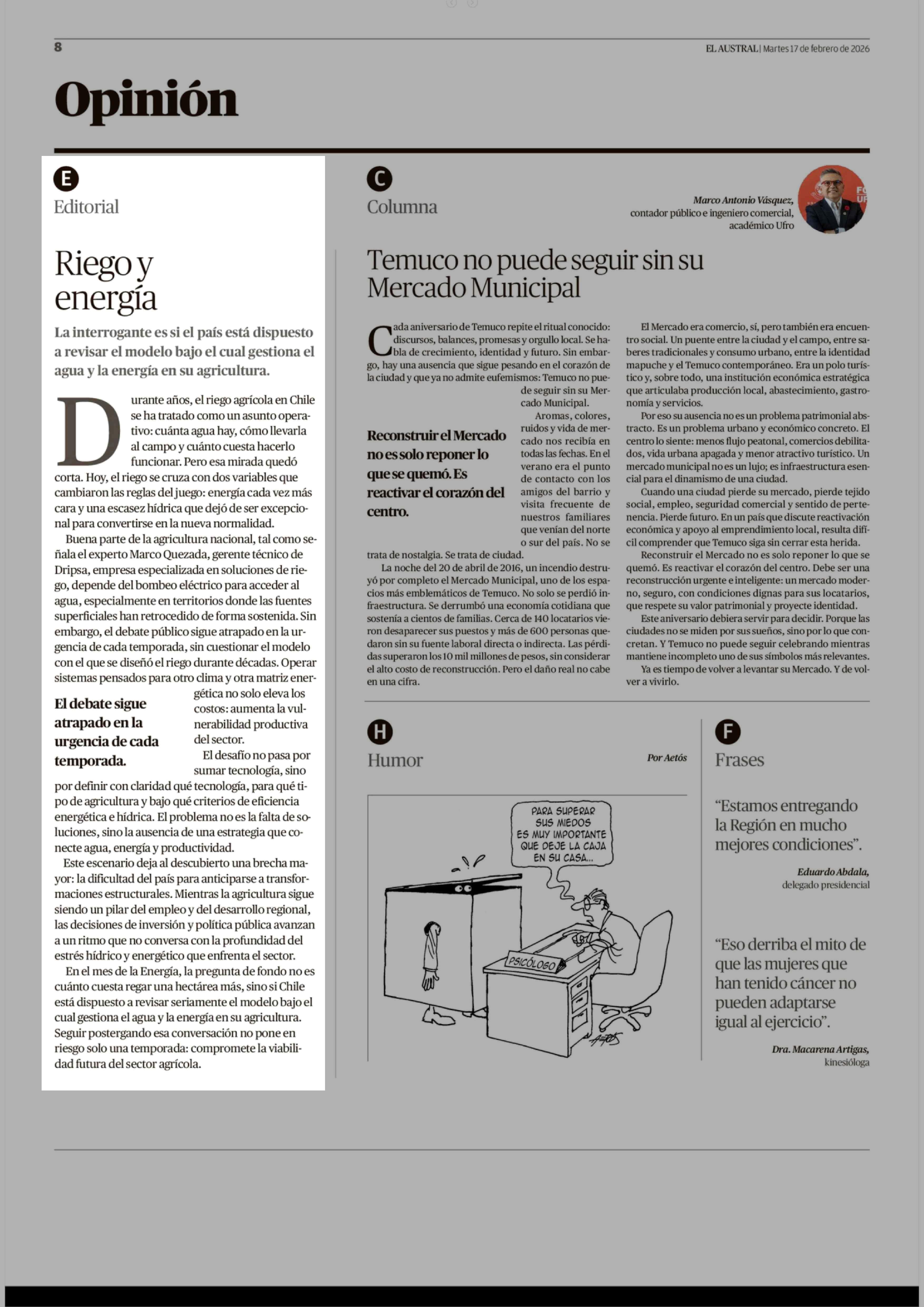 Editorial: Riego y energía 17-02-2026 El Austral de la Araucanía |