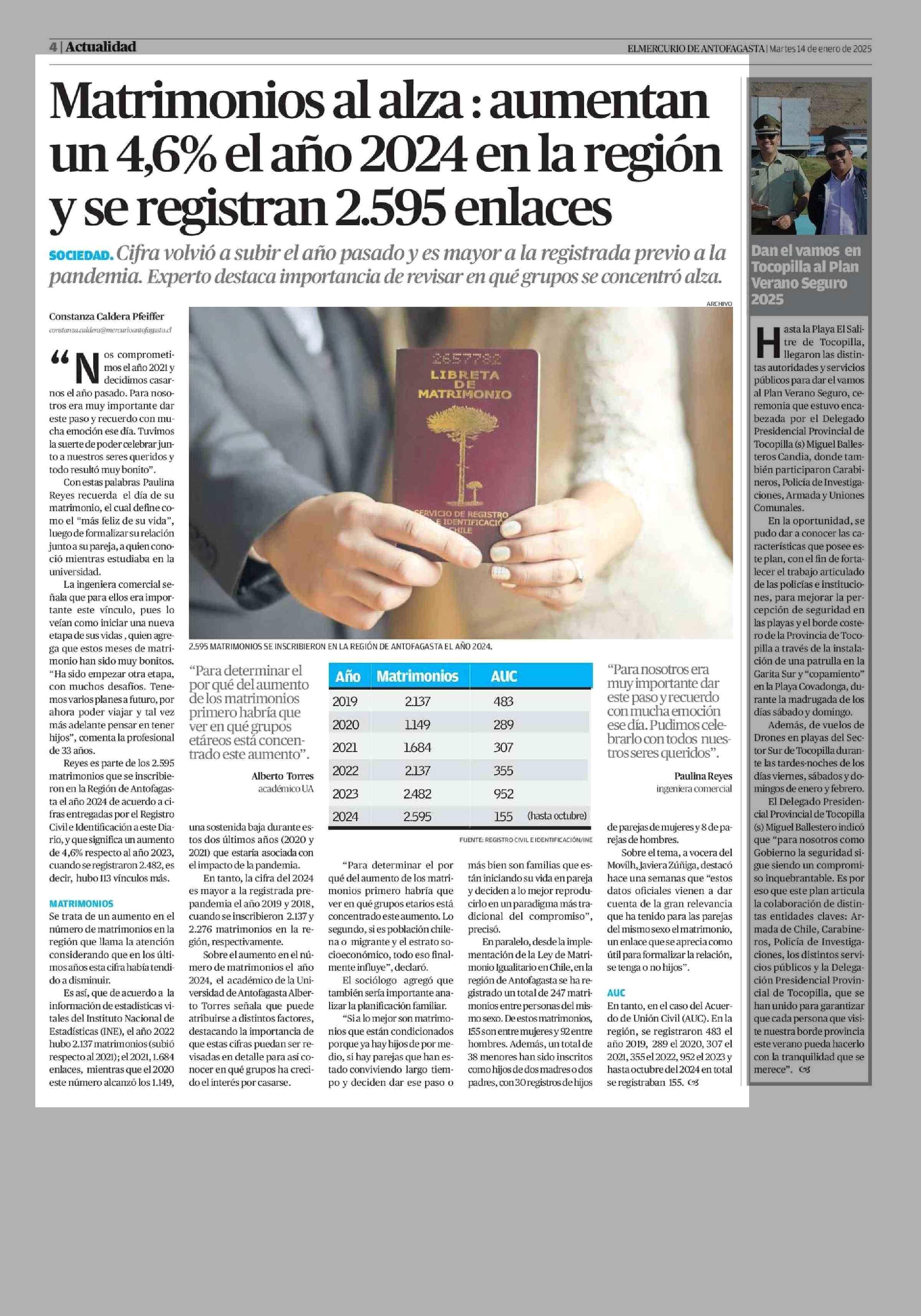 Matrimonios al alza : aumentan un 4,6% el año 2024 en la región y se registran 2.595 enlaces 14-01-2025 El Mercurio de Antofagasta |