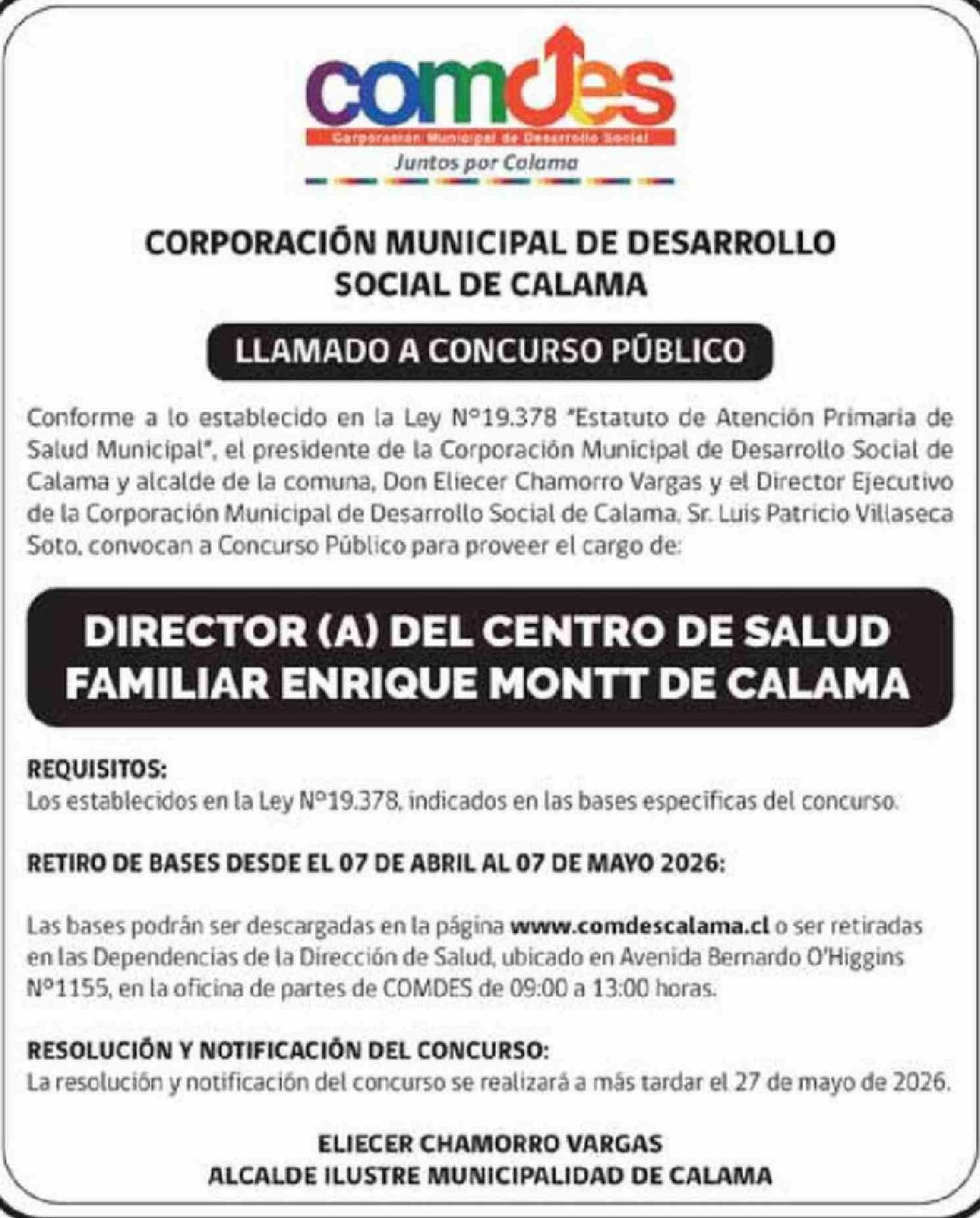 Título: CORPORACIÓN MUNICIPAL DE DESARROLLO SOCIAL DE CALAMA LLAMADO A CONCURSO PÚBLICO