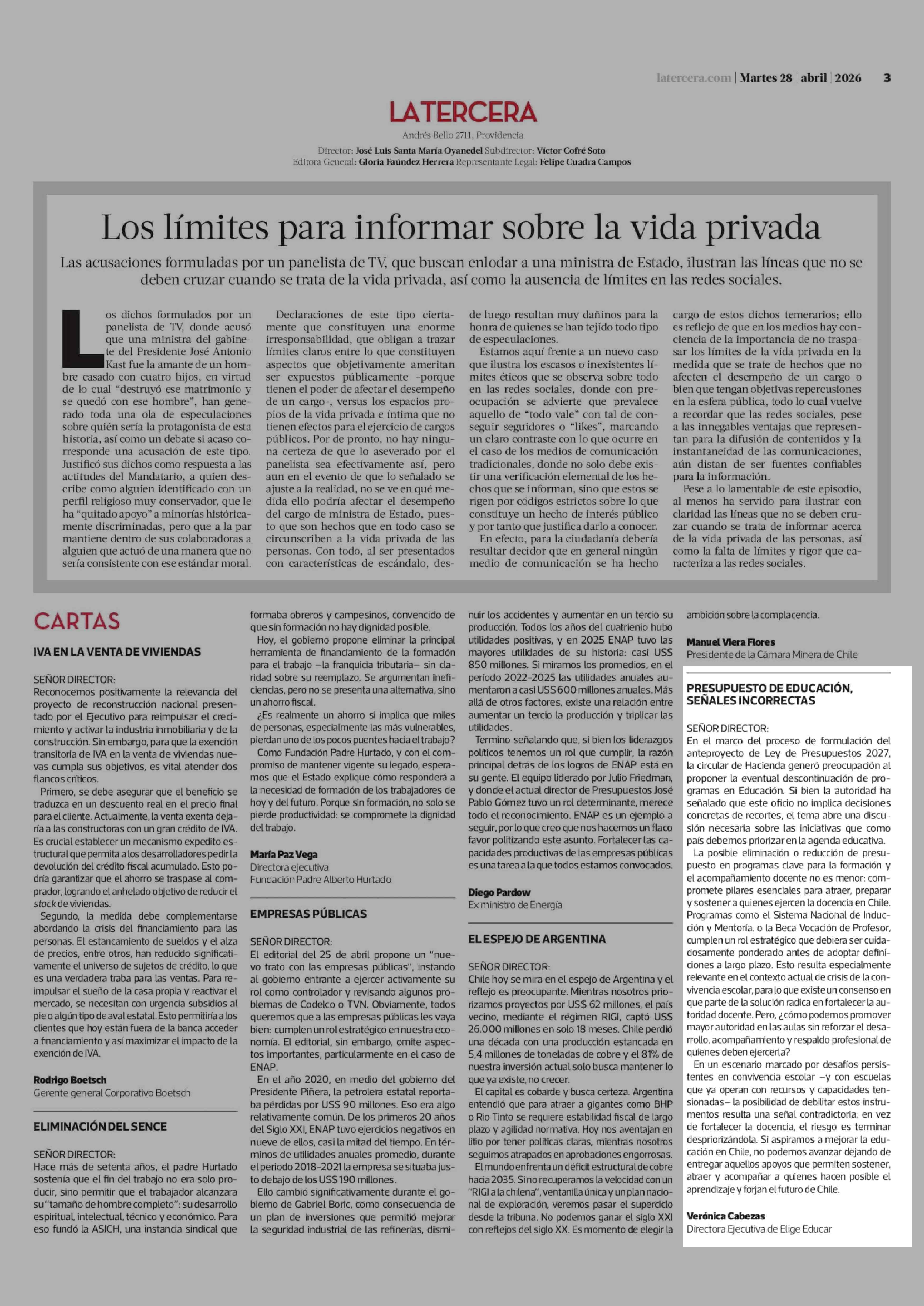 CARTAS: PRESUPUESTO DE EDUCACIÓN, SEÑALES INCORRECTAS 28-04-2026 La Tercera |