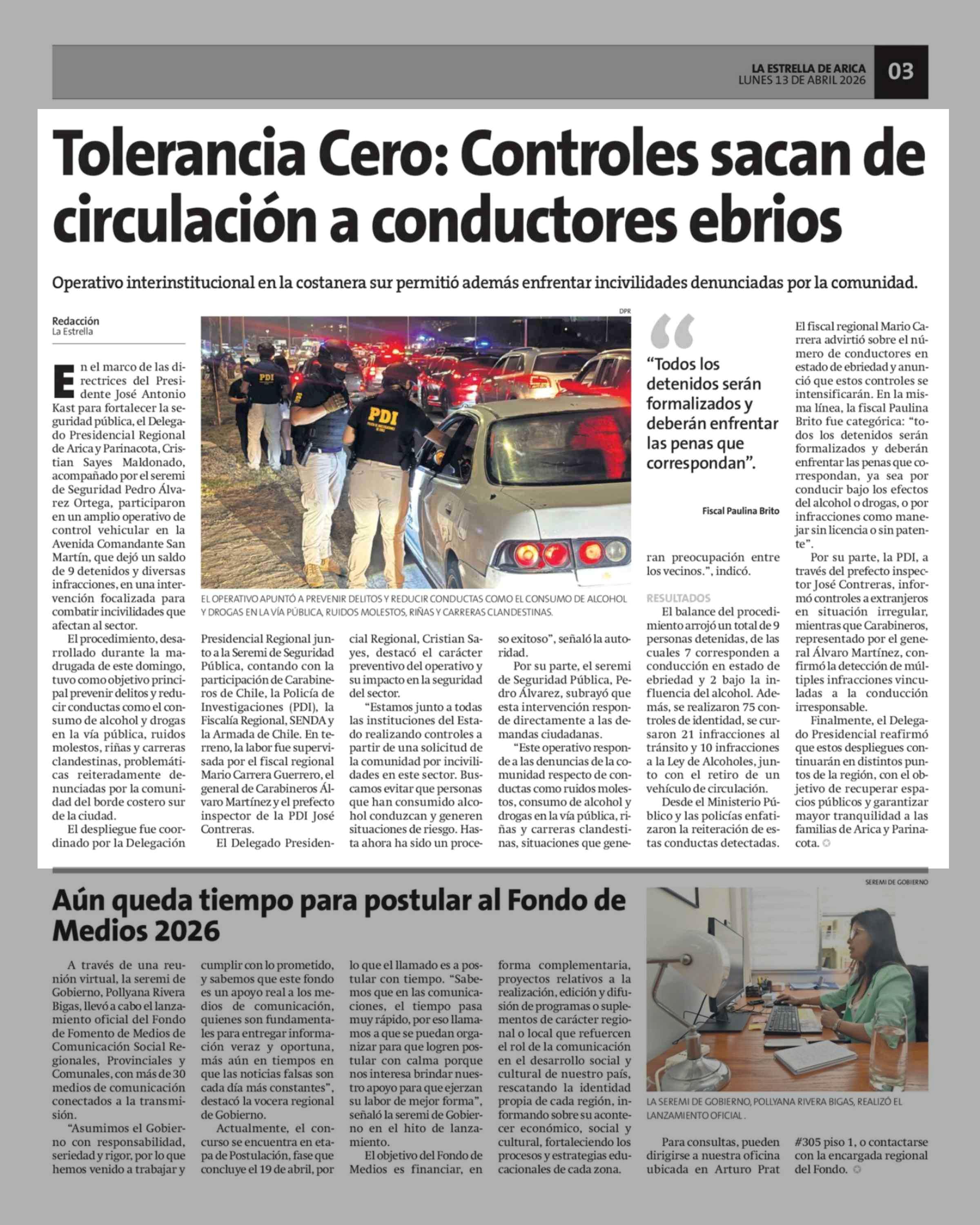 Tolerancia Cero: Controles sacan de circulación a conductores ebrios 13-04-2026 La Estrella de Arica |
