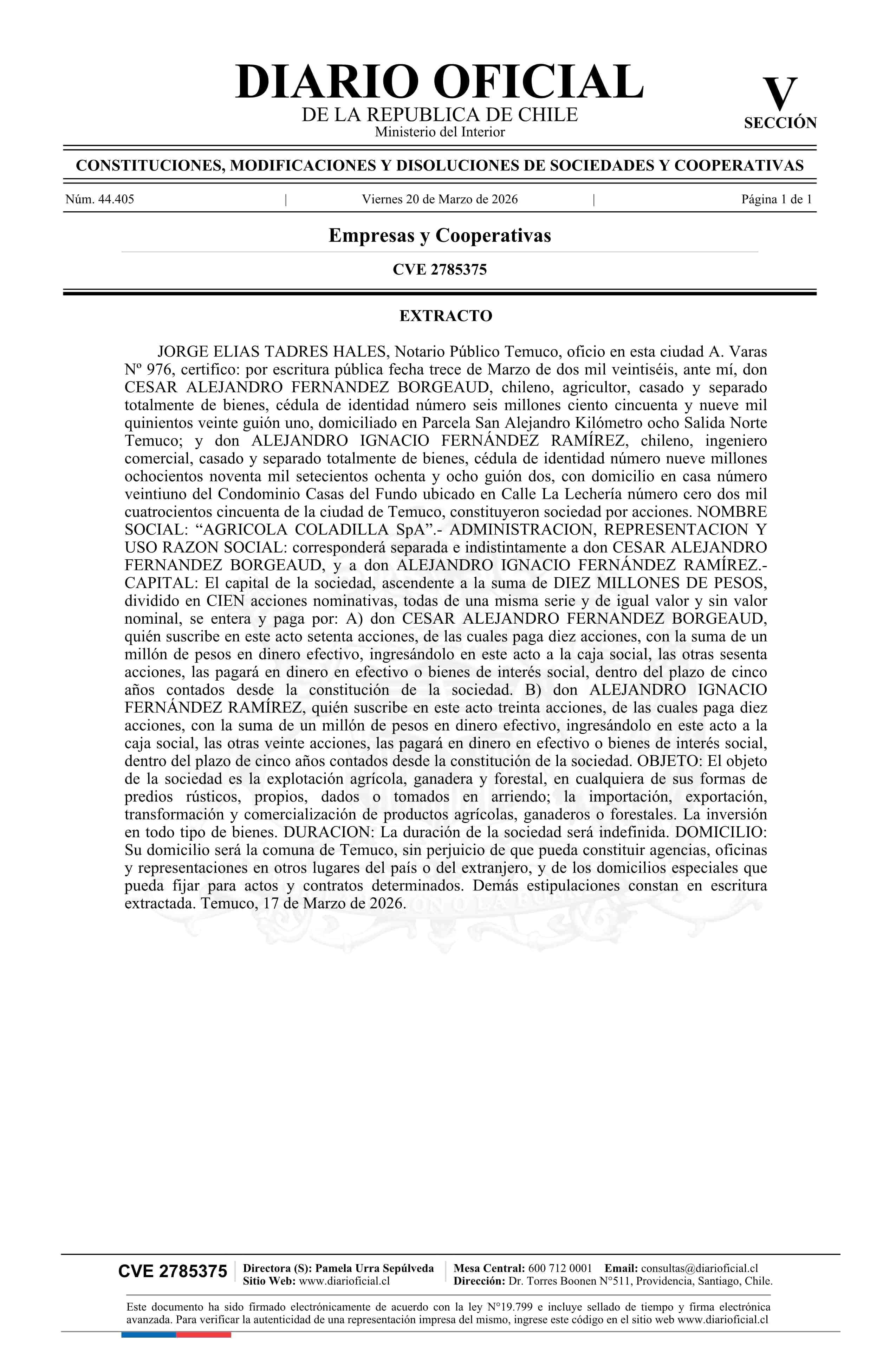 Agrícola Coladilla SpA 20-03-2026 Diario Oficial Edición Electrónica |