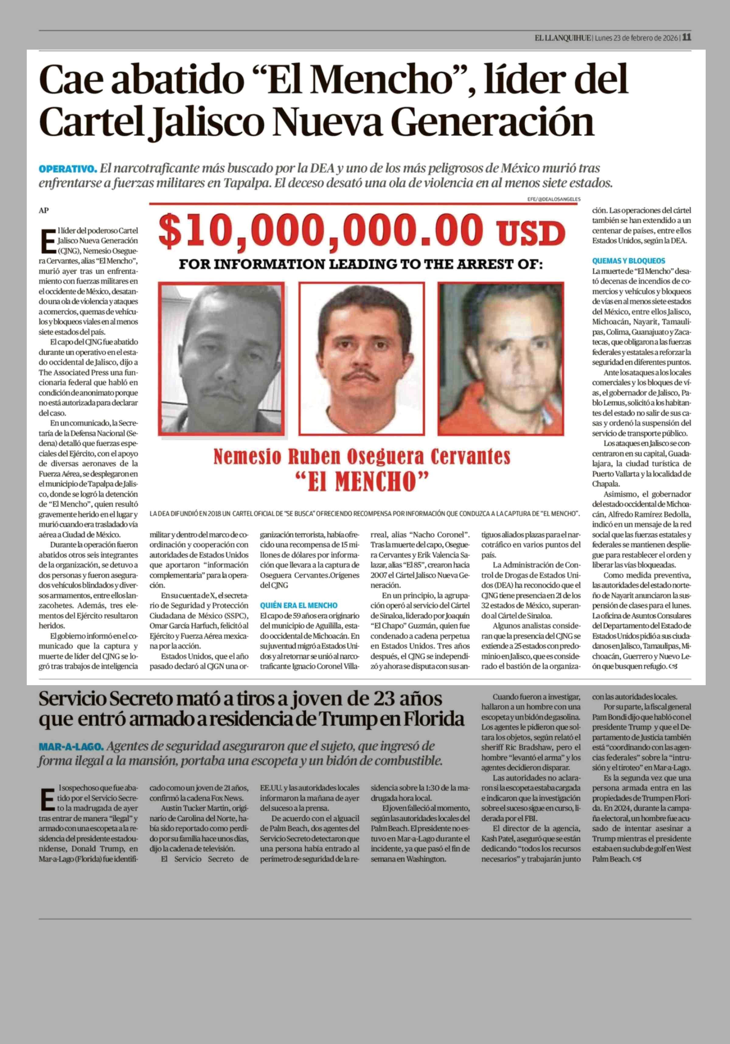 Cae abatido "El Mencho", líder del Cartel Jalisco Nueva Generación 23-02-2026 El Llanquihue |