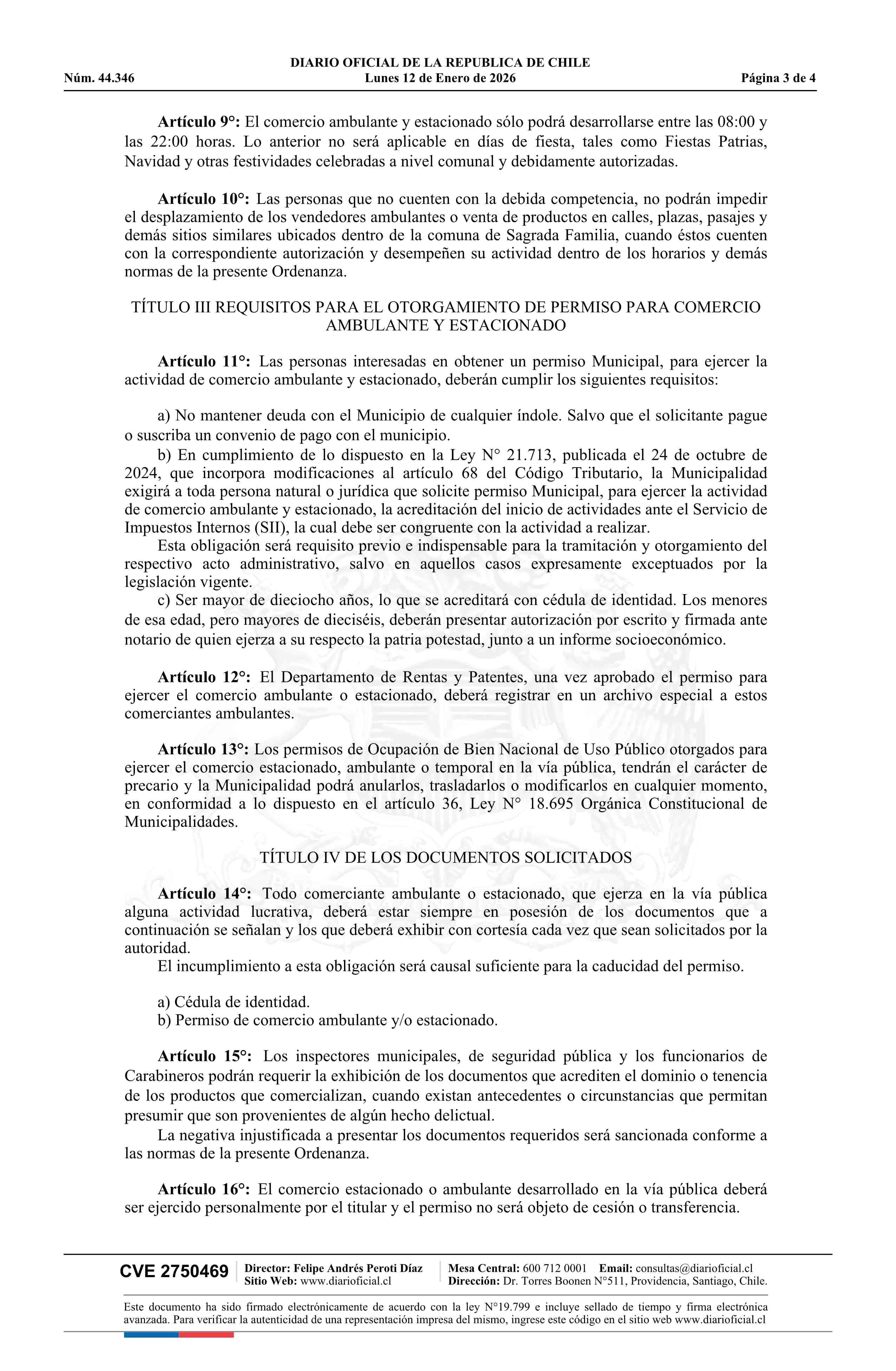 Decreto alcaldicio número 1.725, de 2025.- Aprueba modificación y dicta texto refundido, coordinado y sistematizado de Ordenanza municipal para regular el comercio ambulante y estacionado 12-01-2026 DIARIO OFICIAL CHILE - BOLETÍN OFICIAL DE MINERÍA |