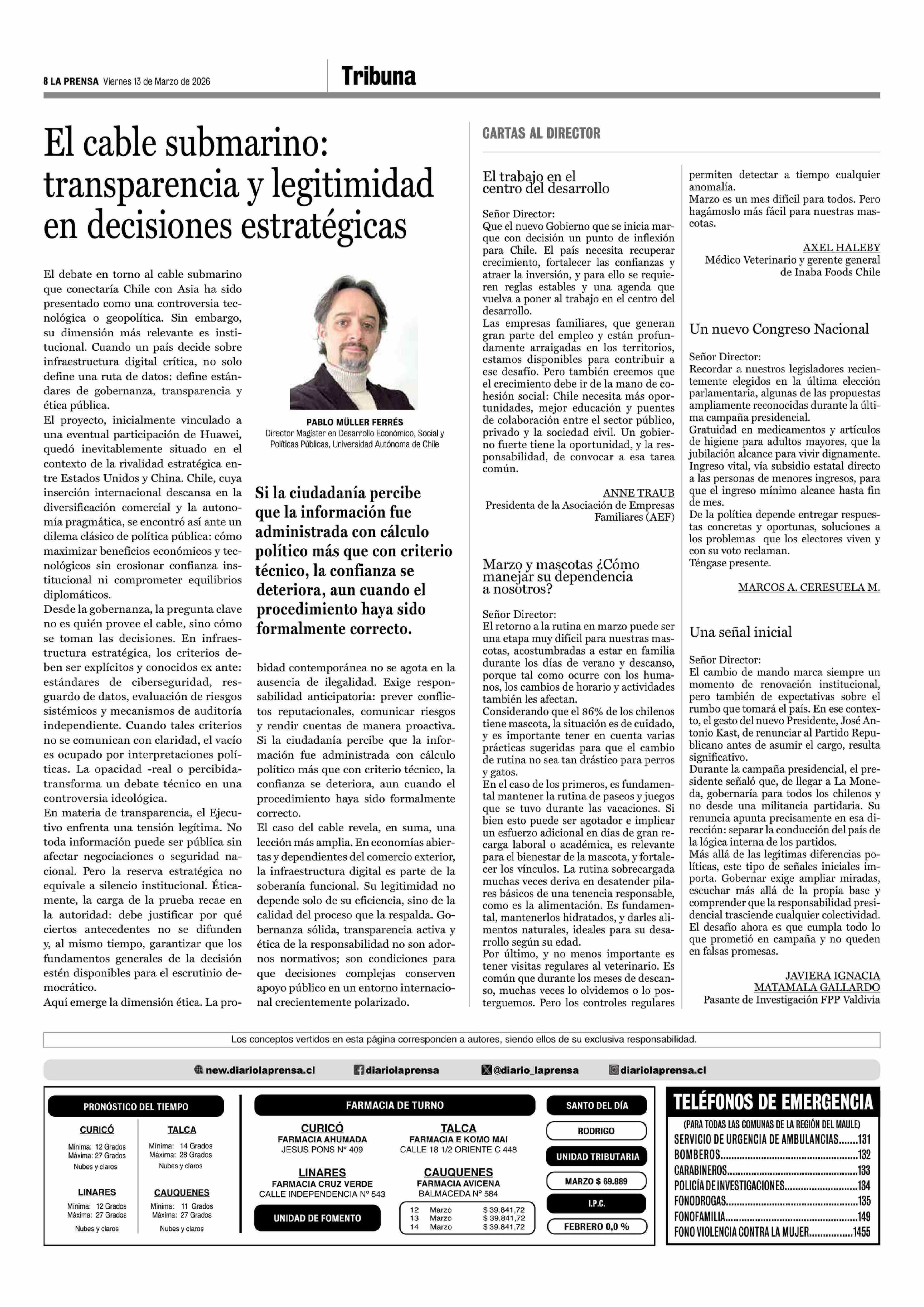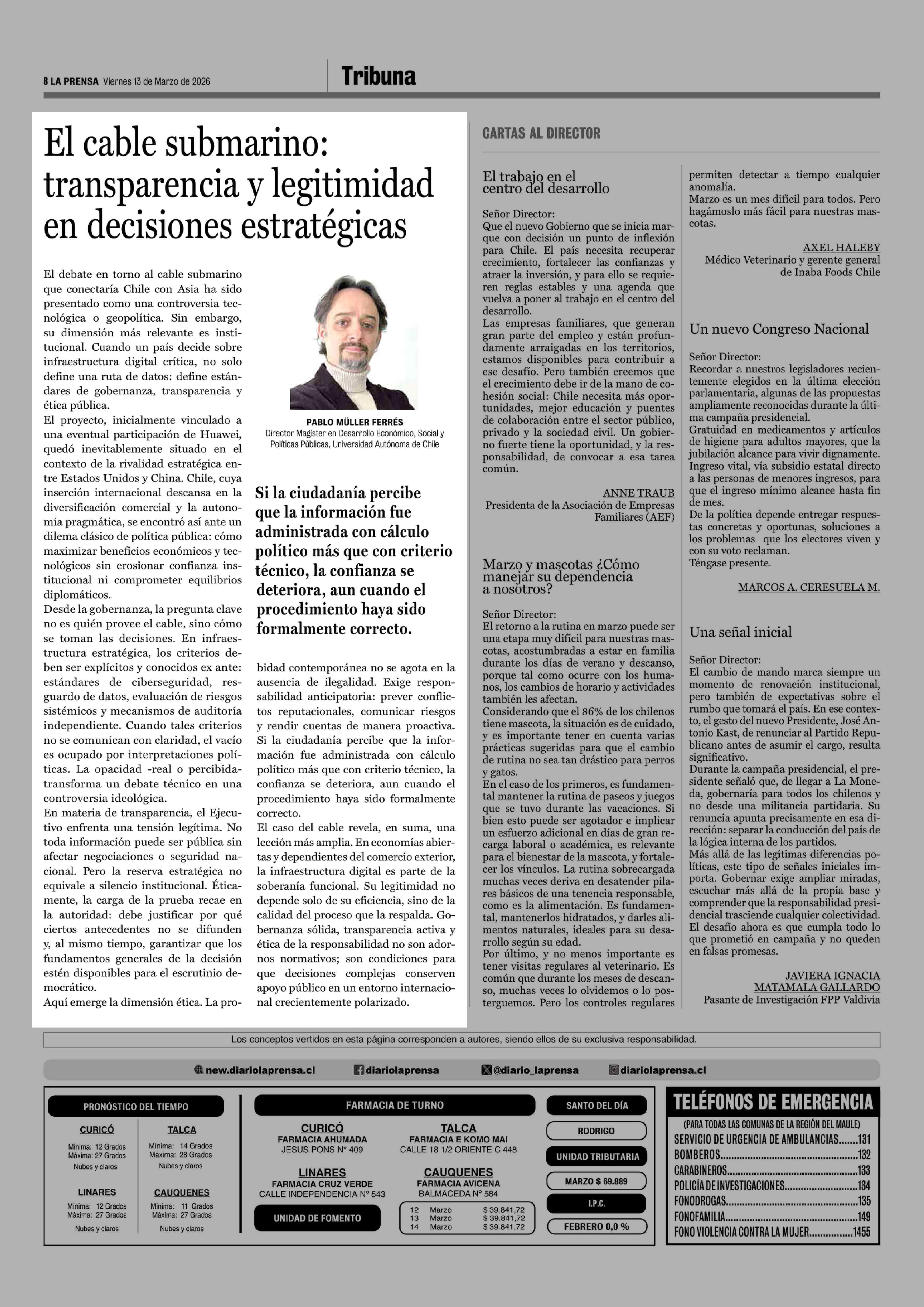 Columnas de Opinión: El cable submarino: transparencia y legitimidad en decisiones estratégicas 13-03-2026 La Prensa de Curicó |