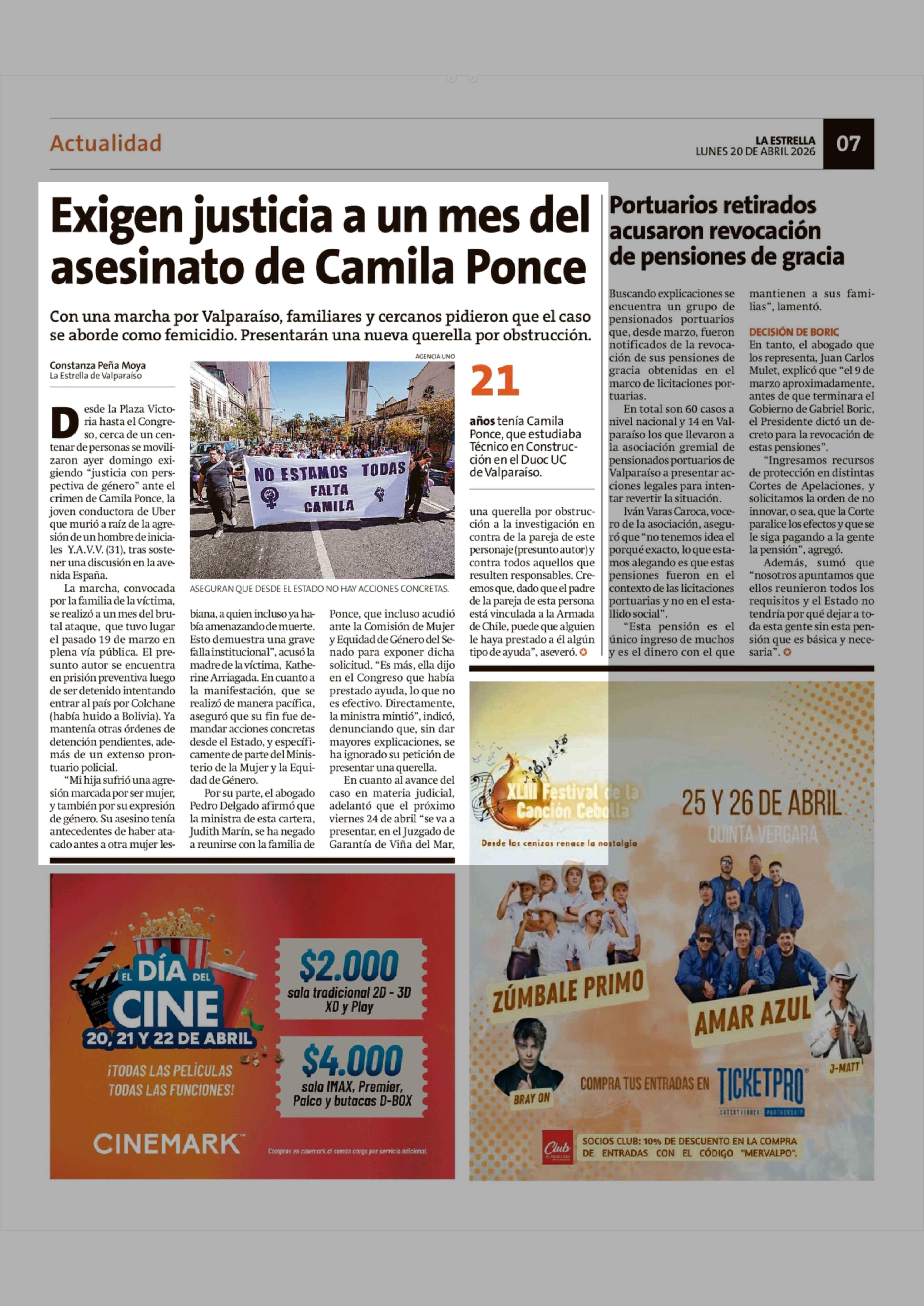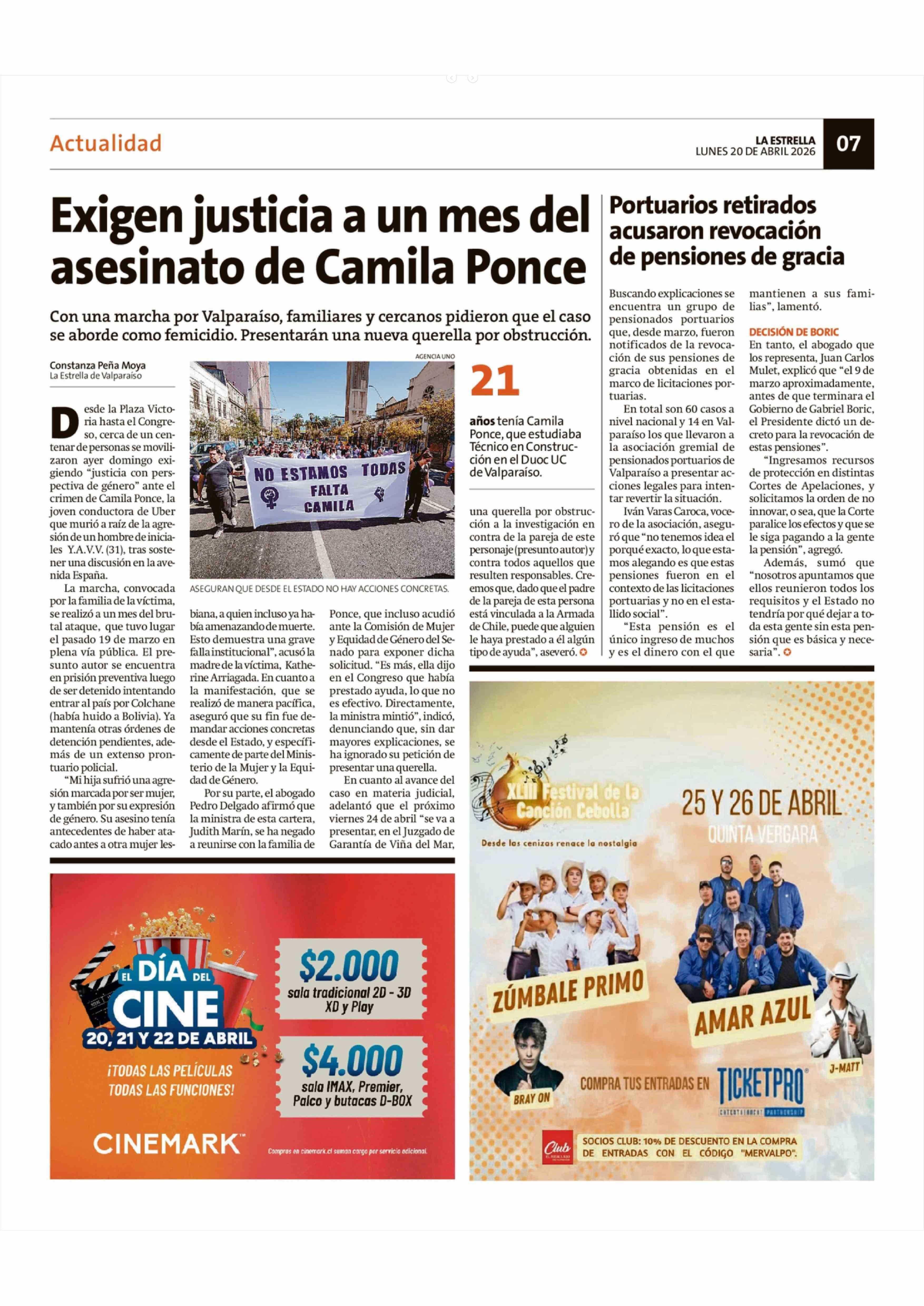 Exigen justicia a un mes del asesinato de Camila Ponce 20-04-2026 La Estrella de Valparaíso |