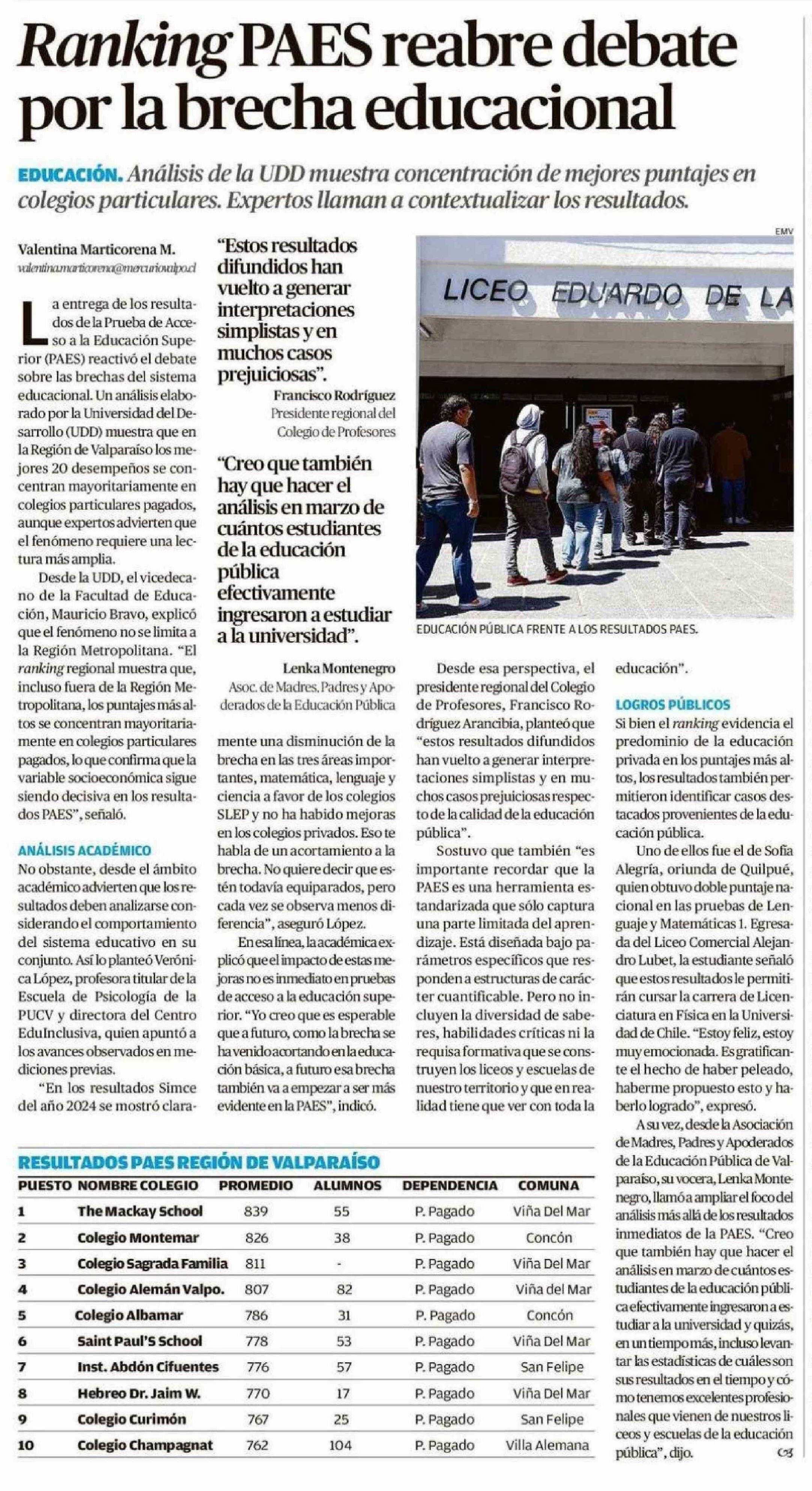 Ranking PAES reabre debate por la brecha educacional 07-01-2026 El Mercurio de Valparaíso |