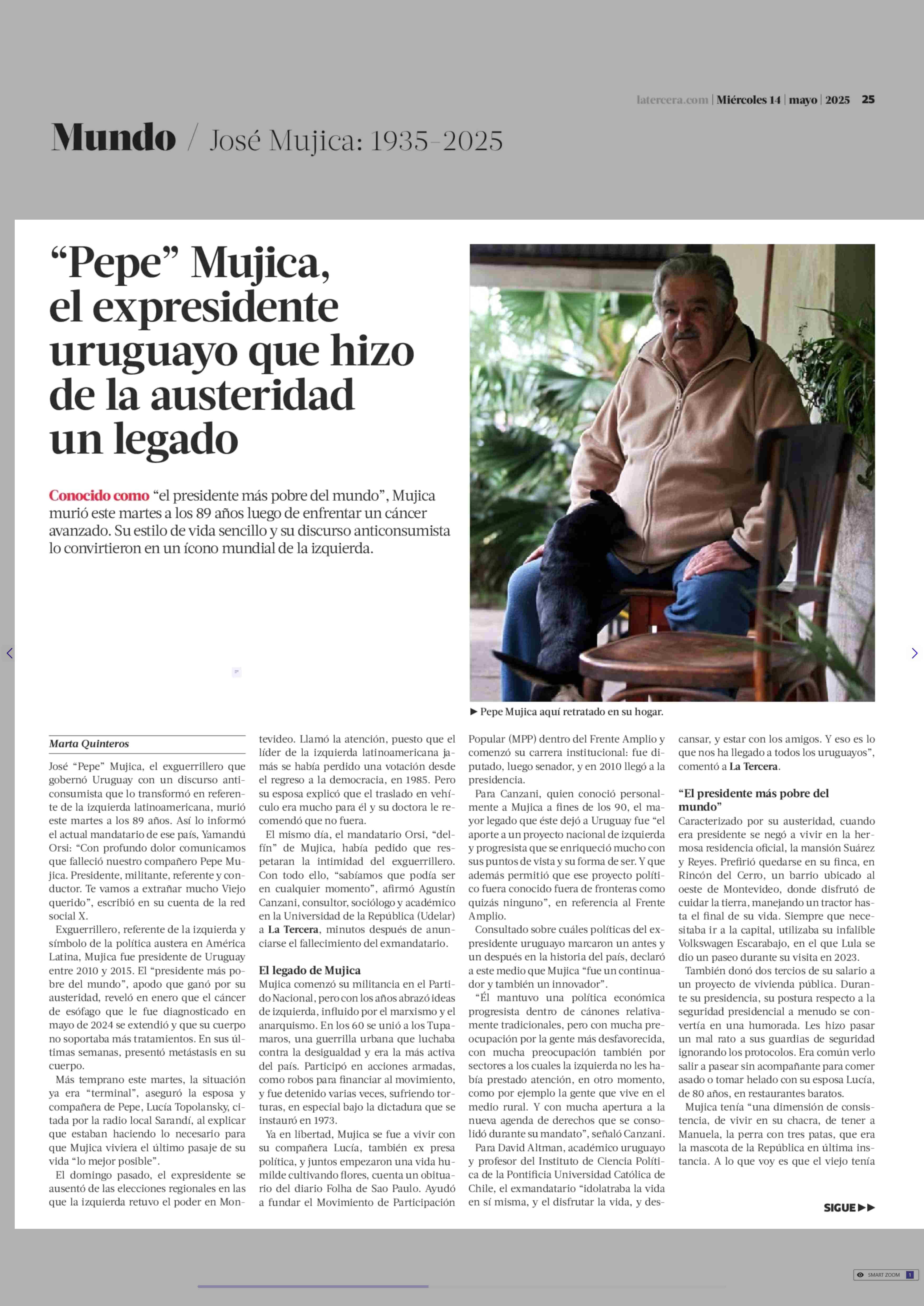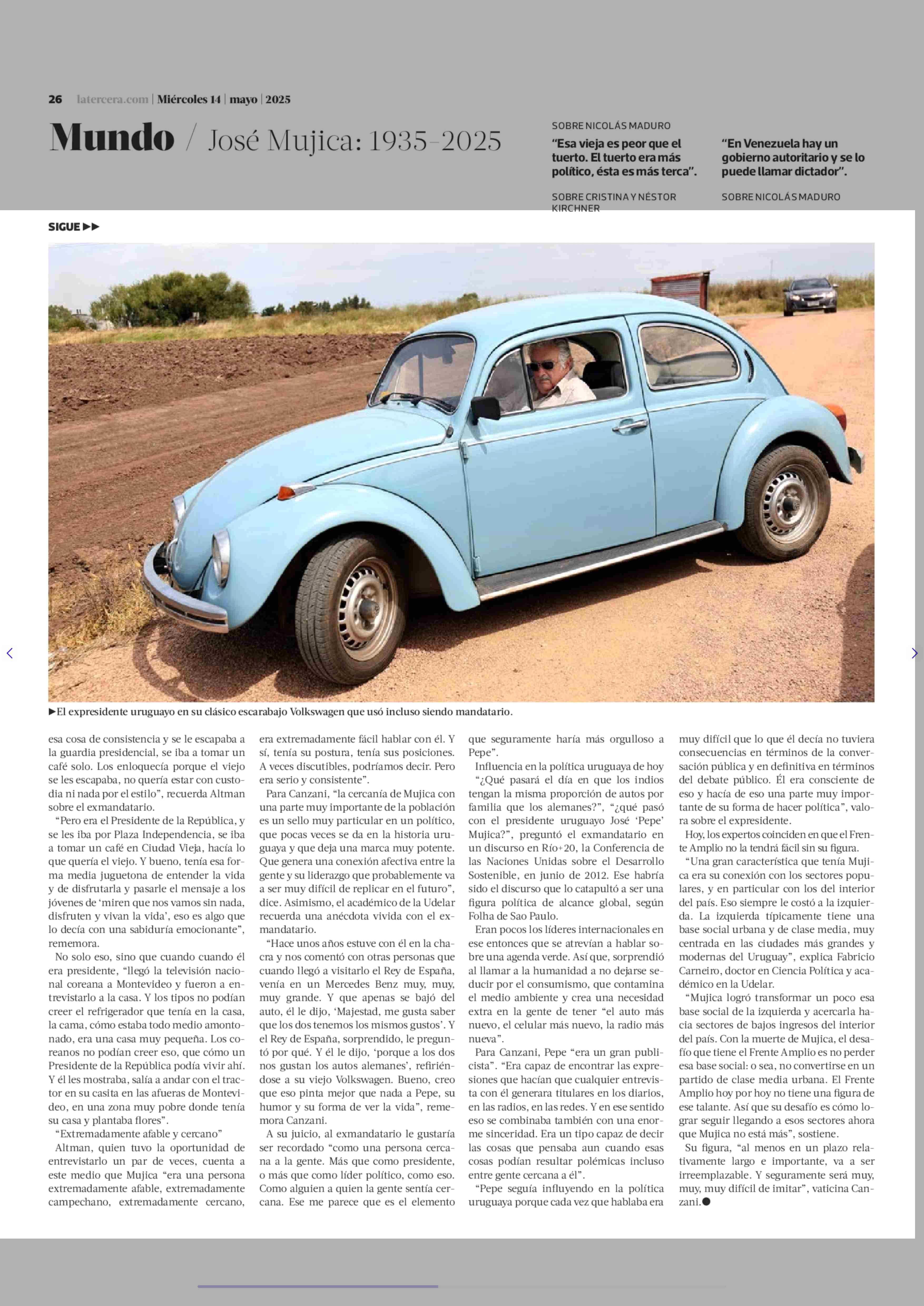 “Pepe” Mujica, el expresidente uruguayo que hizo de la austeridad un legado 14-05-2025 La Tercera |